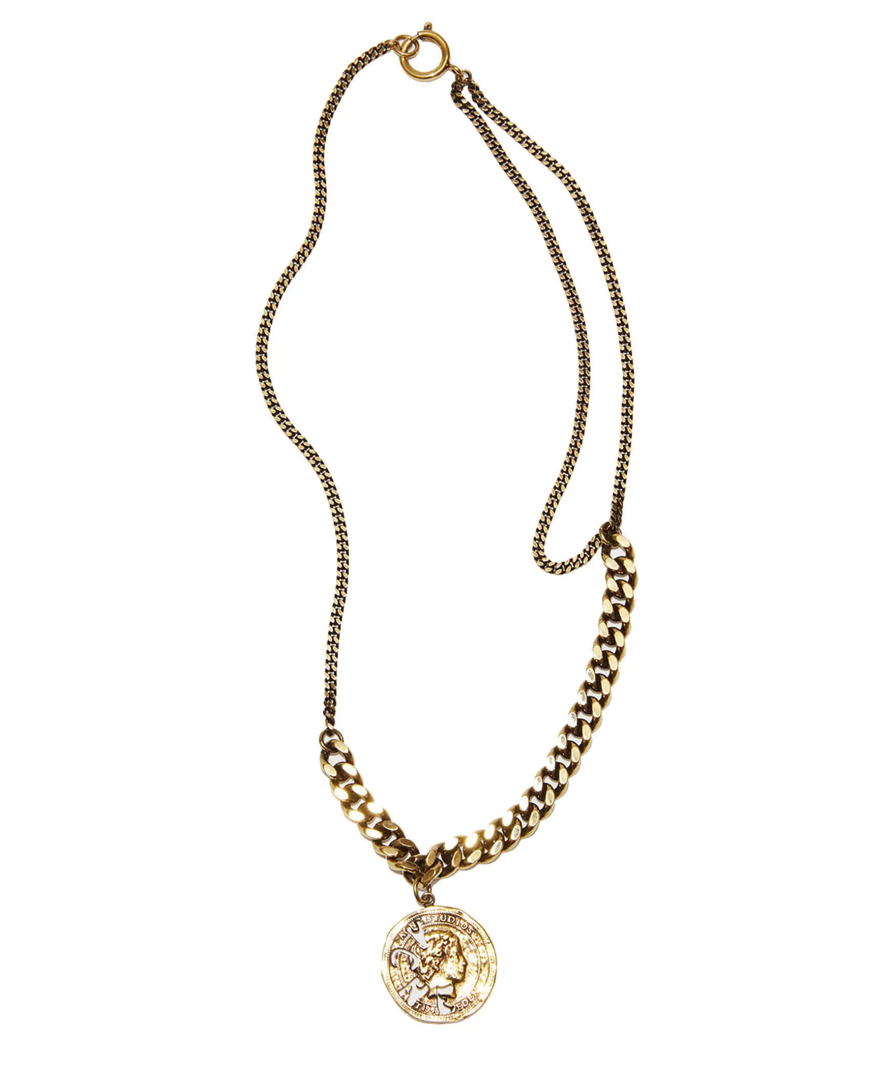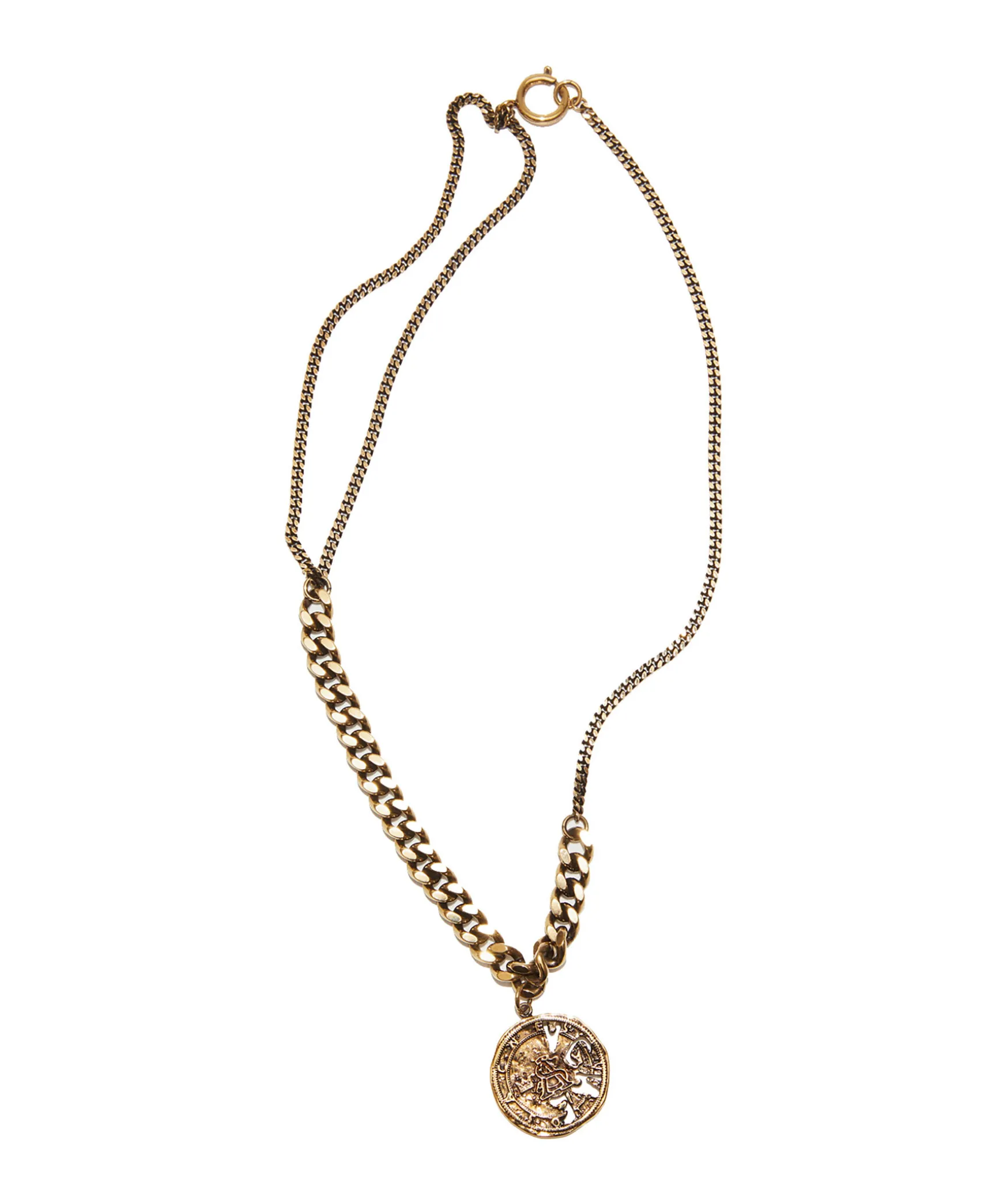 Guldfargat Halsband Med Mynt Med Utstansad Logotyp. Grovre Kedja Framtill. Tillverkad I Brass.