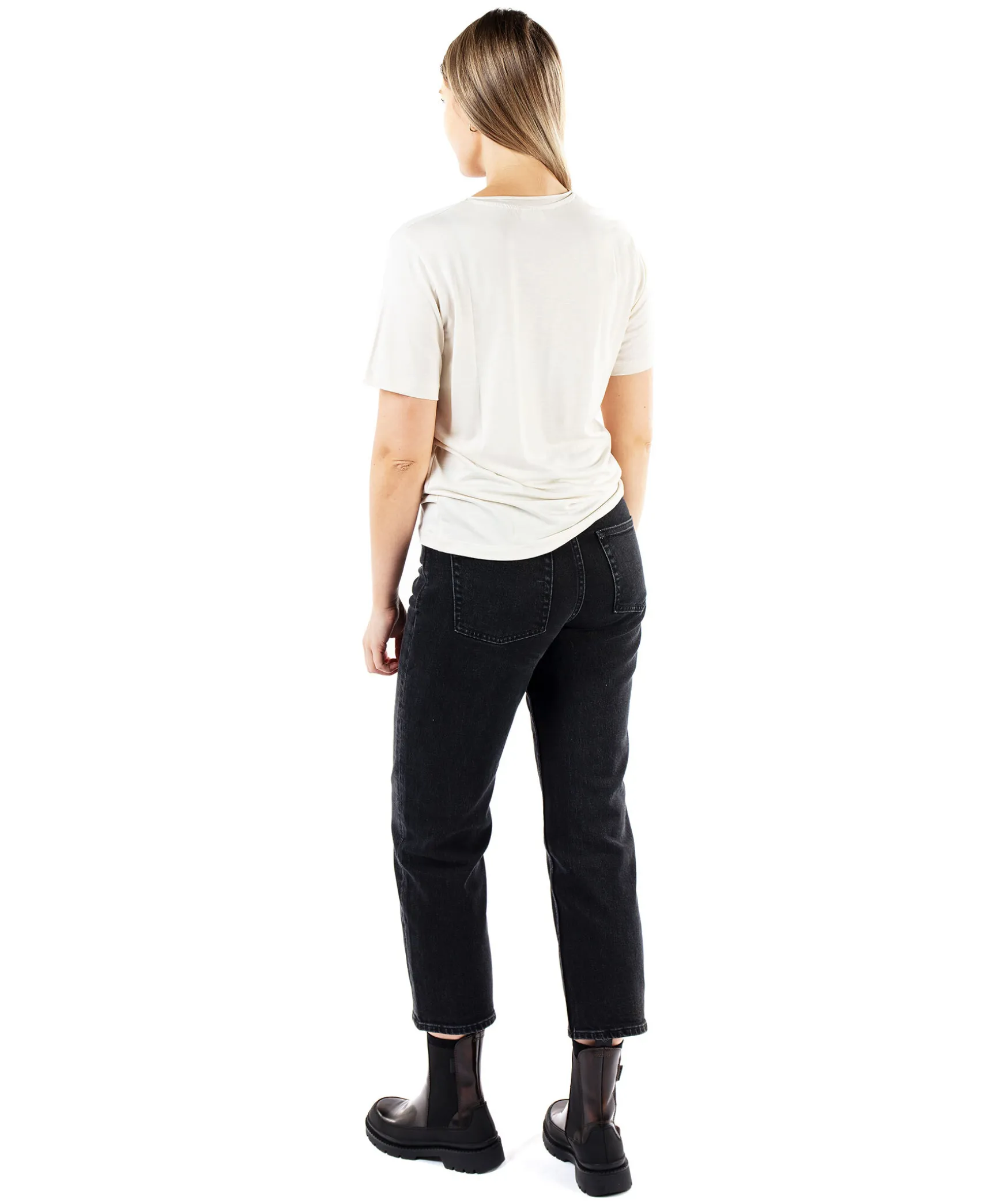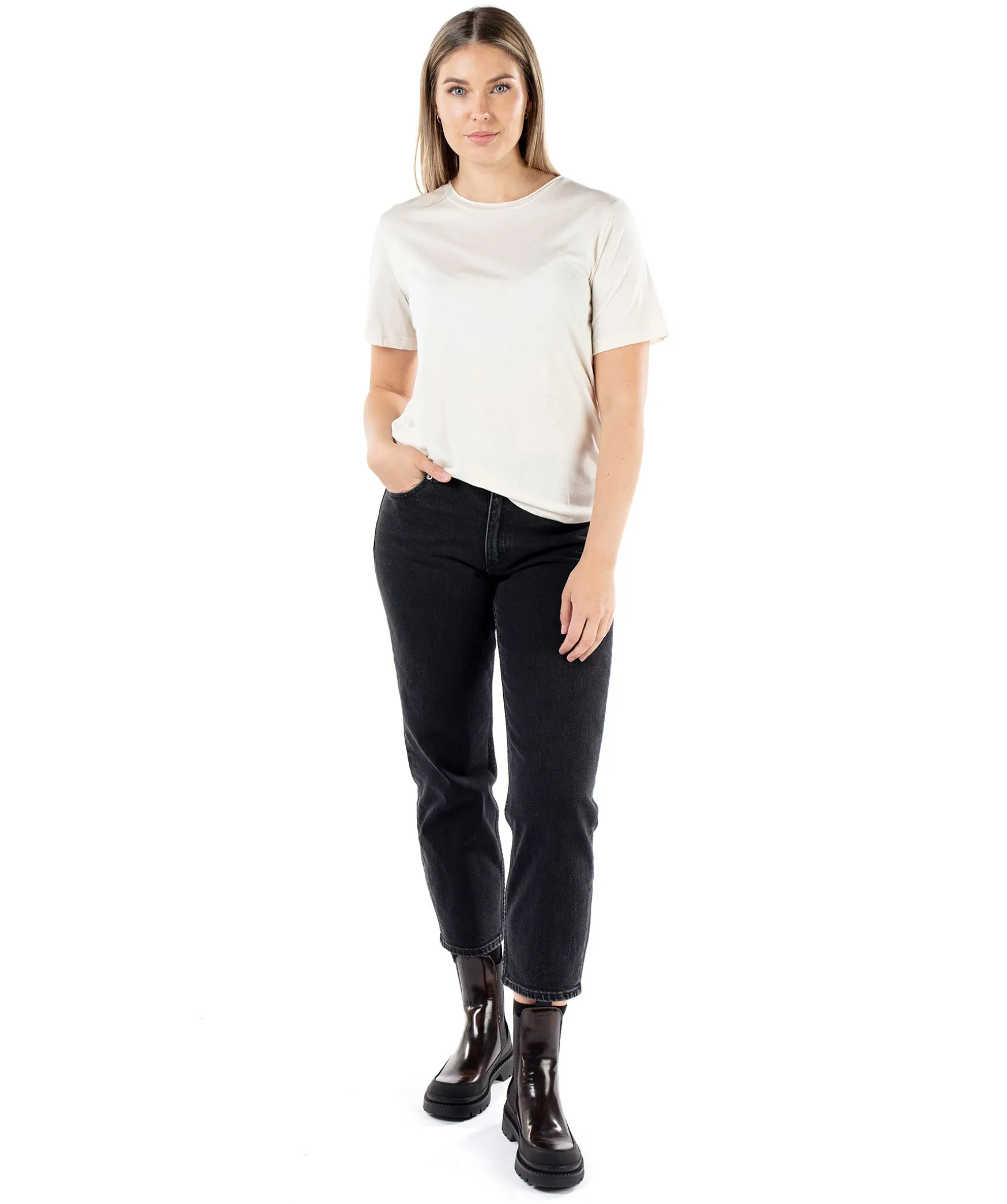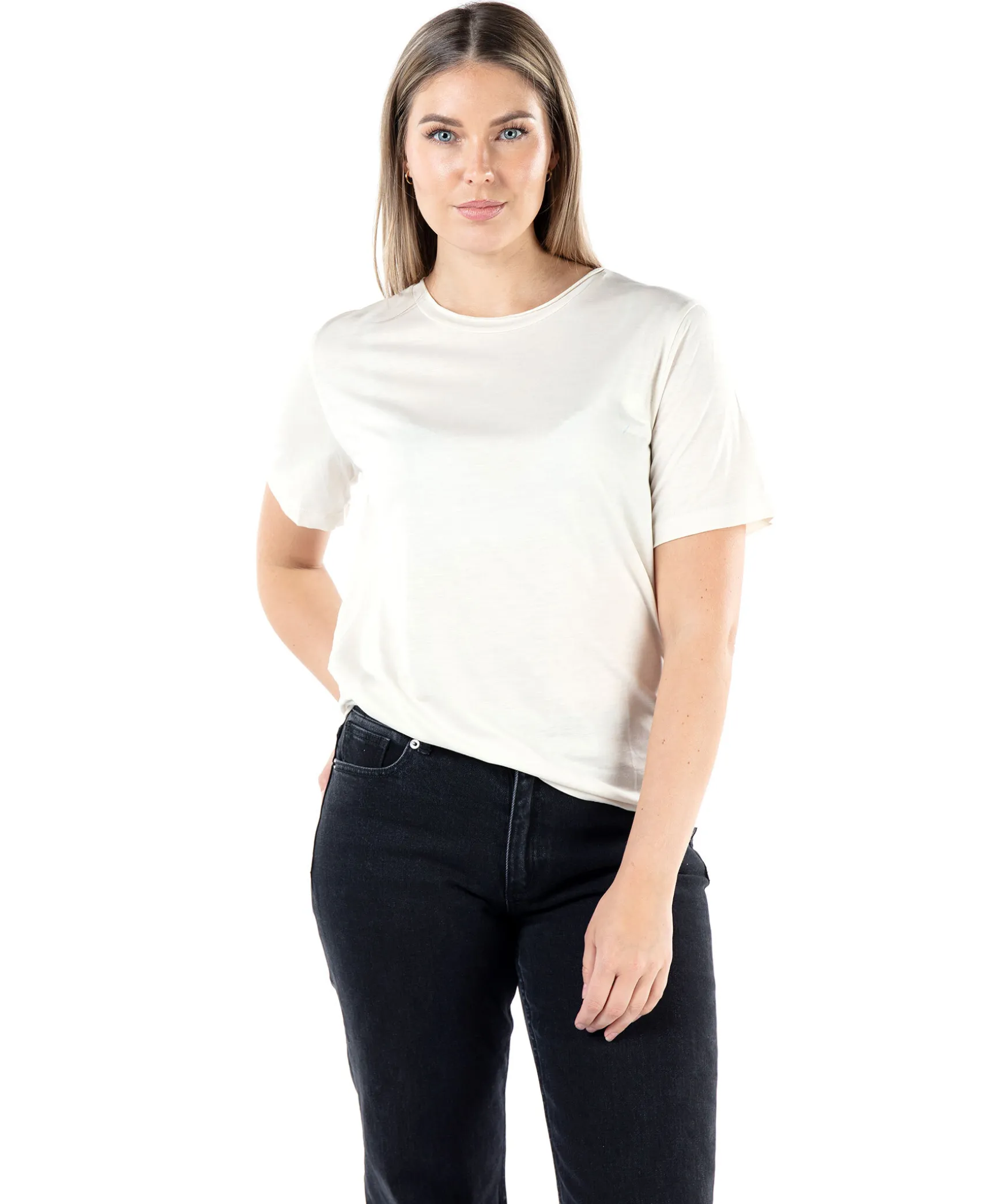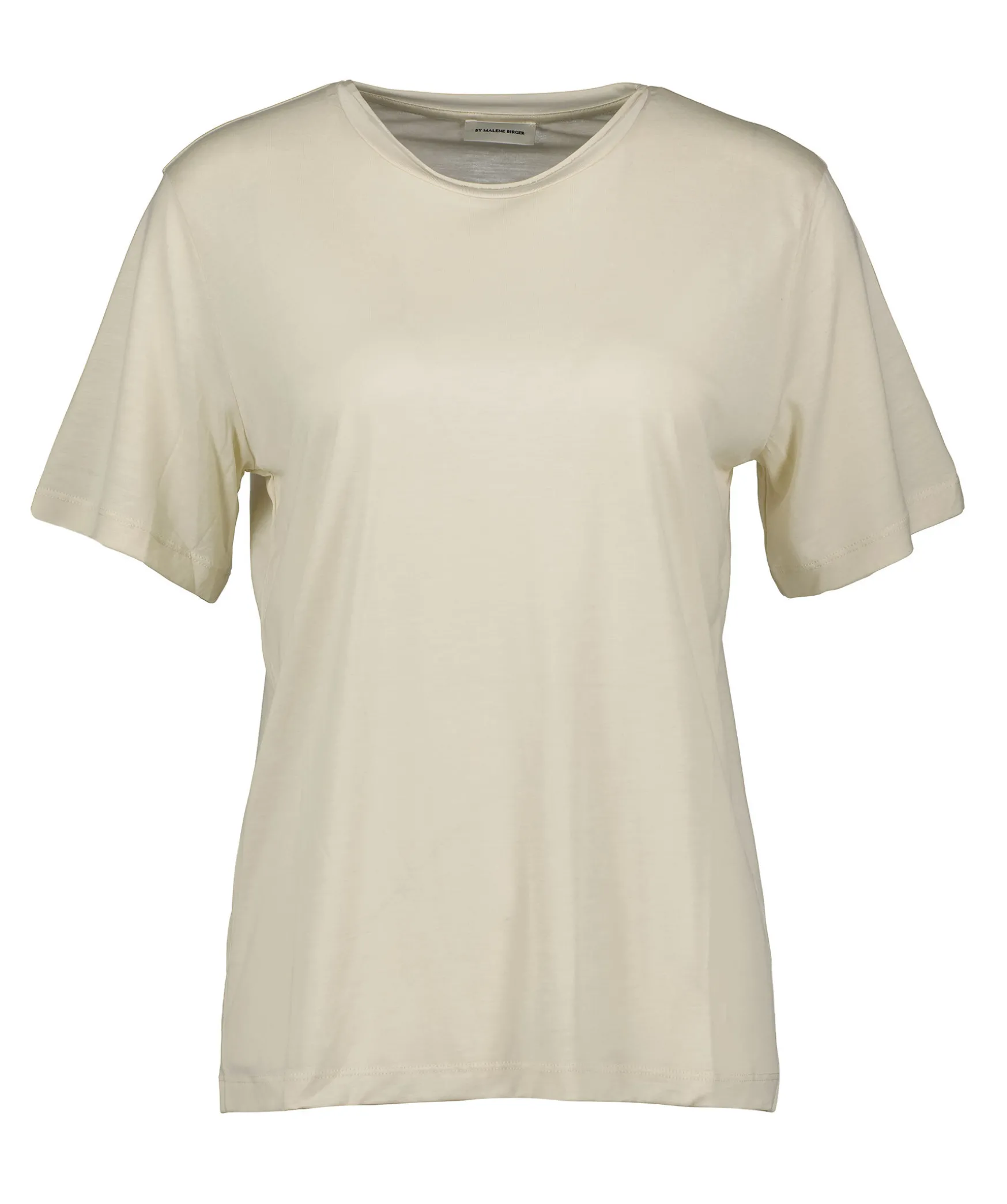 Benvit T-Shirt Fran By Malene Birger. Rundad Halsringning. Tillverkad I 100% Lyocell. Modellen Ar 175 Cm Lang Och Har Pa Sig Storlek S.