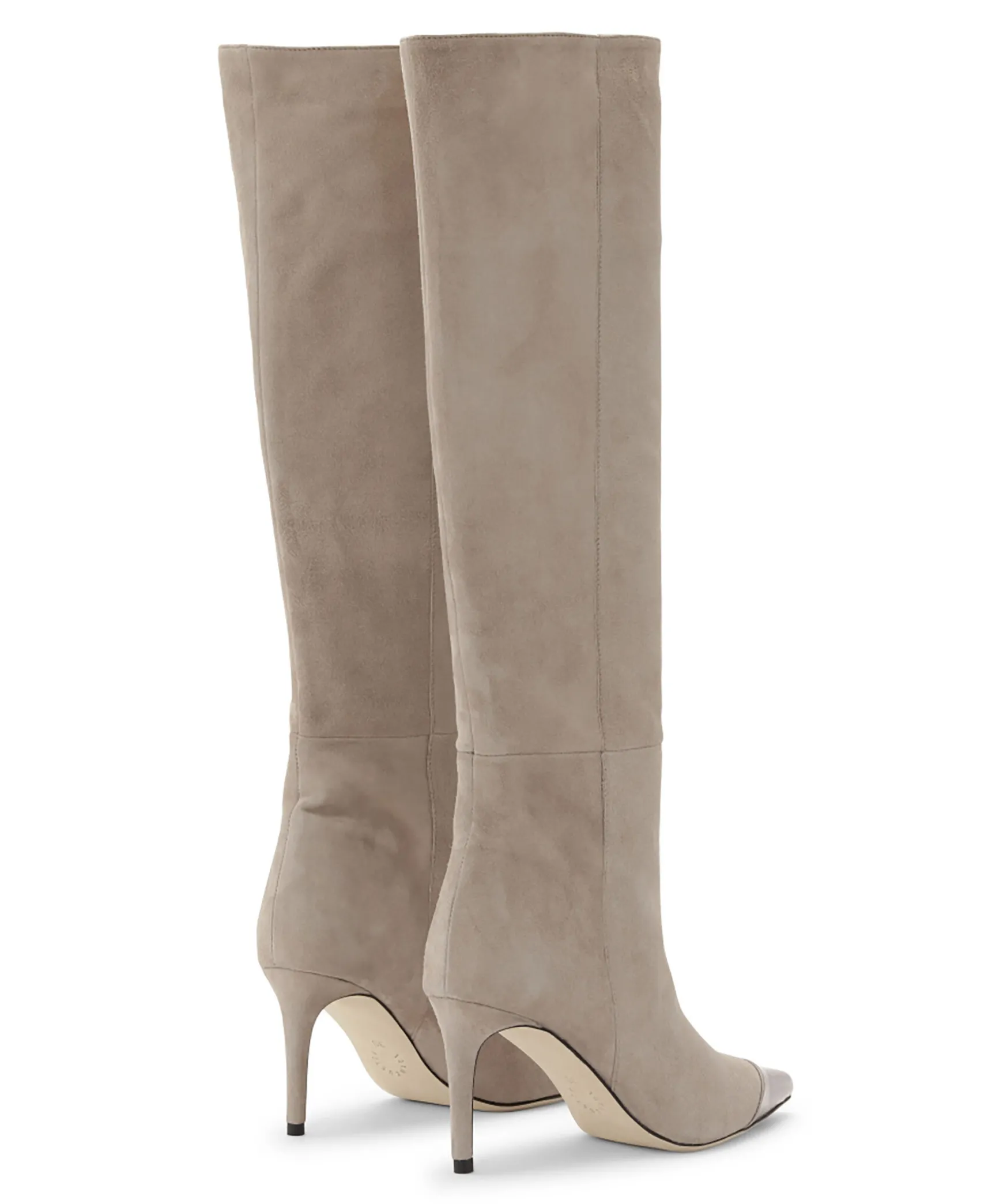 Ljusbeige, Hog Stovel I Mocka Fran Custommade. Spetsig Ta Med Lack Och Dras Pa Foten. Slutar Strax Nedanfor Knat Och Har En Smal Klack Med Hojden 8,5 Cm.