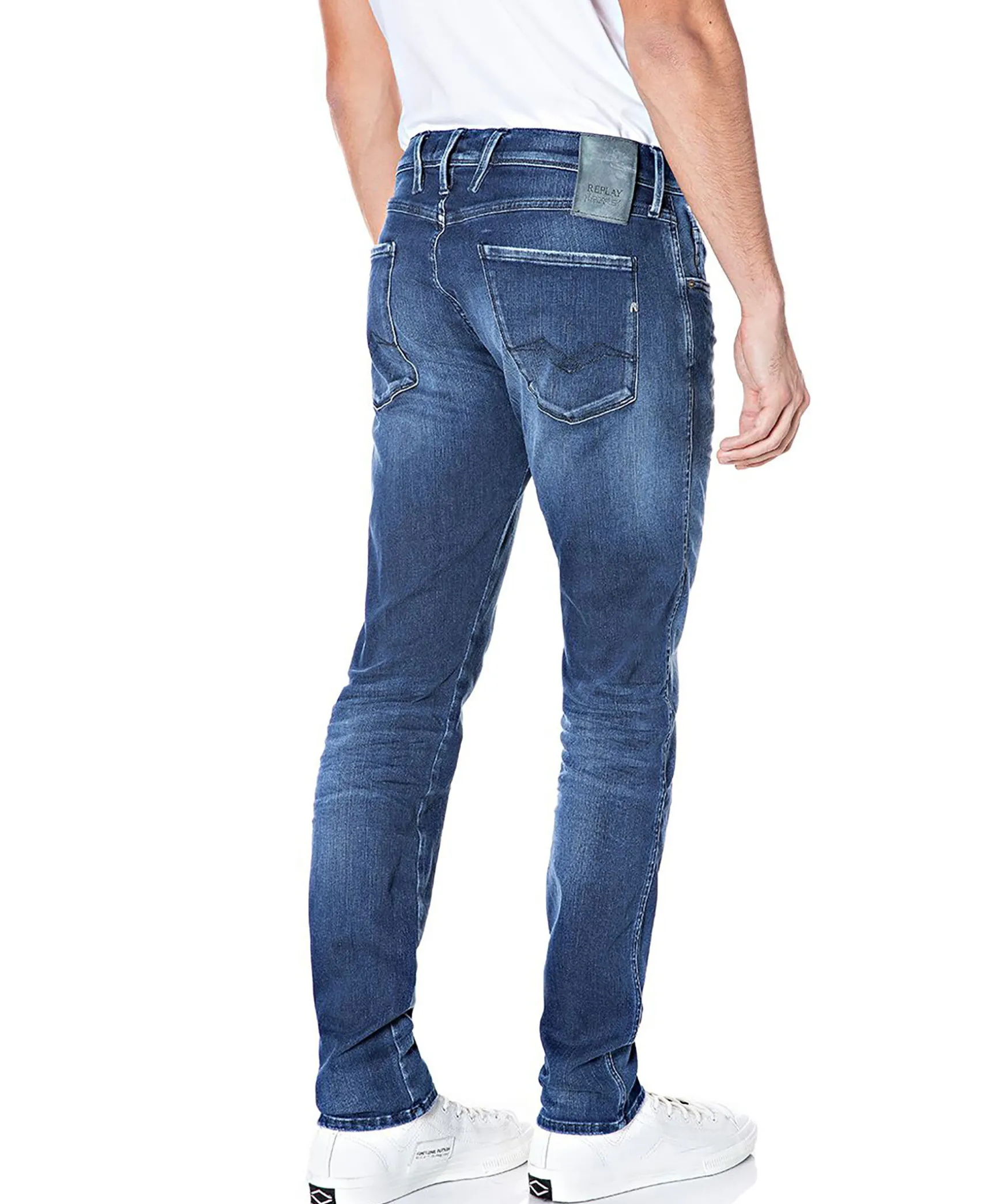 Mellanblaa Jeans Fran Replay I Slim Fit Modell Och Normalhog Midja. Stangs Med Knapp Och Dragkedja I Gylfen Och Har Hallor For Balte I Midjan. Femficksmodell Och Har En Sliten Look