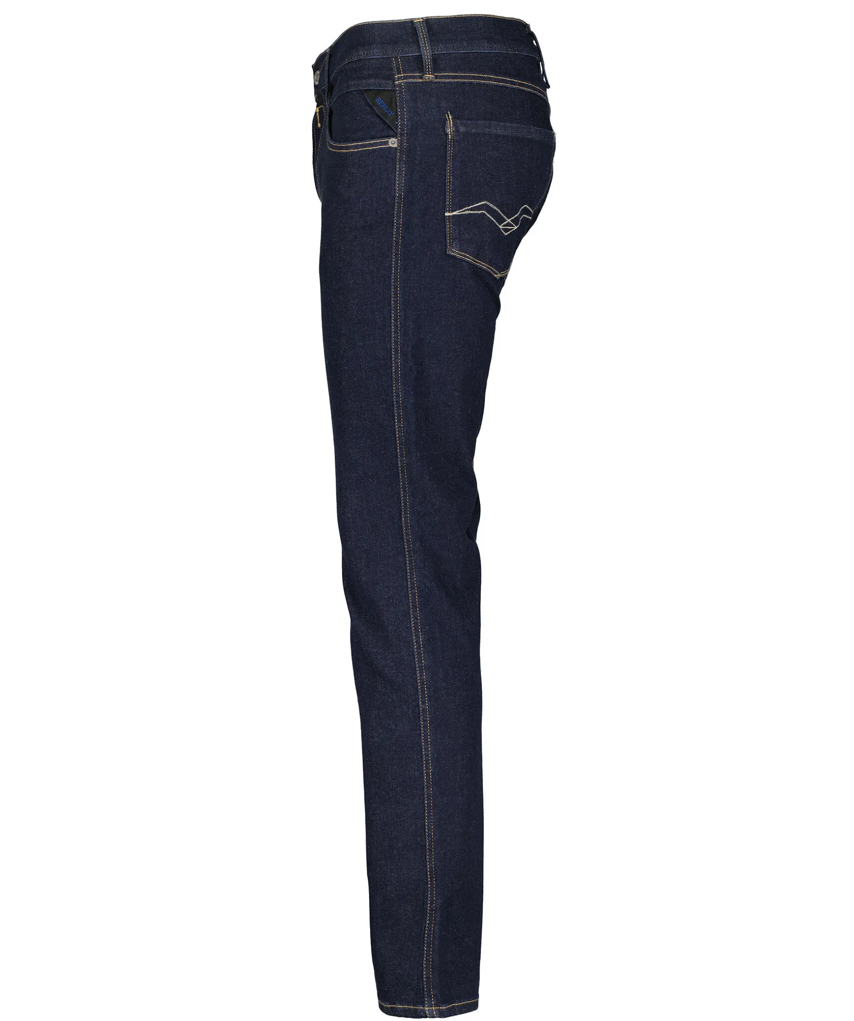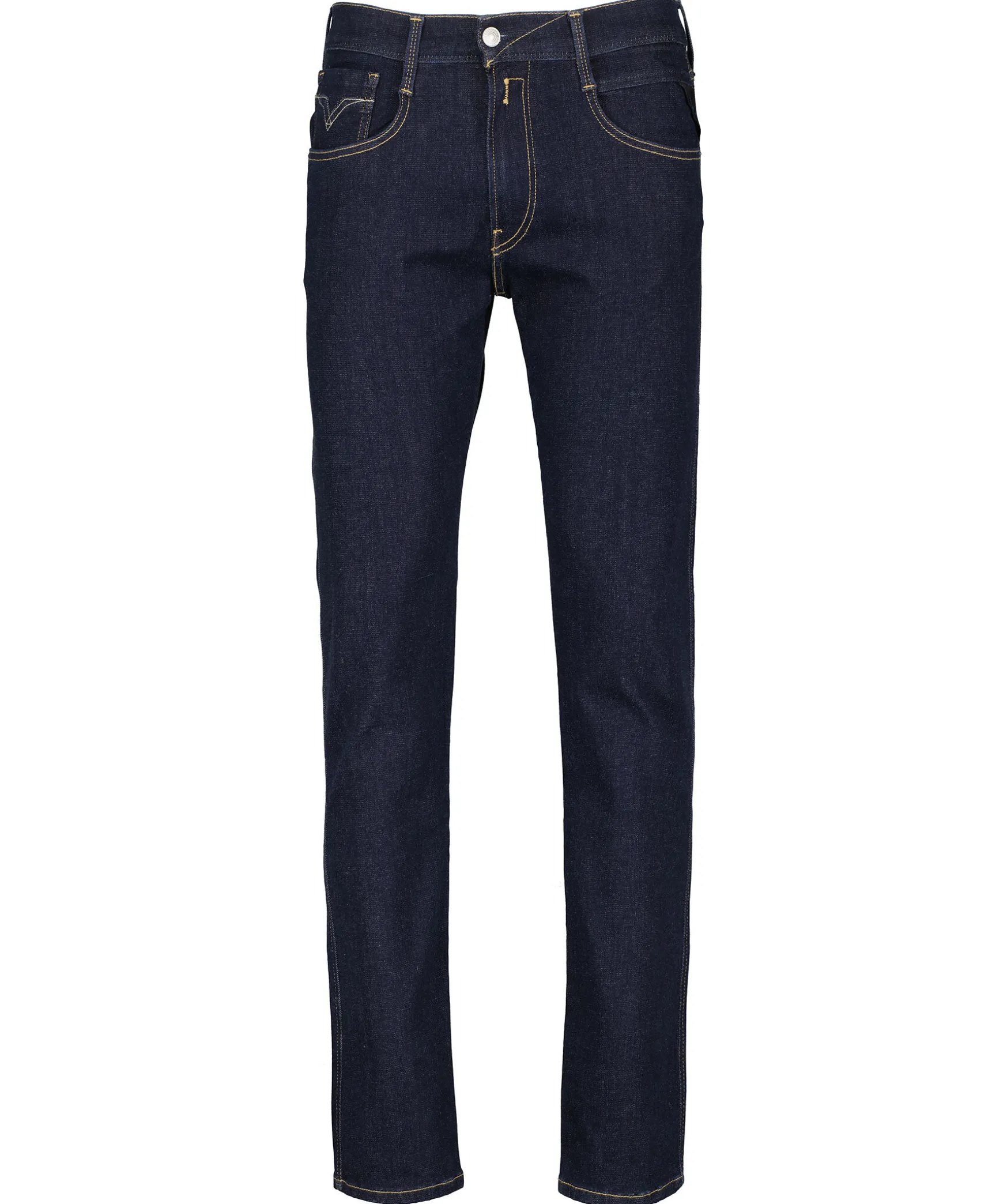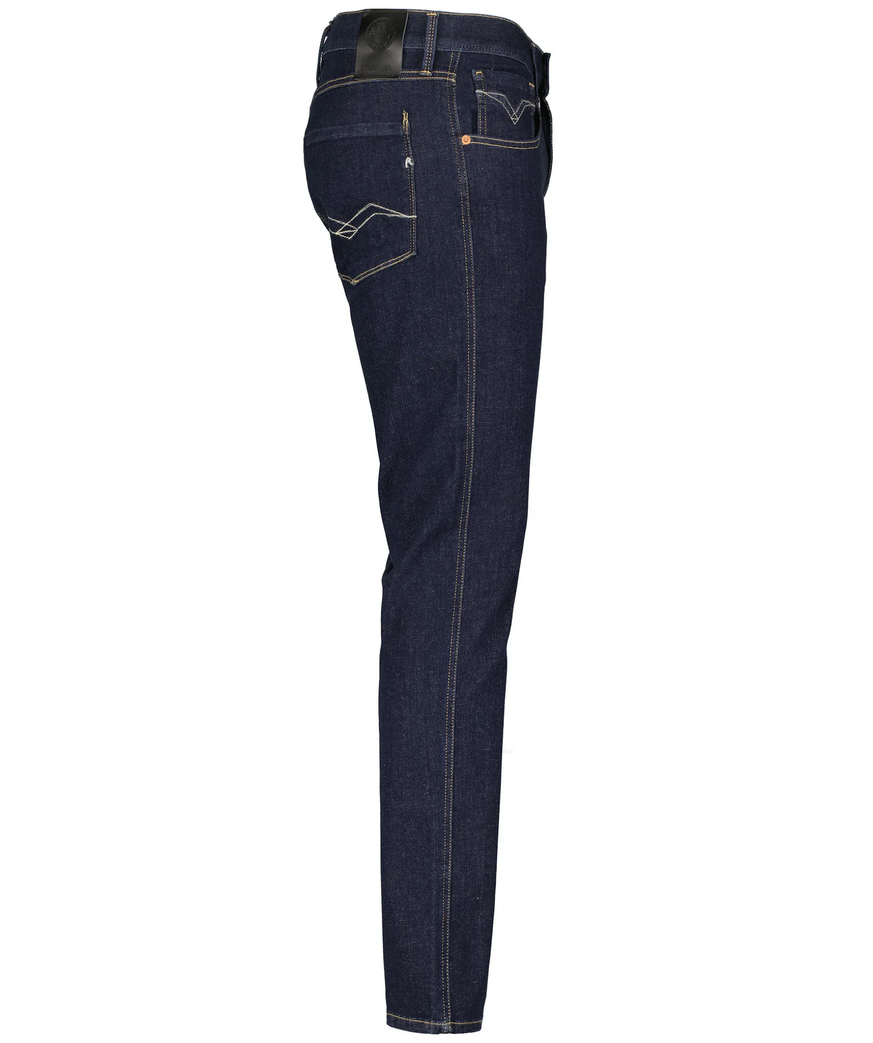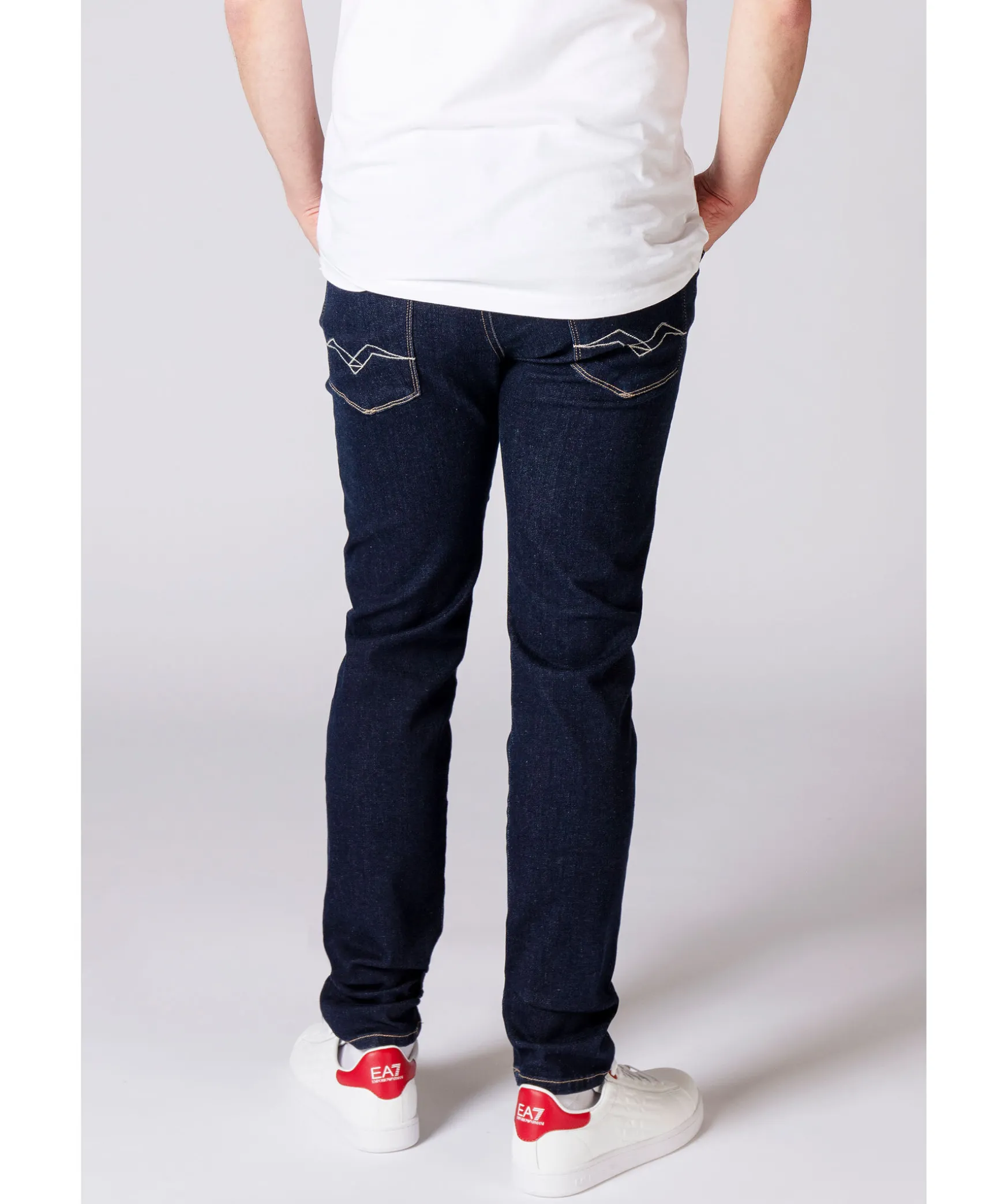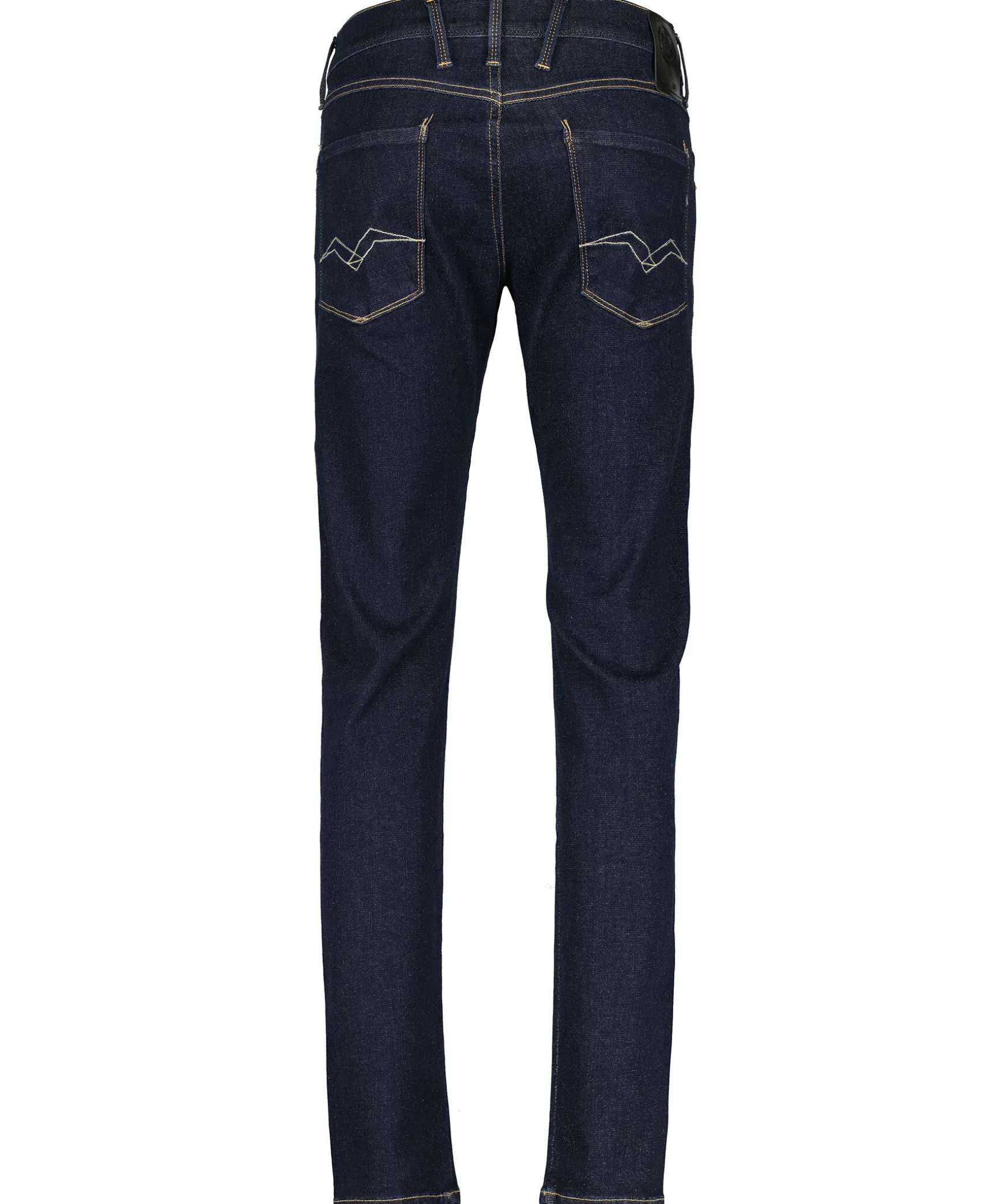 Morkblaa Slim Fit Jeans I Hyperflex Modell Fran Replay. Power Stretch Denim Med Fyrvagsstretch I Bomullsblandning Med En Mork Tvatt. Vanlig Midja Och Nagot Avsmalnande Ben, Fem Fickor, Triangelformad Replay-Etikett Pa Vanster Ficka, Mynt Ficka Och Bakfickor Med Ikoniska Replay-Sommar. R-Formad Metallbricka Pa Hoger Bakficka, Dragkedja Och Knappgylf Samt Hallor For Balte I Midjan. Jeansen Ar Lite Stora I Storlek, Vi Rekommenderar Att Ga Ner En Storlek For Bast Passform. Modellen Ar 180Cm Lang Och Har Pa Sig Storlek 32″32.
