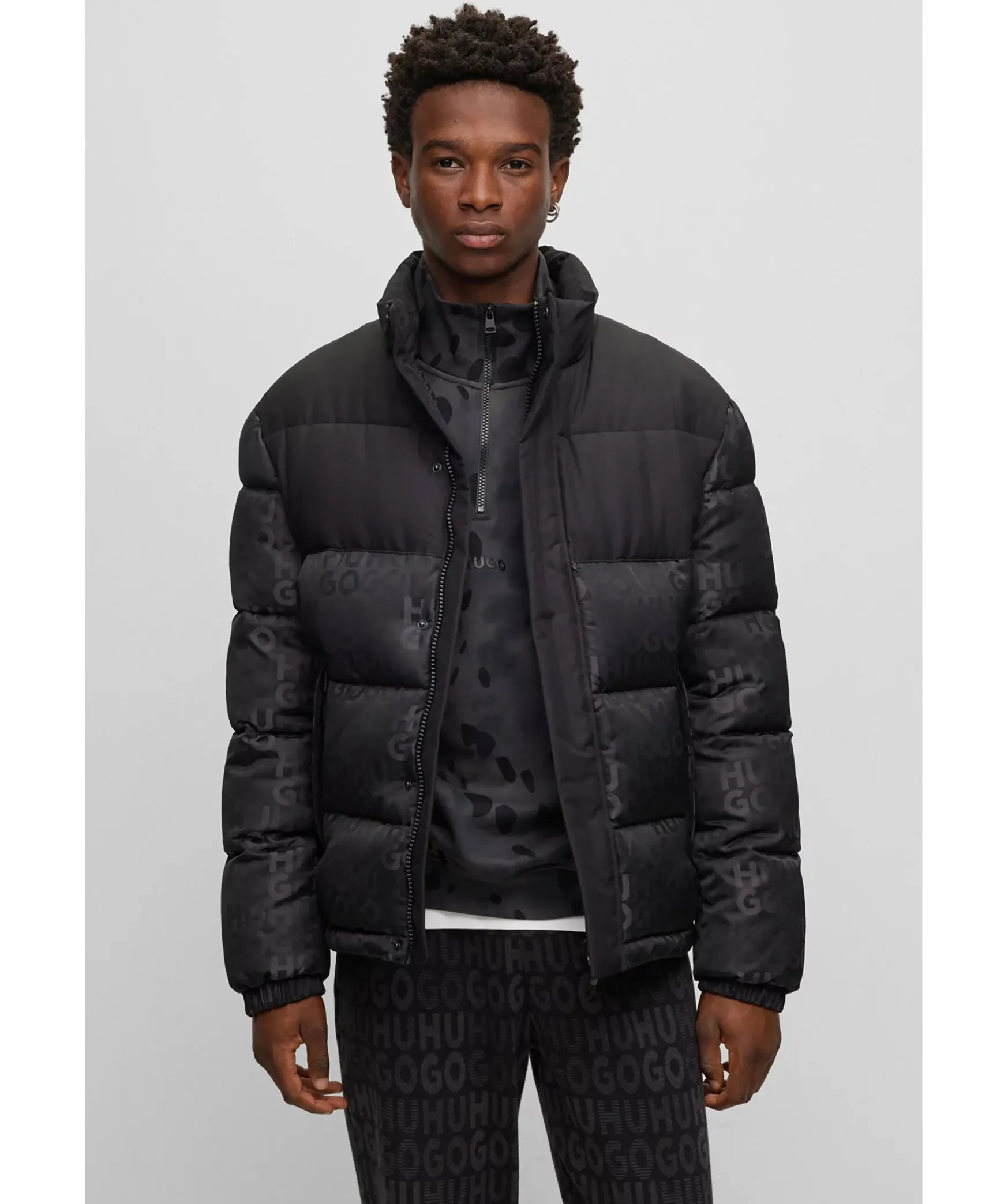 Svart Pufferjacka Med Vavt Monogram Monster Fran Hugo. Svart Kontrasttyg Pa Axlarna Och Brostet. Stangs Framtill Med Dragkedja Och Tryckknappar. Tva Fickor Framtill Som Stangs Med Dragkedja. Innerficka Som Stangs Med Dragkedja. Elastisk Resar Vid Armslut. Dragsko Vid Jackslut.
