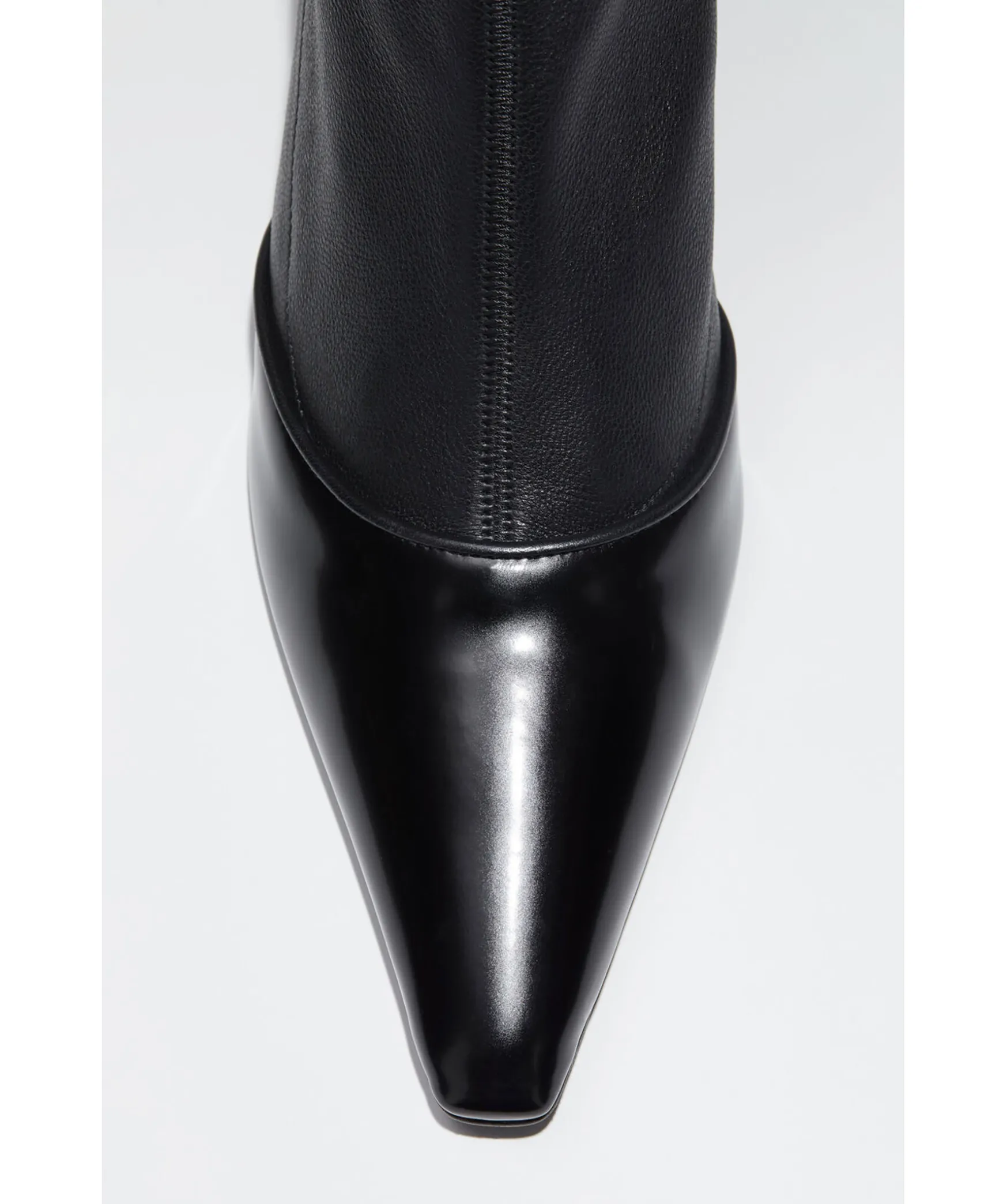 Svarta Boots I Lader Med Klack Fran Acne Studios. Dragkedja Pa Skons Insida. Spetsig Ta Med Glansig Finish. Klacken Ar 4,5 Cm Hog.