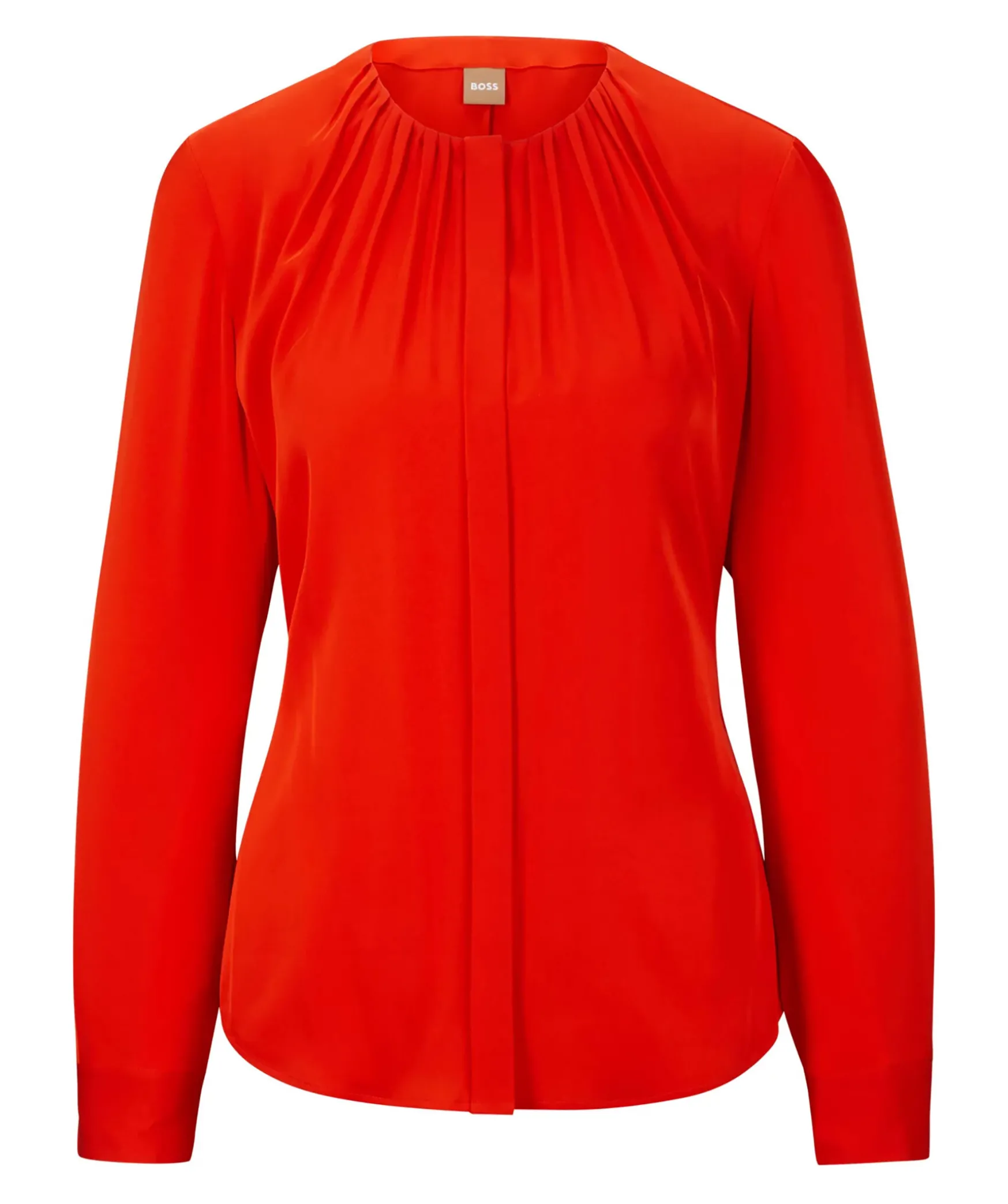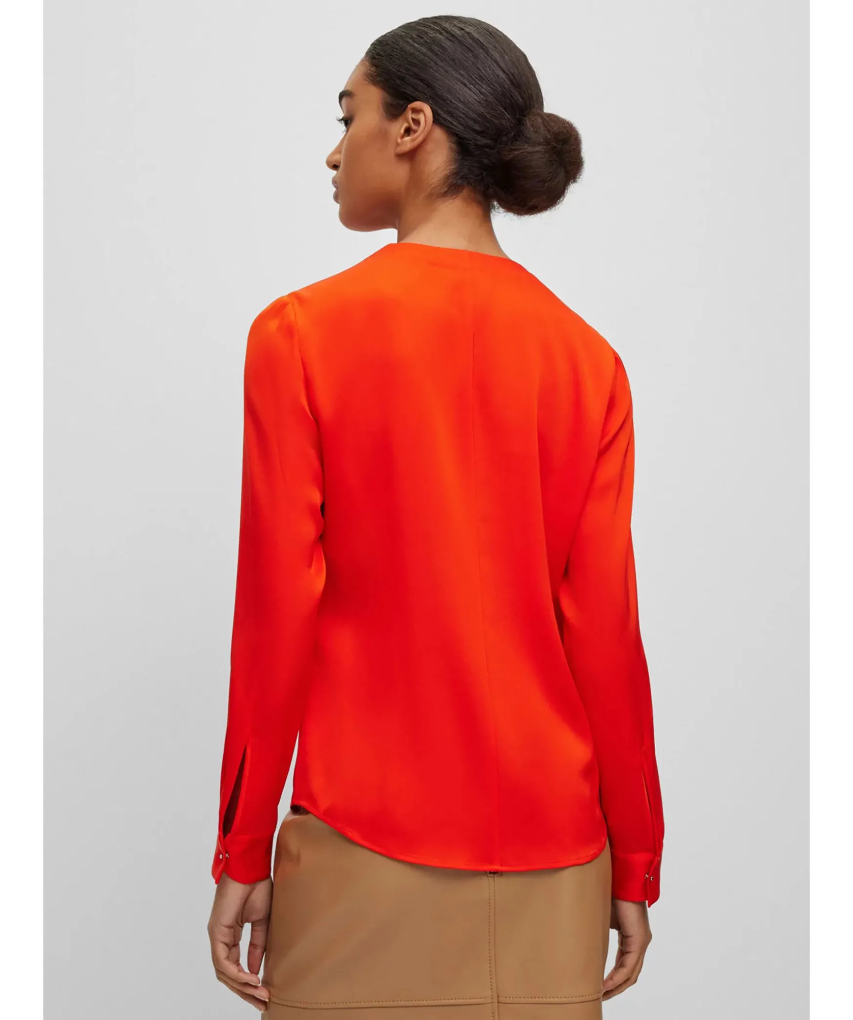 Orange Blus Fran Boss Black. En Ogenomskinlig Blus I Lyxigt Stretch-Silke Crepe De Chine Fran Boss Womenswear, Med Rynkad Halsringning, Dold Stangning Och Logga Bak. Manschetter Med Knapp.