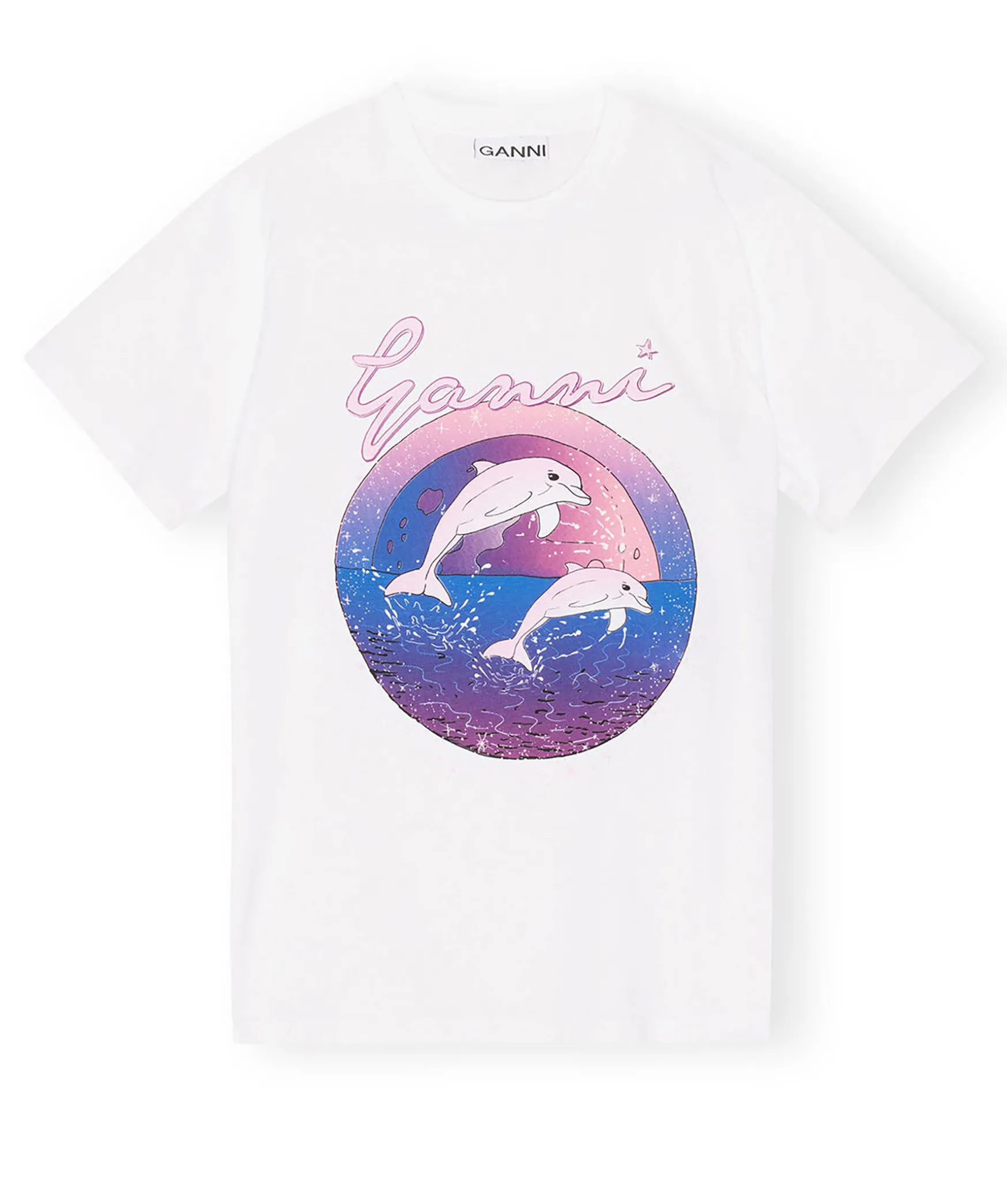 Vit, Avslappnad T-Shirt Fran Ganni. Tillverkad Av Certifierad Ekologisk Bomull. T-Shirten Har En Relaxed Fit, Rund Halsringning, En Ganni Logotyp Och Ett Grafiskt Delfintryck.