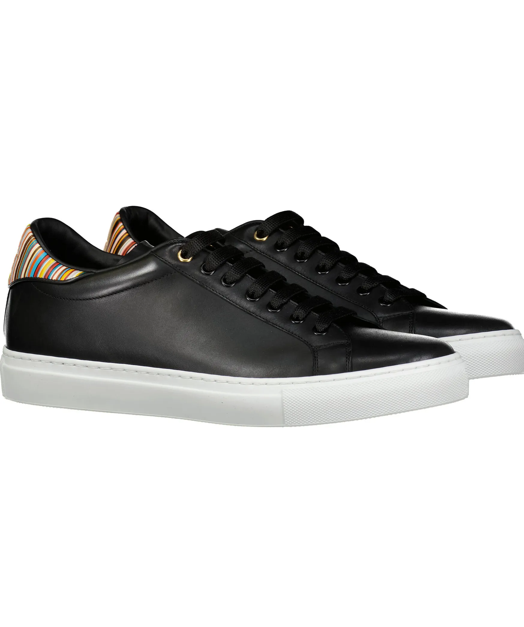 Svarta Sneakers I Lader Fran Paul Smith. Randig Detalj Pa Halen. Guldfargad Logotyp Pa Plosen Och Halen, Stansad Logotyp Pa Sulans Hal. Vit Hog Sula I Gummi. Platta Skosnoren. Guldfargad Snorningshal Upptill.