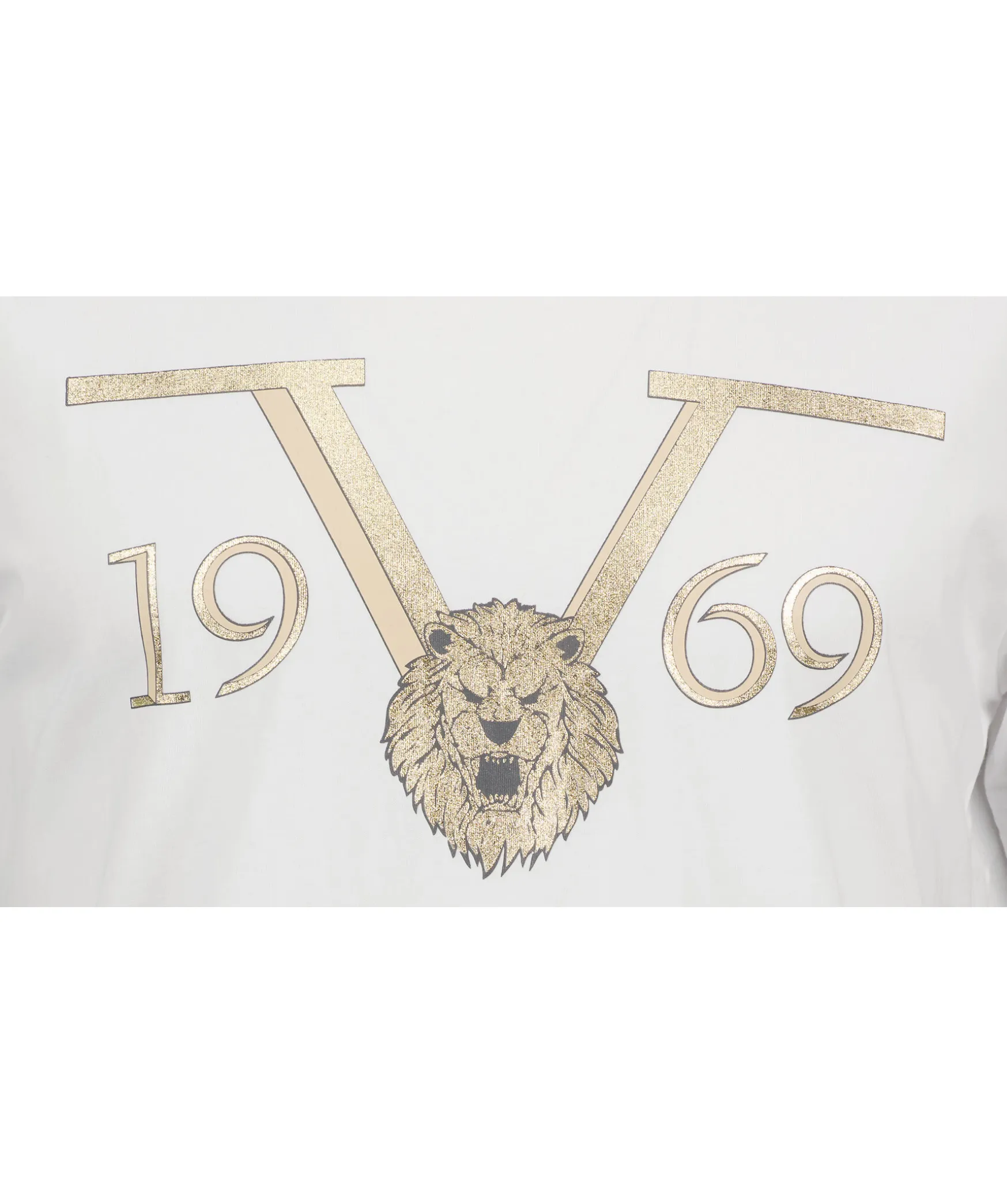 Vit T-Shirt Fran 19V69 Italia By Versace. Tillverkad I 100% Bomull. Guldglittrig Logotyp Pa Brostet. Ribbstickad Halsringning.