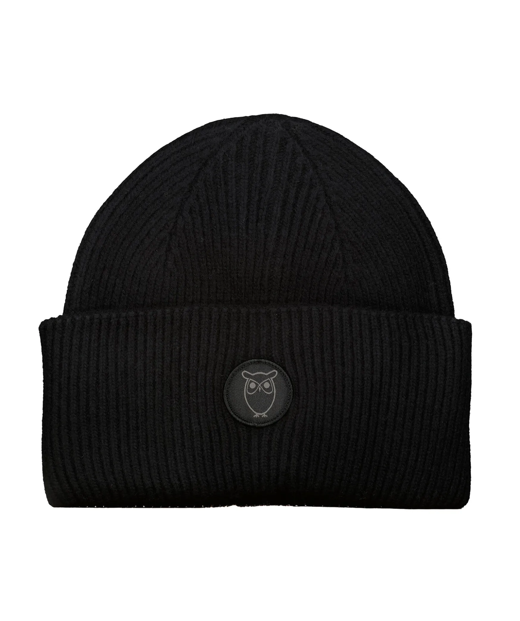 Svart, Ribbstickad Mossa Fran Knowledge Cotton. Mossan Ar Gjord Av 100 % Lammull Och Har Ett Dubbelt Lager Och Ar Ett Bekvamt Och Lampligt Val For Alla Tillfallen. Avslutad Med En Tonal Ugglebroderad Lapp Pa Framsidan.