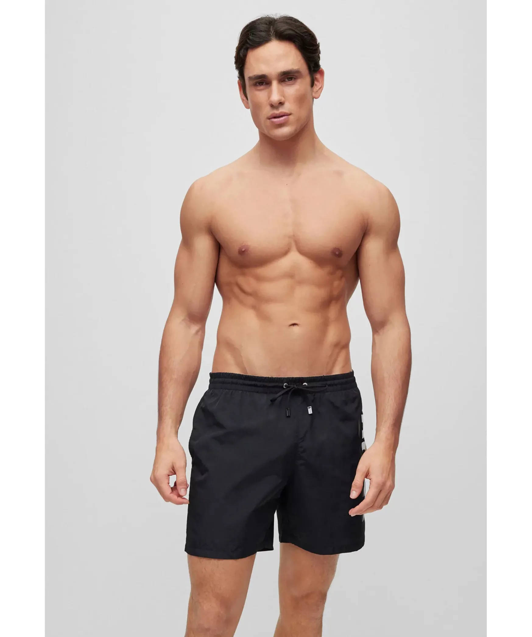 Svarta Badshorts Fran Boss Black. Dragsko Och Resar I Midjan. Tryckt Logotyp Pa Vanster Lar I Guld, Vitt Och Svart. Tva Fickor Framtill, En Bakficka Som Stangs Med Kardborre.