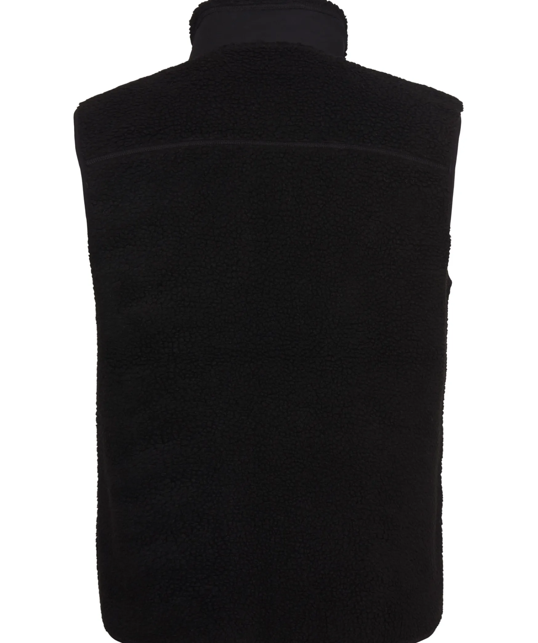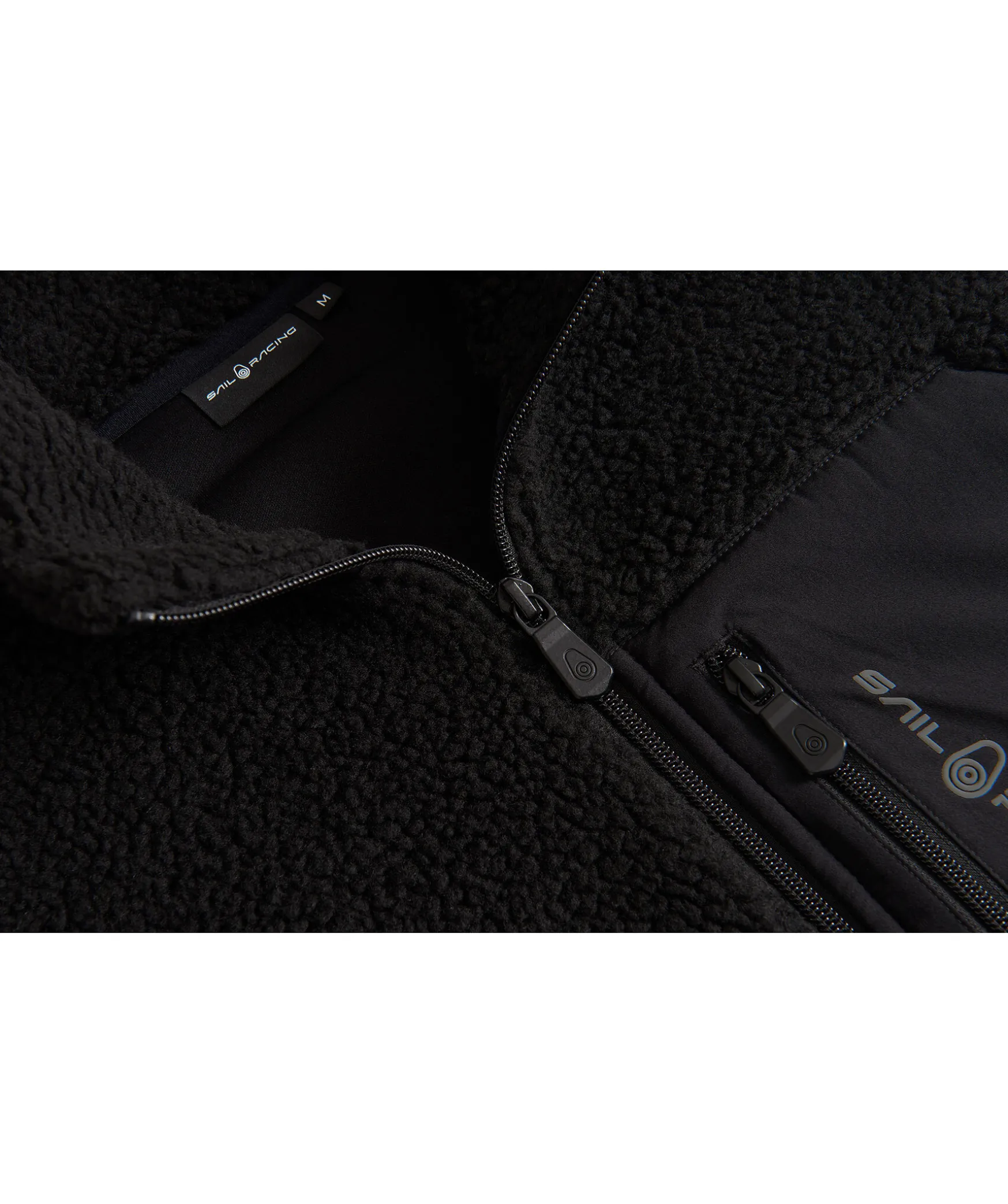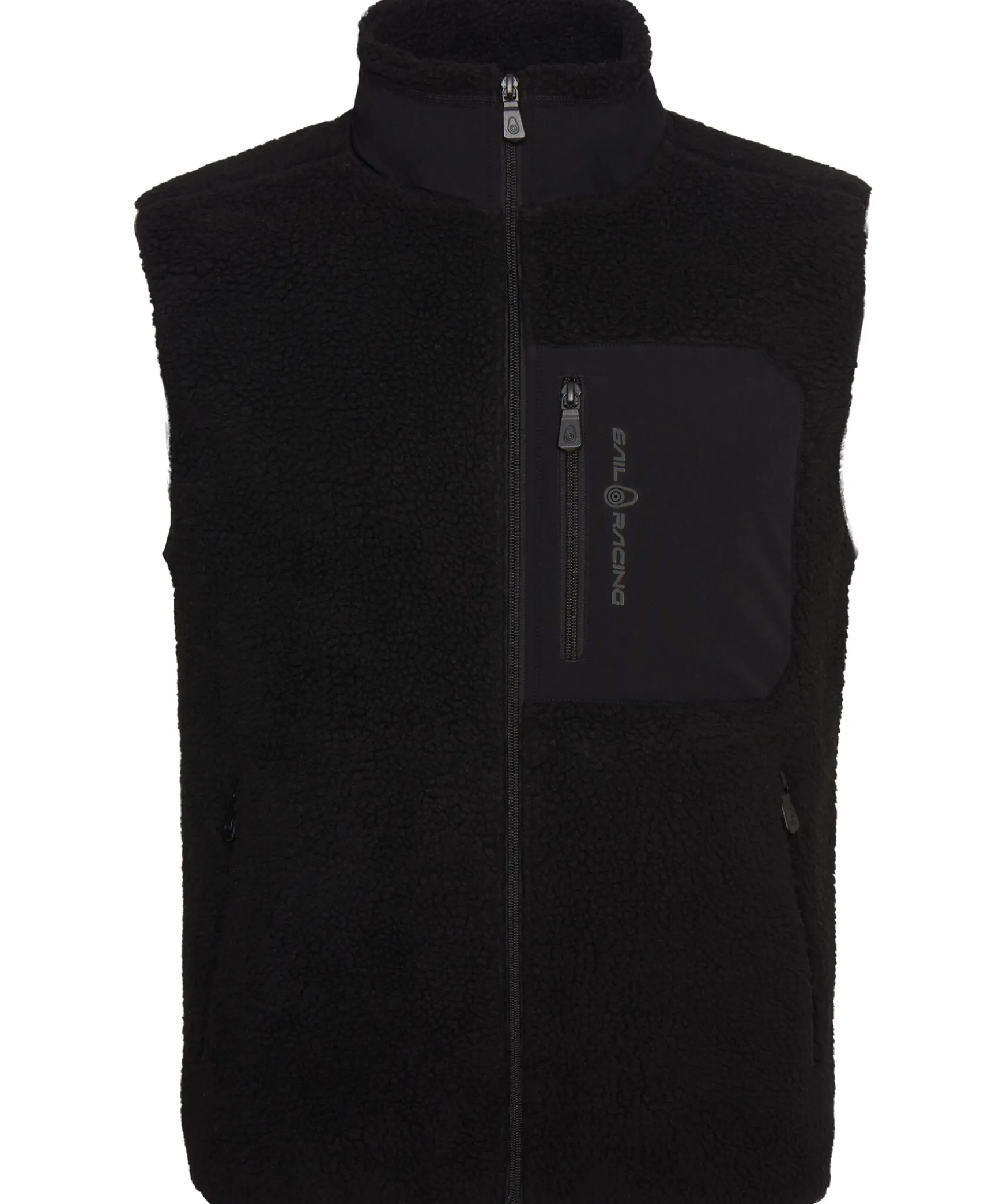 Svart Fleecevast Fran Sail Racing. Vasten Har En Hog Krage Och Kontrasttyg Vid Kragen Och Brostfickan. Brostfickan Stangs Med En Dragkedja Och Har En Gra Logotyp. Tva Sidfickor Med Dragkedja.