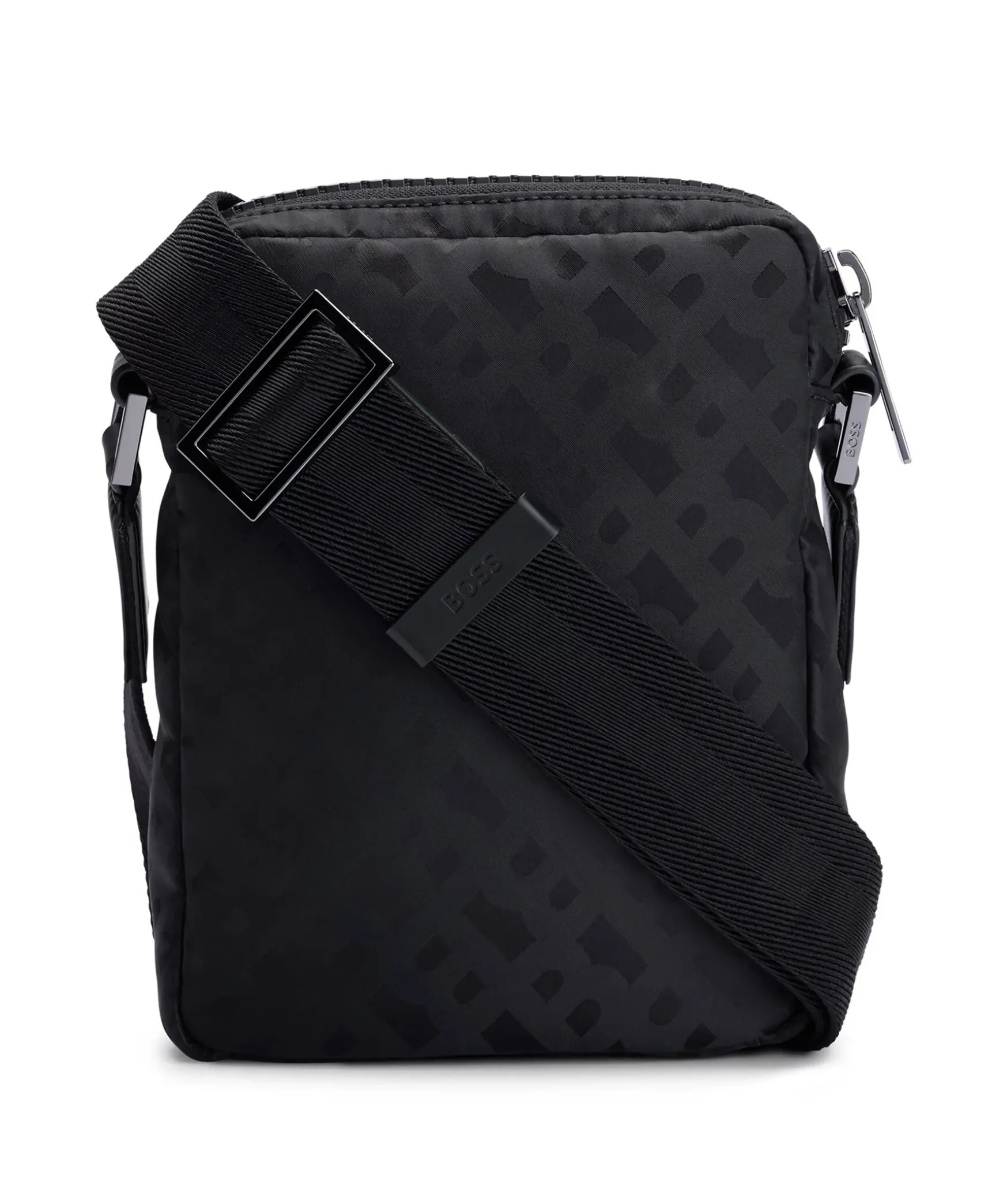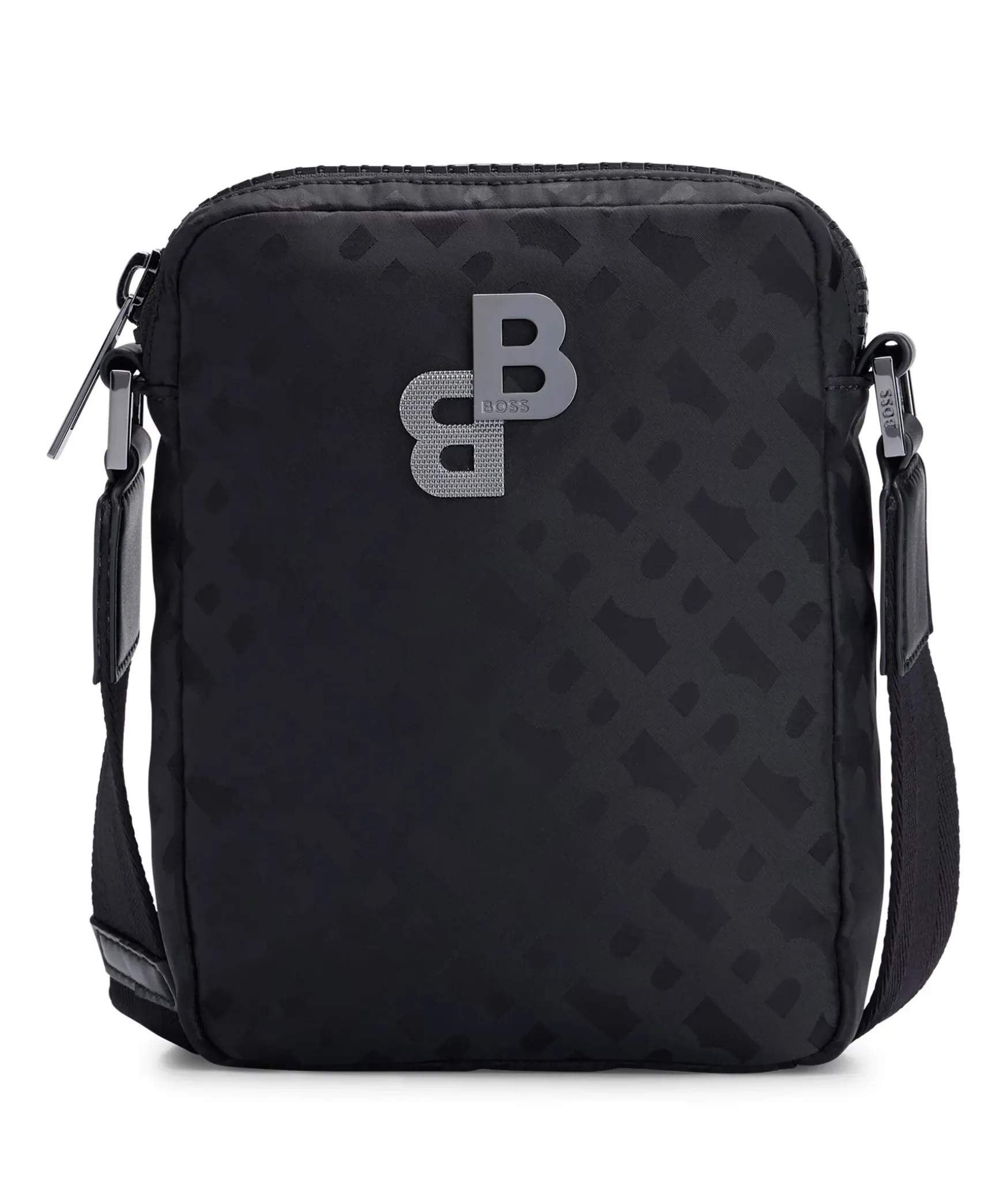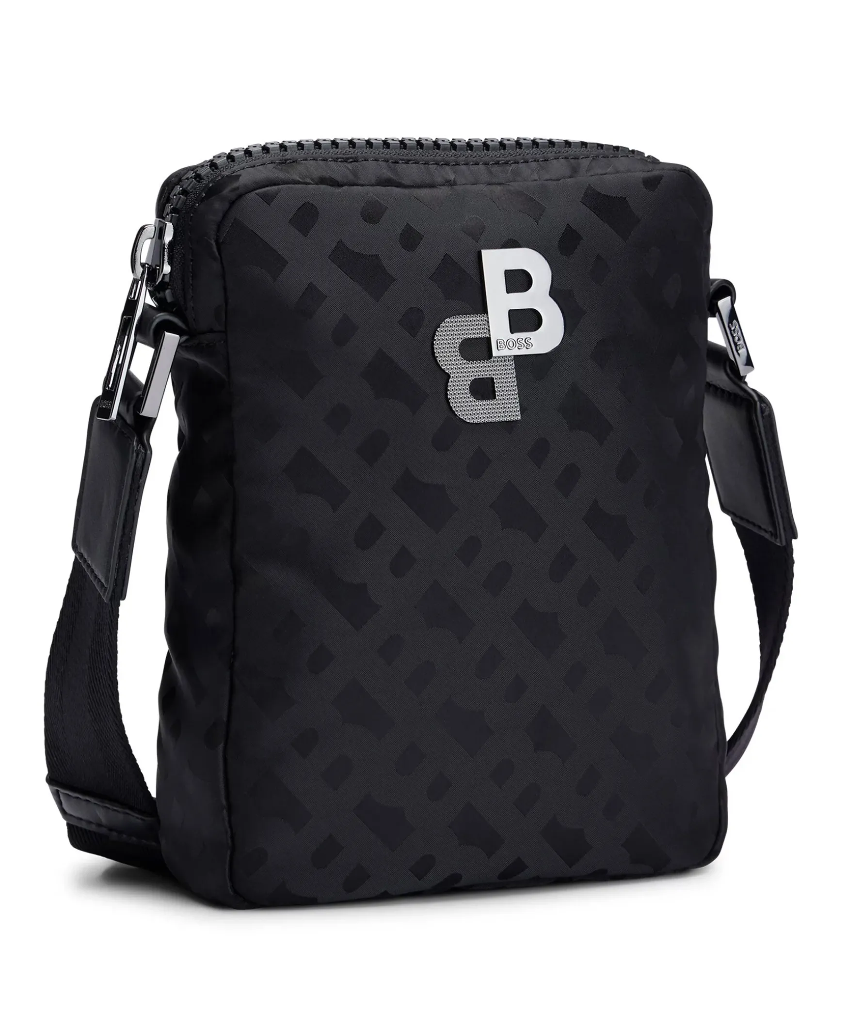 En Kompakt Svart Reportervaska Fran Boss Black. Tillverkad I Slat Nylon, Detaljerad Overallt Med Tonala Monogram Och Kantad Med Bokstaver I Polerat Silver. Stangs Med Dragkedja Upptill. En Oppen Innerficka. L: 15,5 Cm B: 15,0 Cm H: 20,0 Cm.
