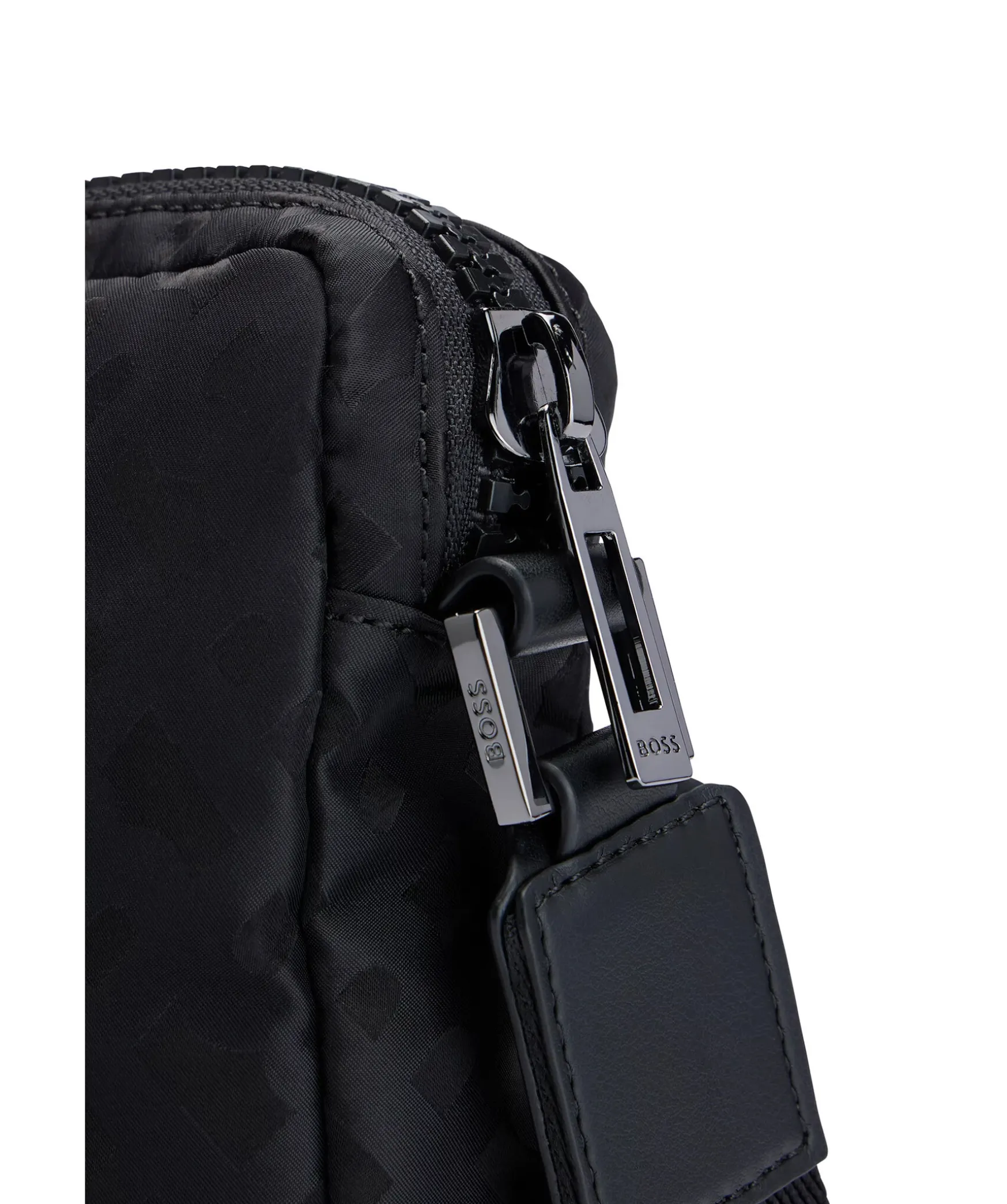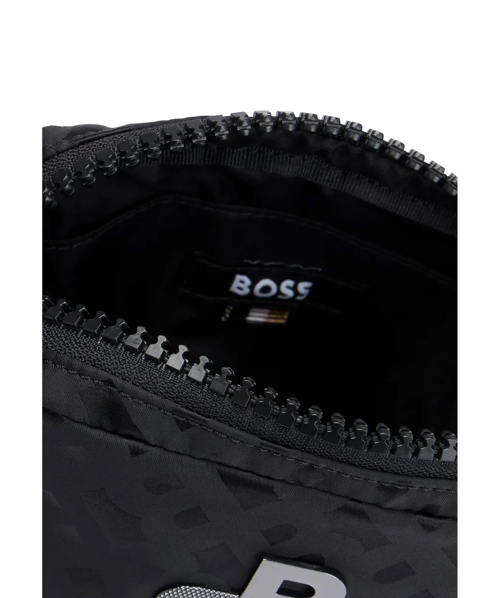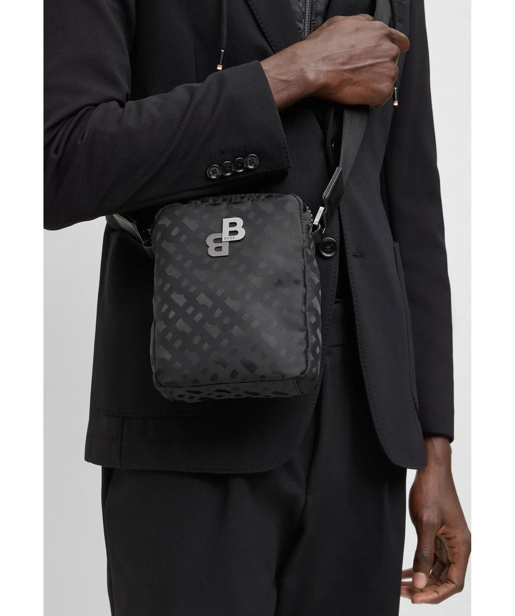 En Kompakt Svart Reportervaska Fran Boss Black. Tillverkad I Slat Nylon, Detaljerad Overallt Med Tonala Monogram Och Kantad Med Bokstaver I Polerat Silver. Stangs Med Dragkedja Upptill. En Oppen Innerficka. L: 15,5 Cm B: 15,0 Cm H: 20,0 Cm.