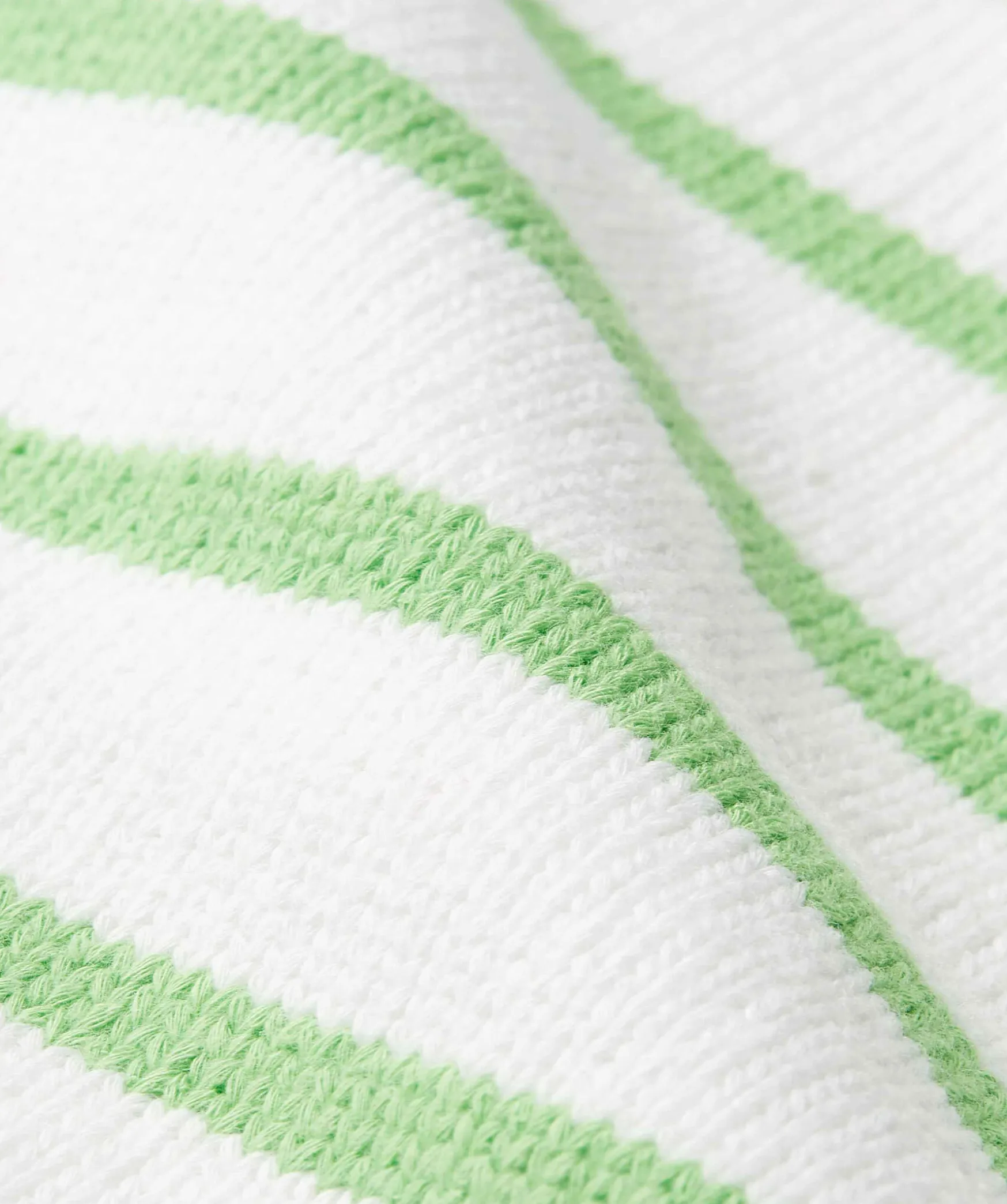 Vit, Stickad Troja Med Grona Rander Fran Tommy Hilfiger. Tillverkad I Ekologisk Bomullsblandning. Rundad Halsringnig Samt Har En Ribbstickad Ringning, Armslut Och Fall. Liten, Tommy Hilfiger Flagga Broderad Vid Mudden Pa Vanster Armslut.