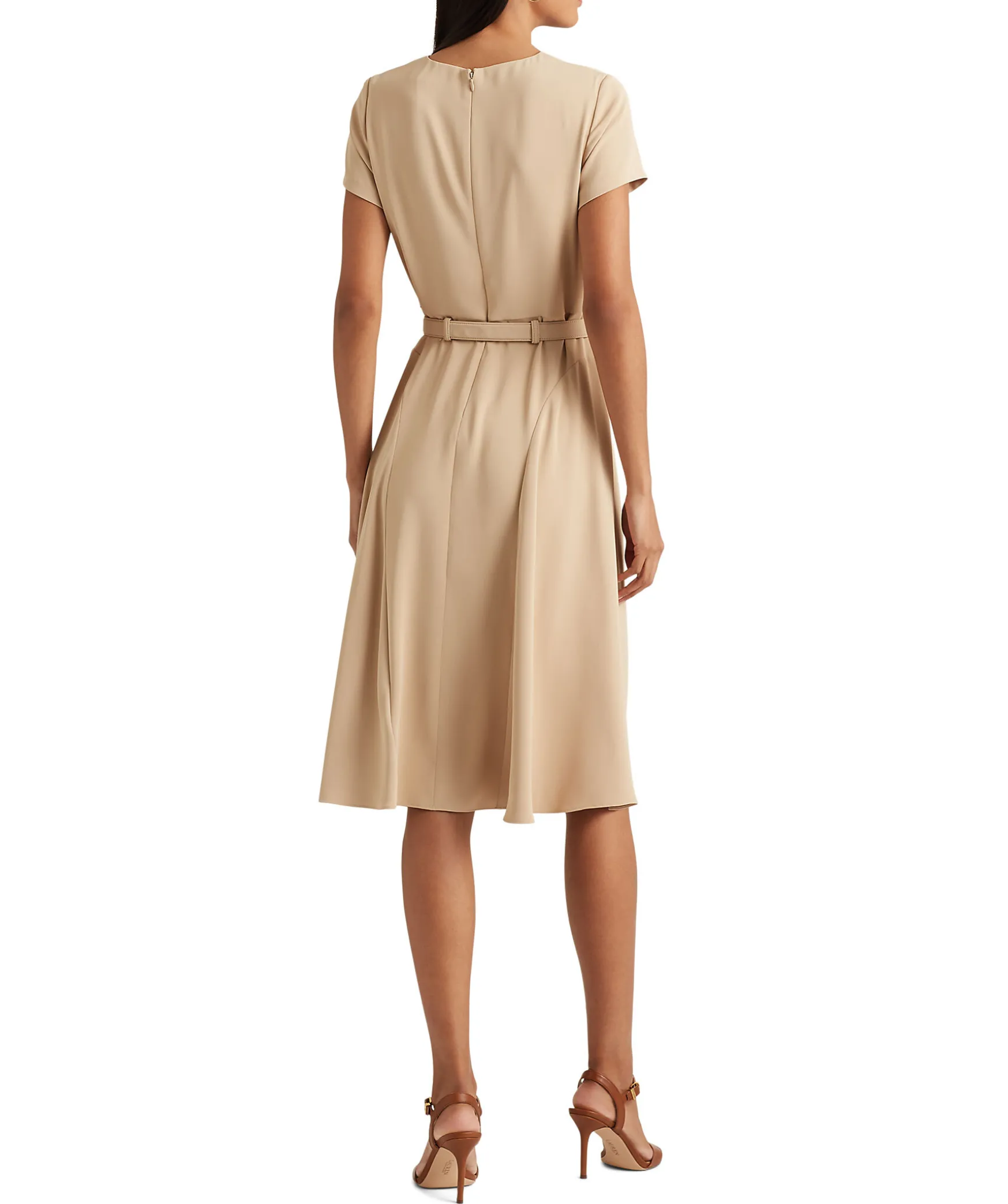 Beige Klanning Fran Lauren Ralph Lauren. Rundad Guldspanne Som Ger Klanningen En Ovre Rundad Halsringning. Korta Armar, Justerbart Balte I Brunt Lader Och Guldfargad Metall. Hallor For Balte. Dragkedja I Ryggen. Tillverkad I Atervunnet Material.