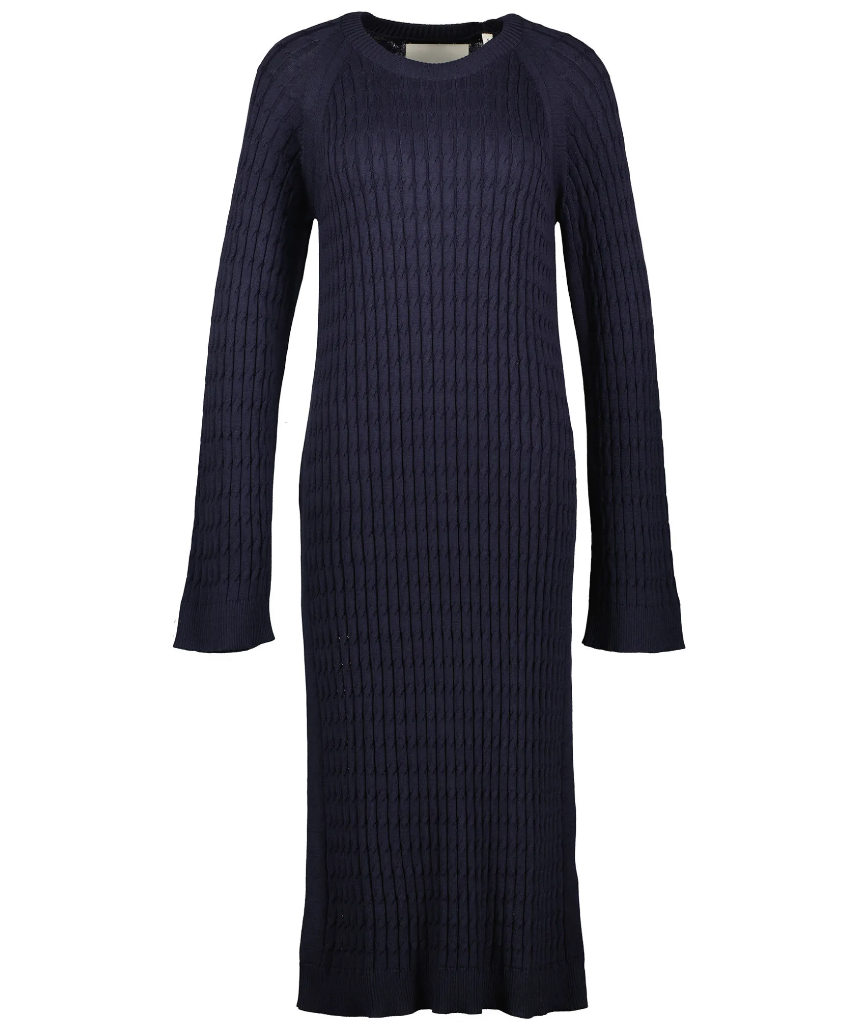 Marinbla Chic Klanning I Glansig Lyocell- Och Bomullsblandning Med En Smal Kabelstickad Struktur Fran Gant. Den Har En Normal Passform Som Omfamnar Kroppen Pa Ett Snyggt Satt, Med Mellanlang Langd, Klassisk Rund Halsringning Och Raka, Mellanlanga Armar. Ett Snyggt Plagg Som Kan Dressas Bade Upp Och Ner Beroende Pa Tillfalle.