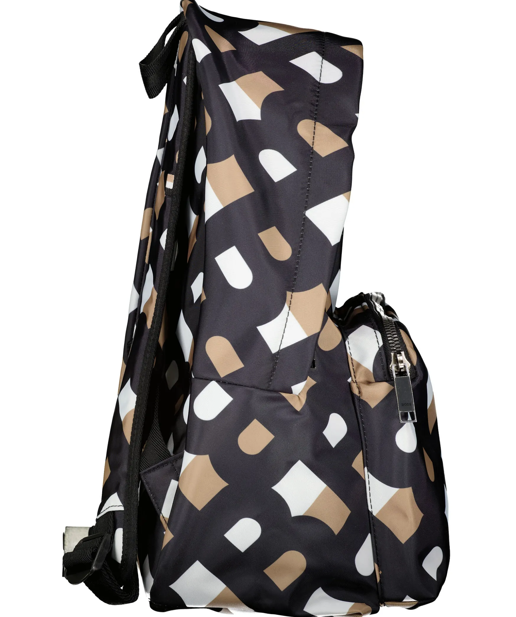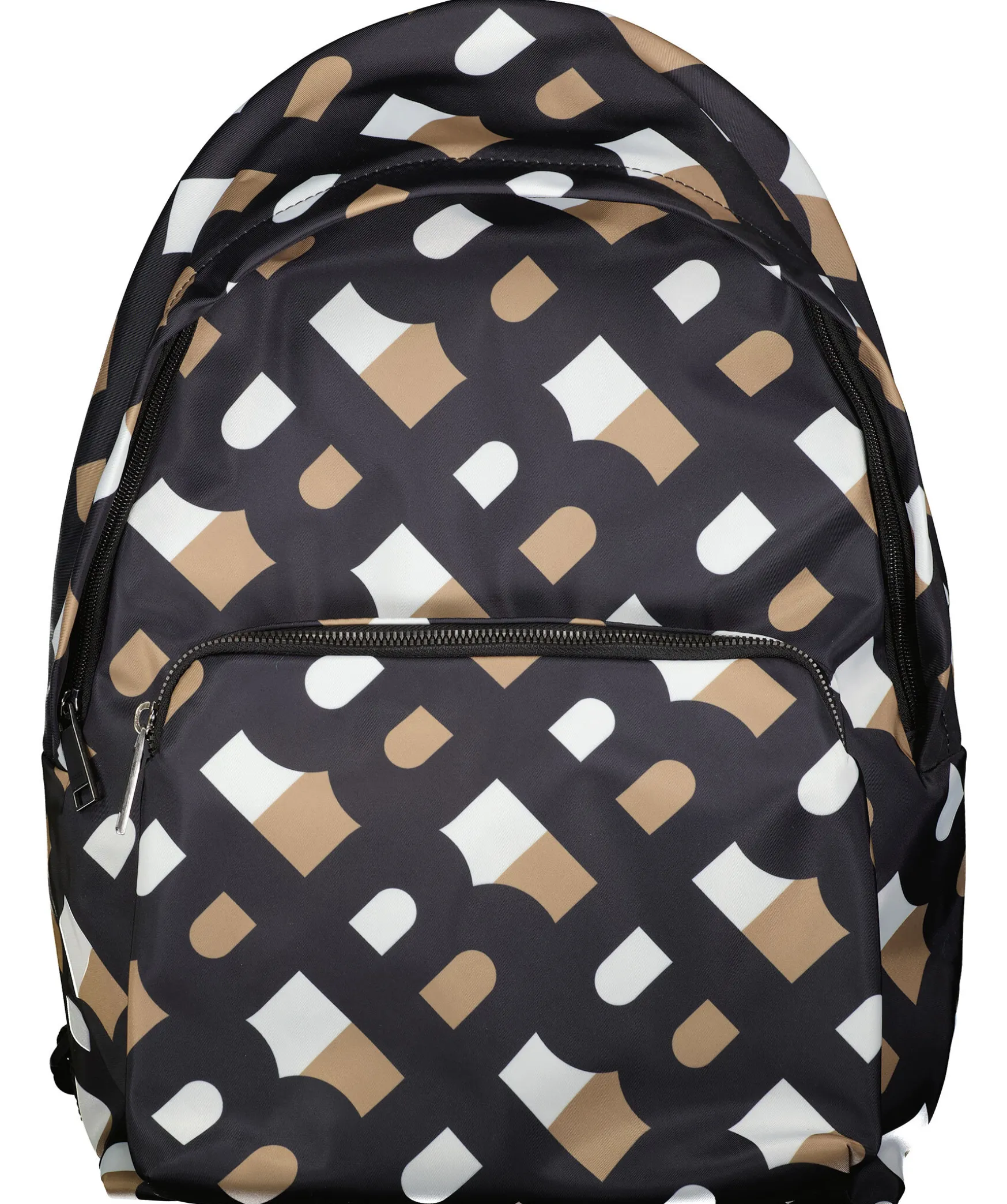Svart, Monstrad Ryggsack Med Fran Boss. Tillverkad I Polyamid. Monster Som Forestaller Bokstaven B I Svart Som Upprepas Med Vitt Och Brunt Bakom. Stort Fack Med Dragkedja Och En Mindre Fack Med Dragkedja Pa Utsidan, Justerbara Axelband Och Halla Bak Att Hanga Upp Vaskan I.