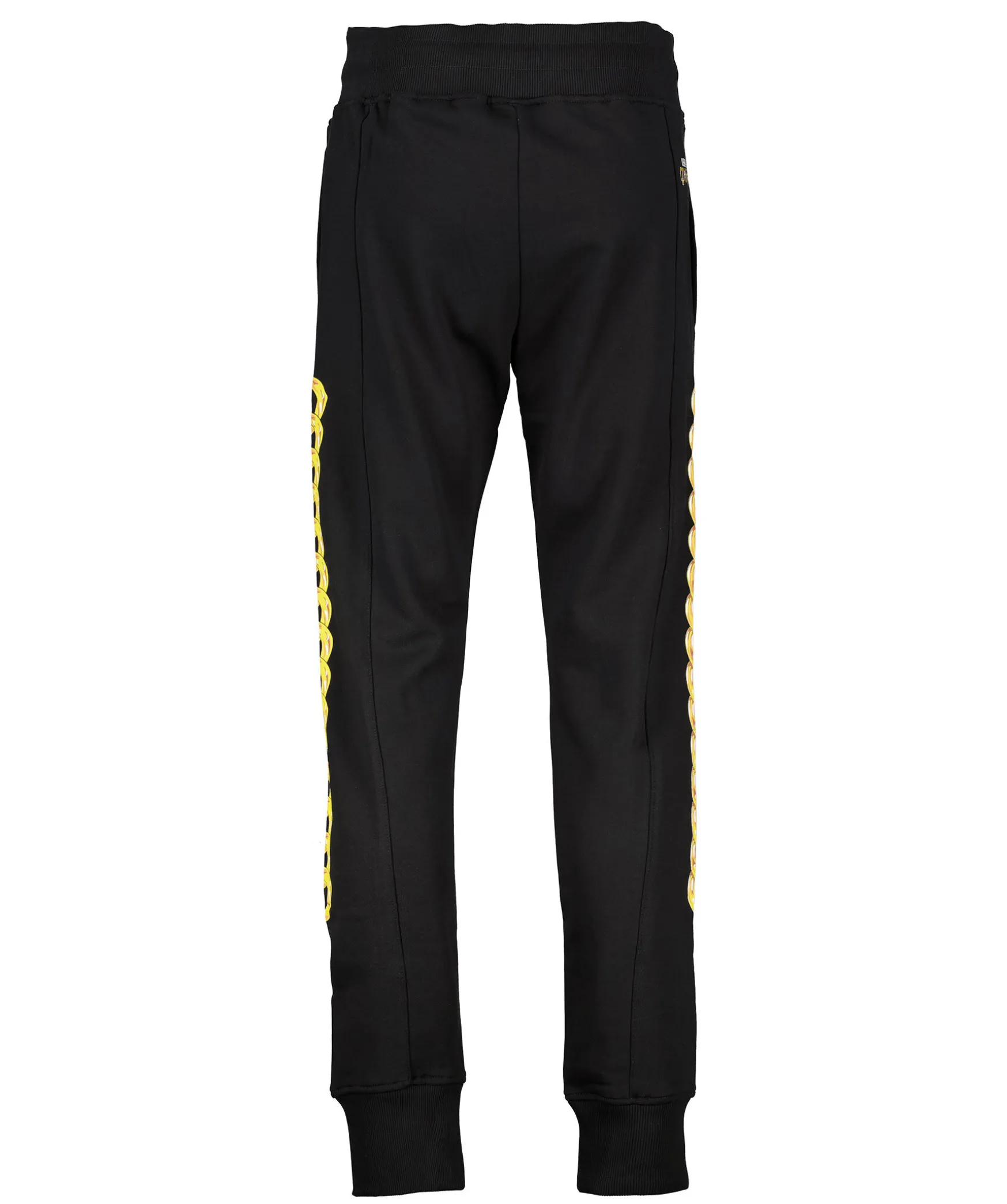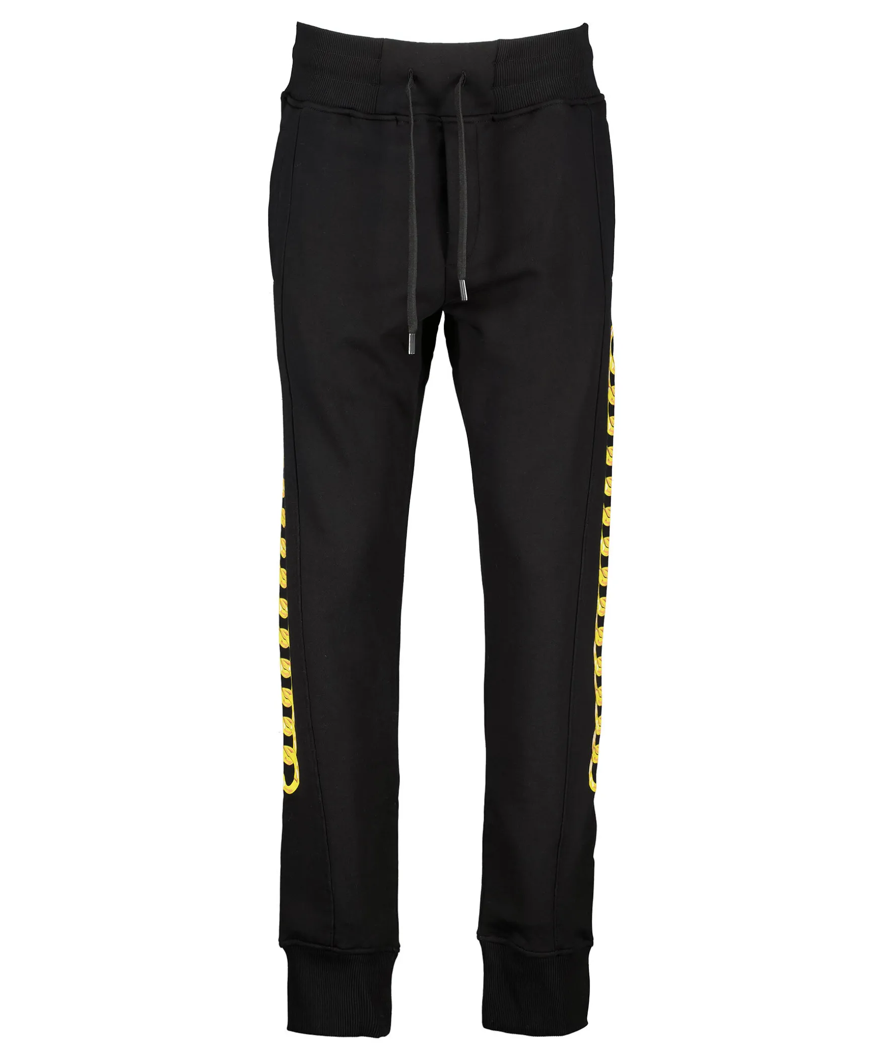 Svarta Mjukisbyxor Fran Versace Jeans Couture. Tillverkade I 100% Bomull. Tva Sidfickor, Ribbstickad Midja Med Snorning Samt Ribbstickade Muddar Vid Benslut. Byxorna Har Aven Ett Gult Kedjetryck Langs Sidorna Samt Logotyp Vid Ena Fickan. Normal Passform.