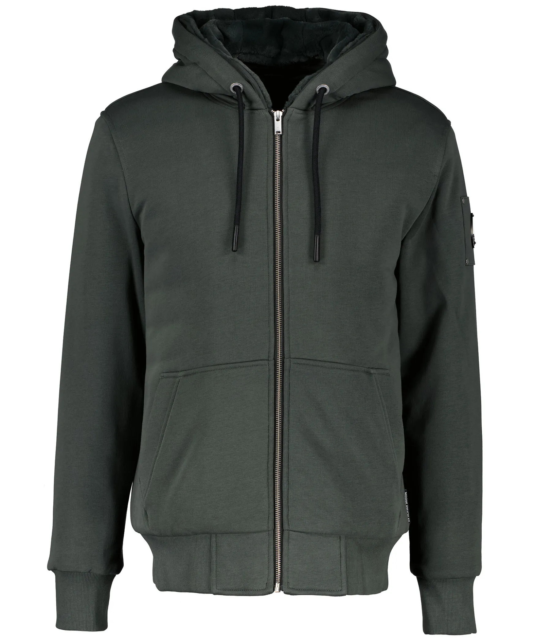 Skogsgron Vadderad Hoodie Fran Moose Knuckles. Stangs Framtill Med Dragkedja. Luva Med Dragsko. Ficka Pa Magen. Ribbstickad Mudd Vid Arm- Och Plaggslut. Patch Med Logotyp I Metall Pa Vanster Arm. Fodrad Luva I Konstpals.