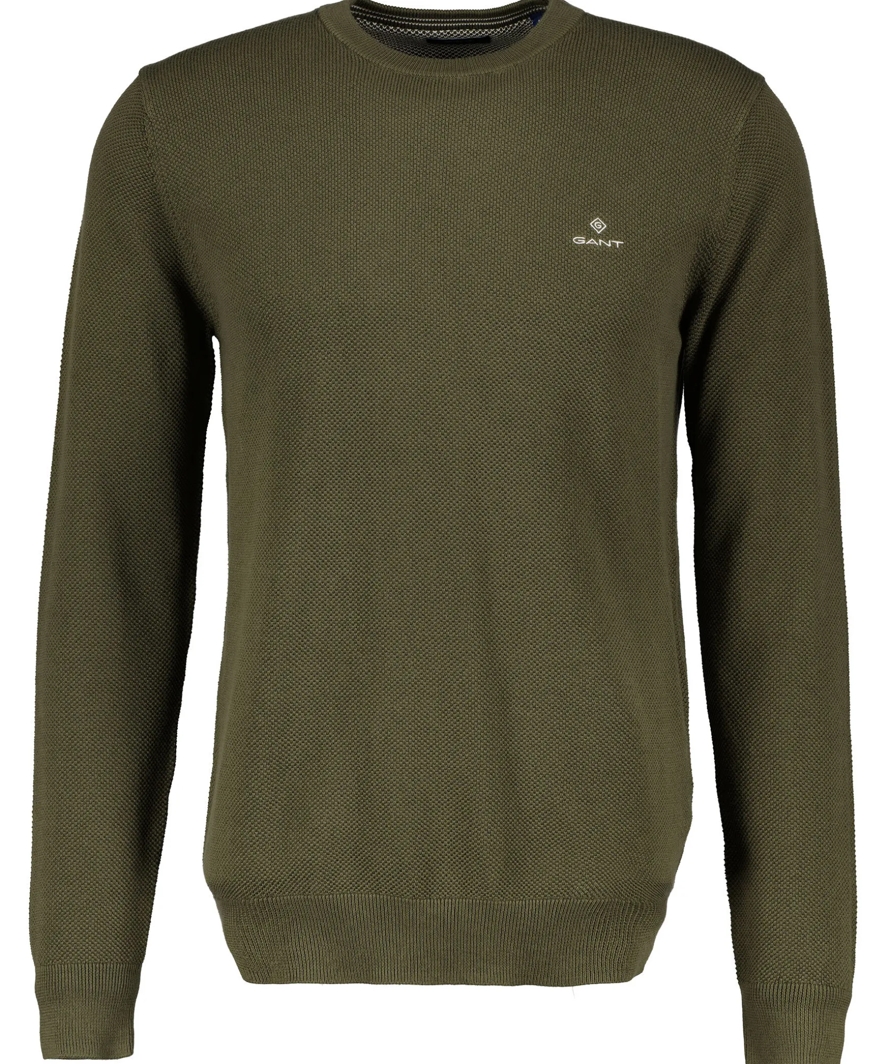 Olivgron, Langarmad Troja I Pikestruktur Fran Gant. Broderad Logotyp I Vitt Pa Brostet. Normal Passform, Rundad Hals Och Ribbade Muddar.