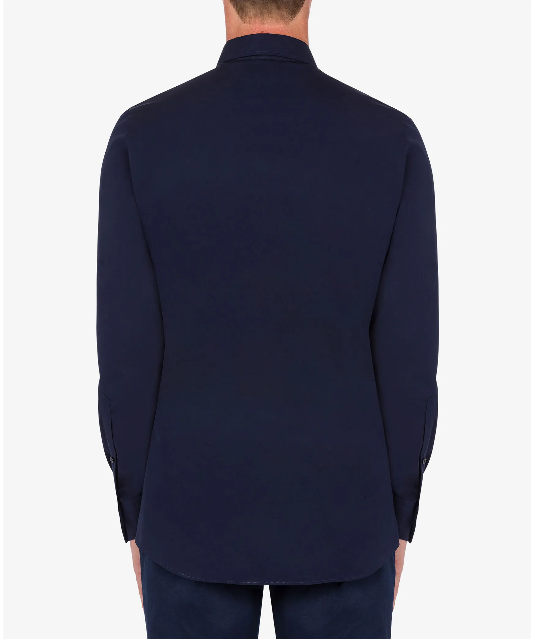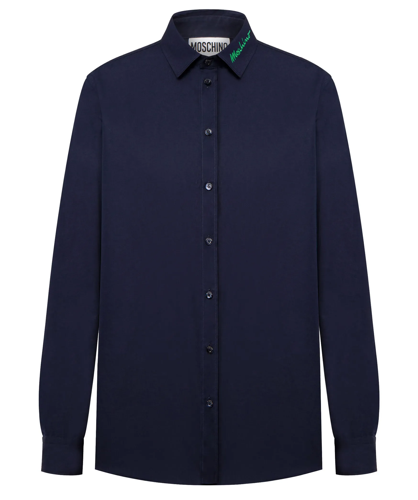 Marinbla Skjorta Fran Moschino Gjord I Bomullspoplin. Skjortan Har En Normal Passform Och Har En Logotyp Broderat I Gron Pa Kragens Ena Sida.