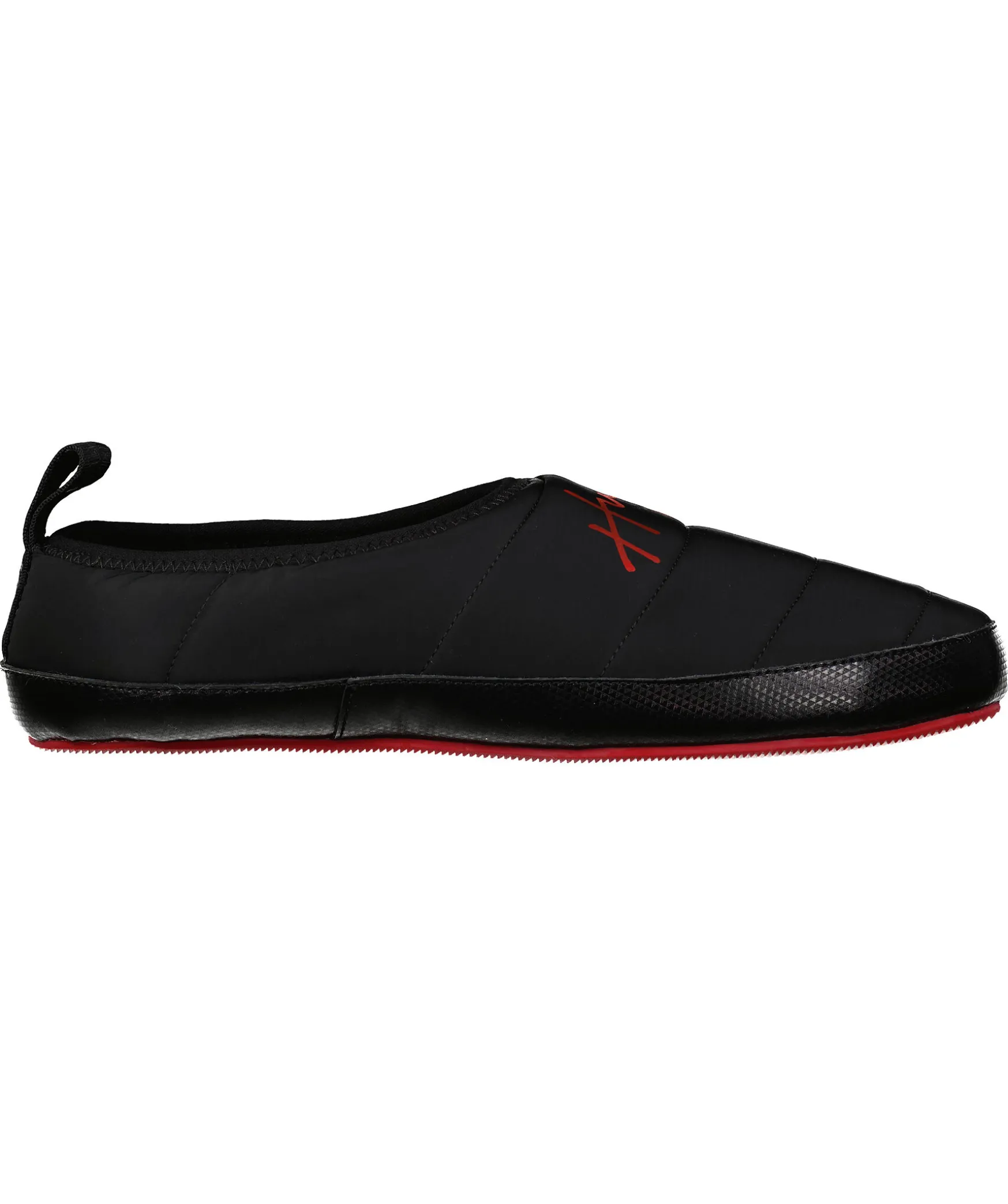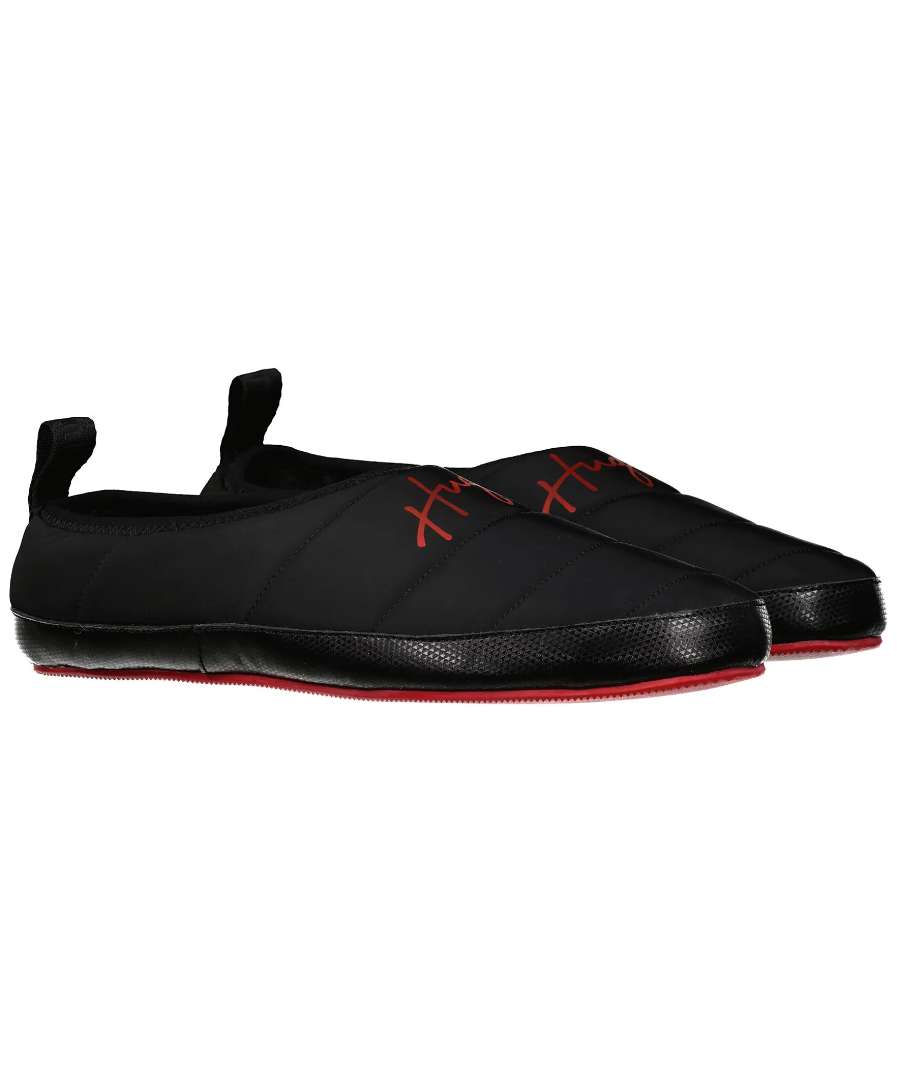 Svarta Tofflor Fran Hugo Men. Tofflorna Har En Mjuk Och Fluffig Insida Och En Tunn Elastisk Mudd Vid Skons Oppning. Rod Gummisula. Logotyp I Rott Pa Skons Ovansida.
