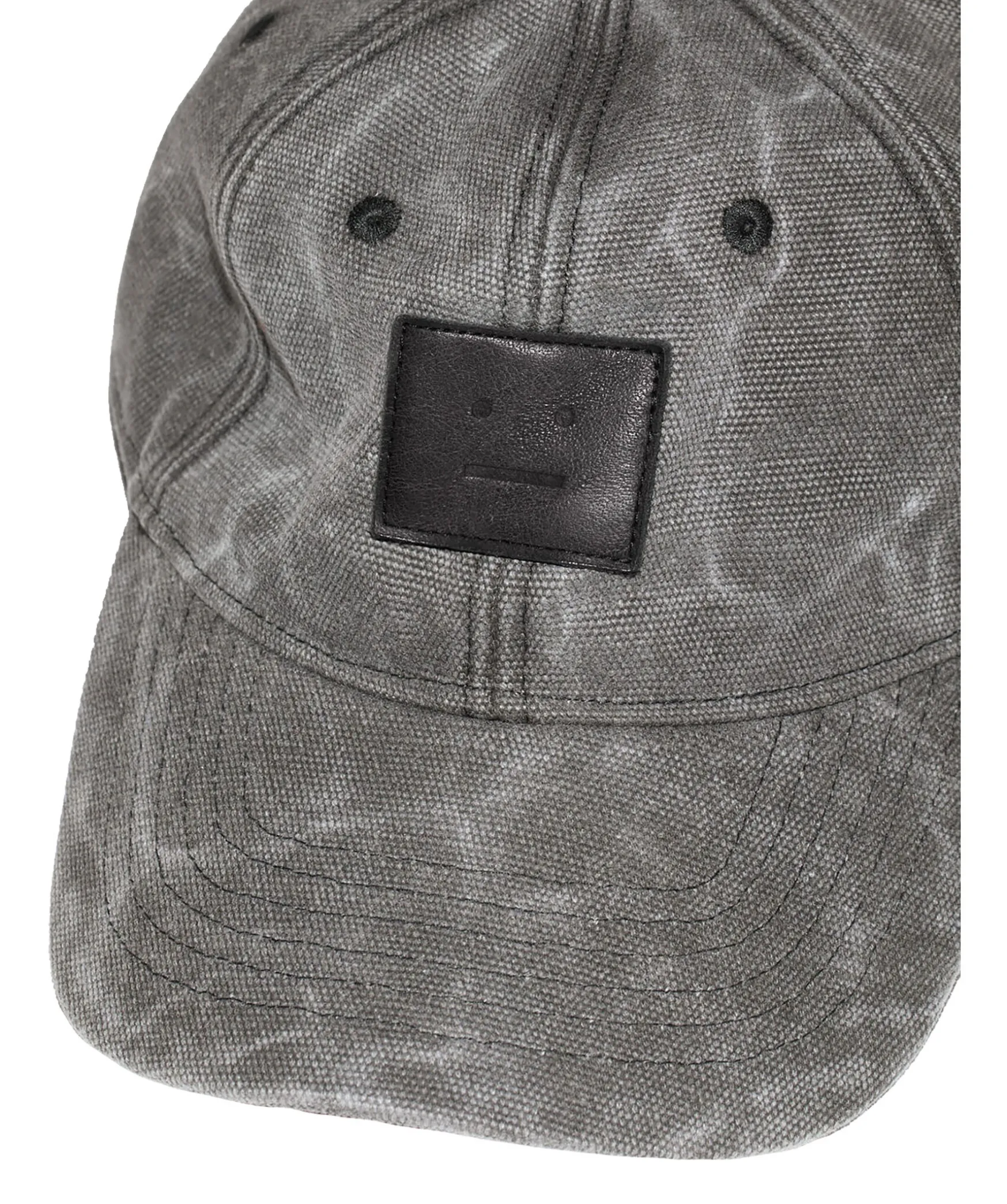 Svart, Stentvattad Keps I Canvastyg Fran Acne Studios. Stor, Svart Patch I Lader Med Face Motiv Pa Framsidan. Justerbart Spanne Baktill, Sex Paneler, Broderade Oljetter Och Bojd Skarm.