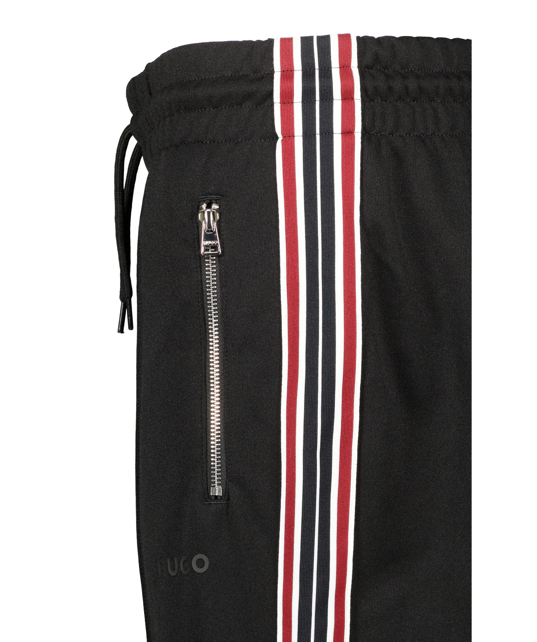 Svarta Tracksuit Byxor Fran Hugo. Revarer I Vitt, Svart Och Rott Langst Byxbenen. Dragsko I Midjan. Tva Fickor Framtill Med Dragkedja Samt En Passpoalficka Baktill. Gummerad Logotyp Pa Vanster Lar. Dragkedja Vid Benslut.