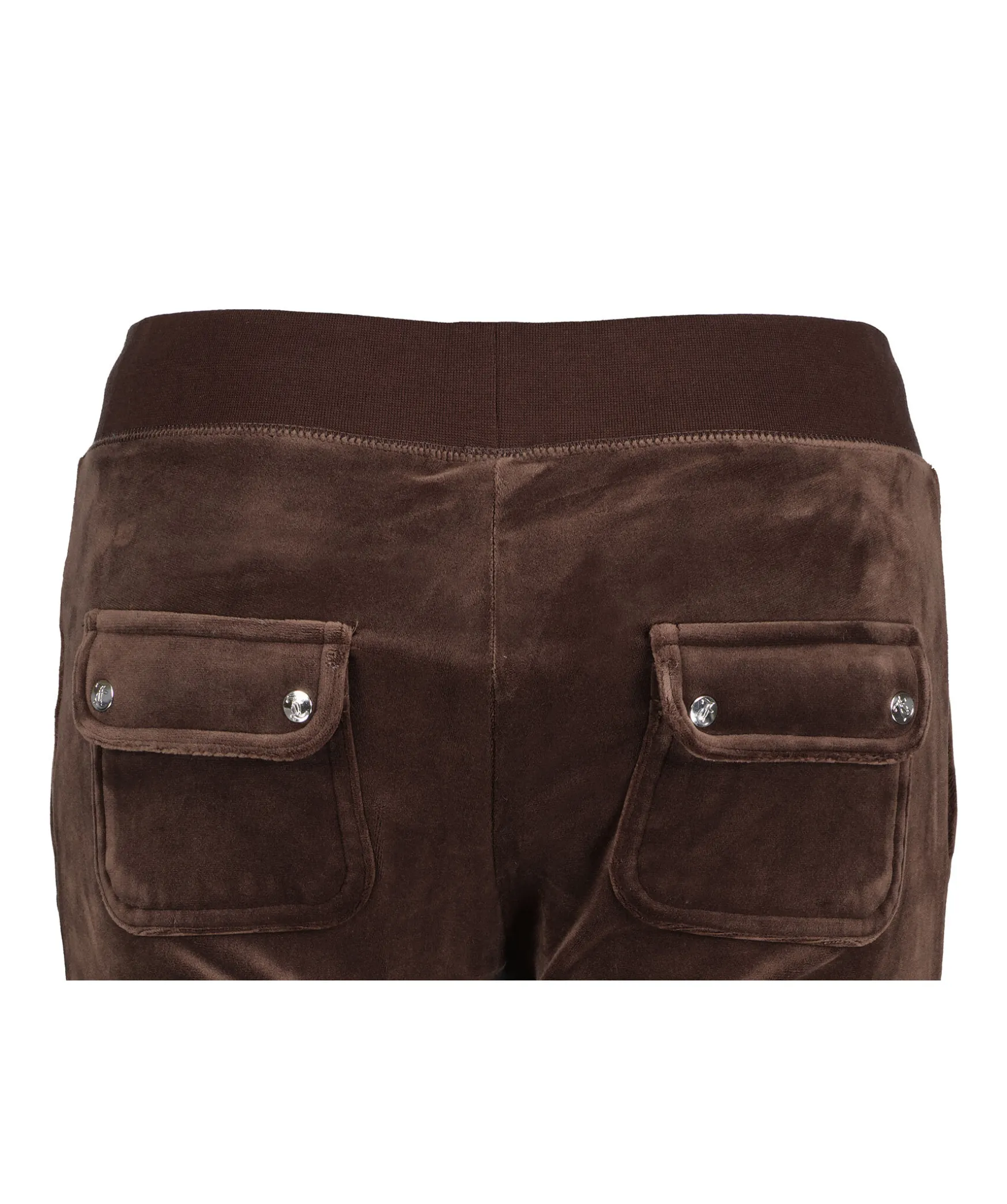 Bruna Byxor I Velour Fran Juicy Couture. Bred Resarkant I Midjan Med Snorning, Fickor I Sidorna Och Bakfickor Med Ficklock Och Tryckknappar Med Logotyp. Rak Modell Broderad Logga Framtill Pa Vanster Ficka.