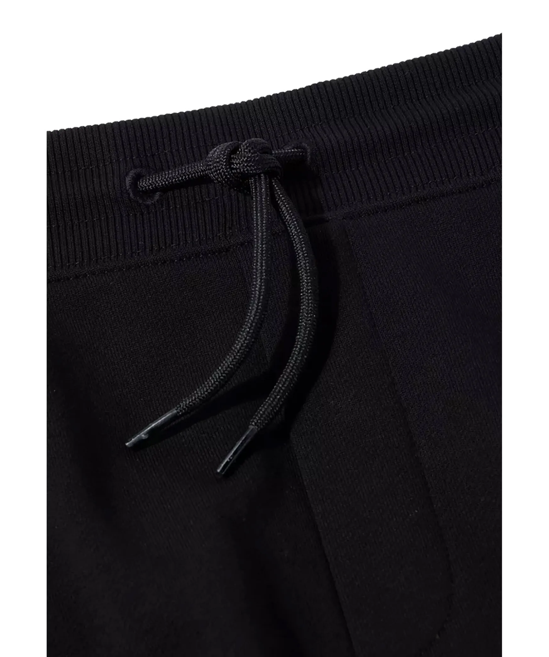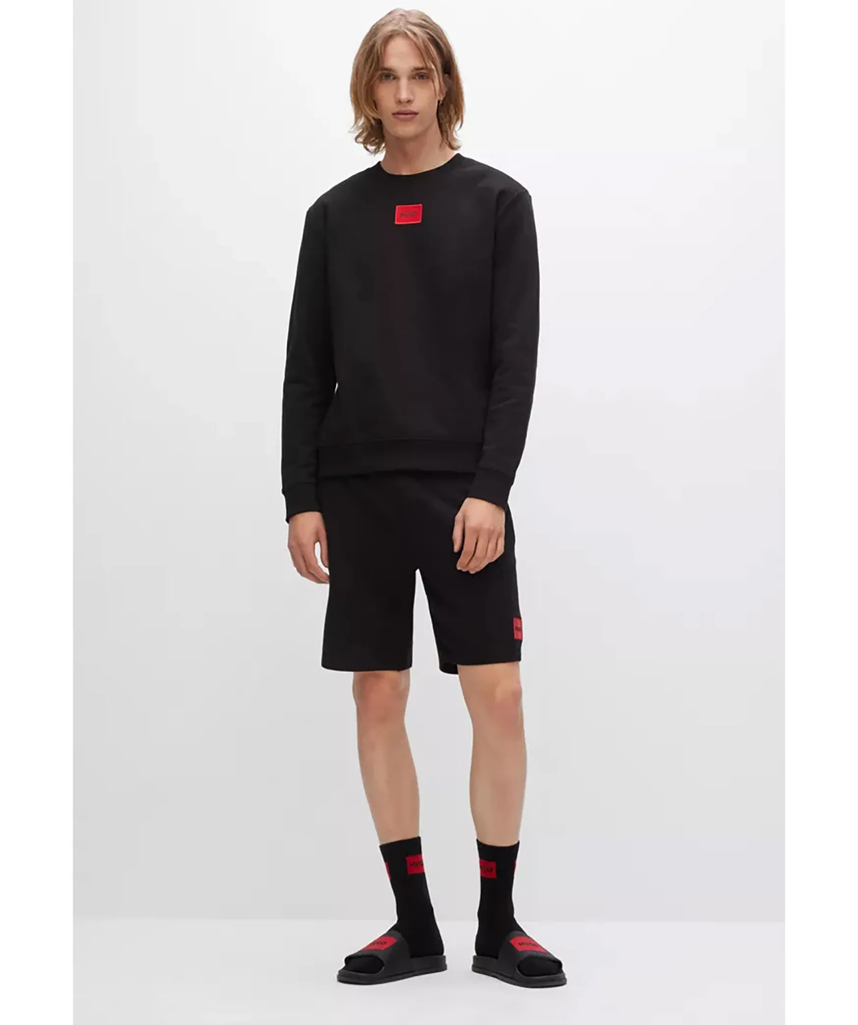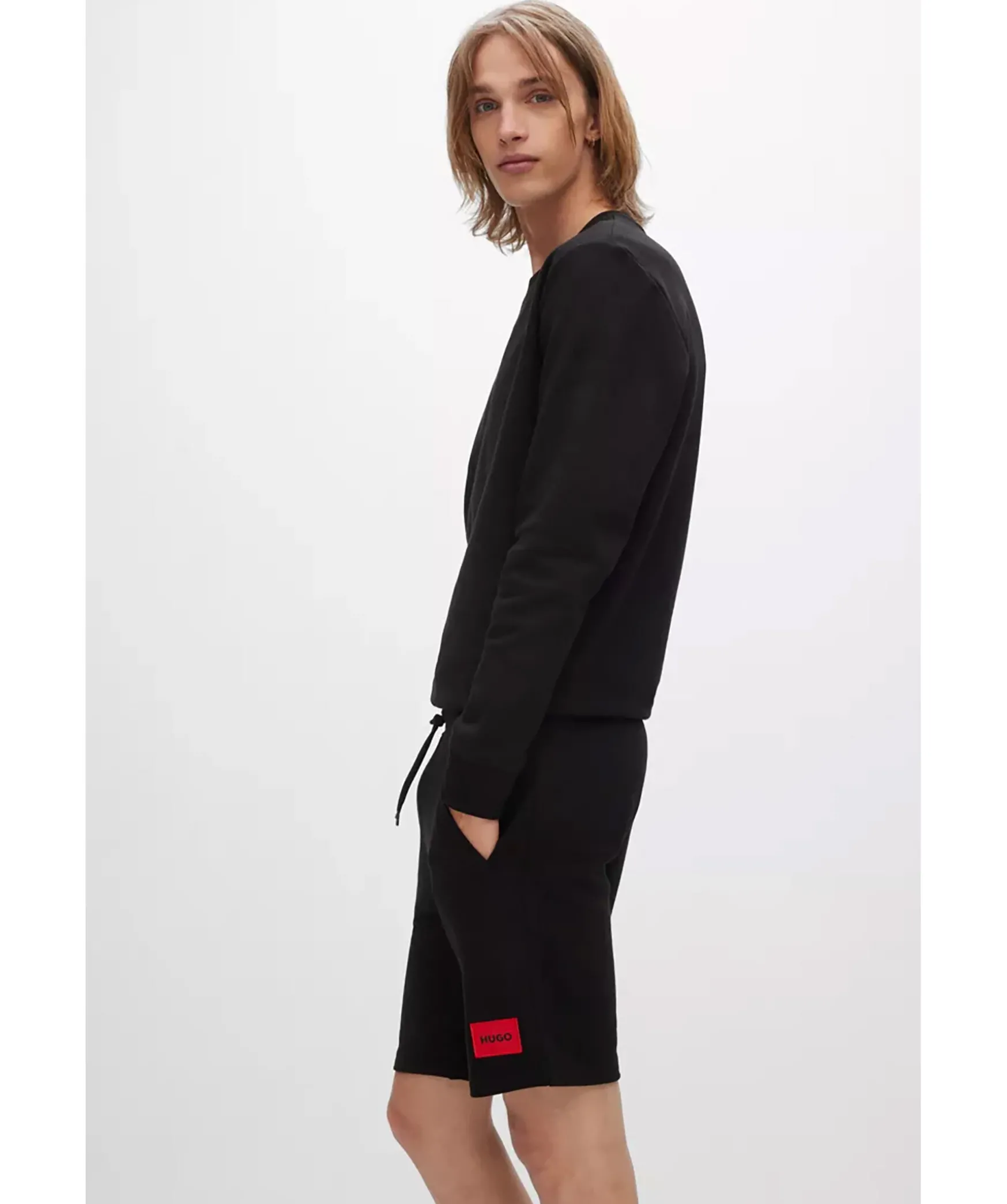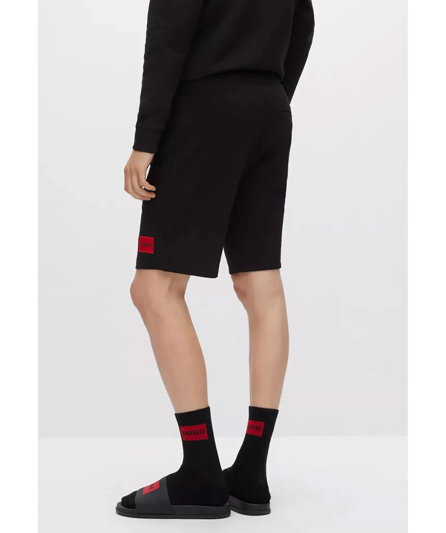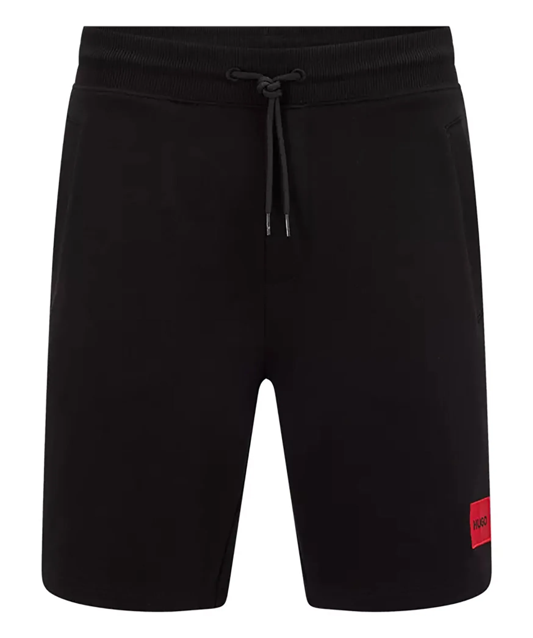 Svarta Mjukisshorts Fran Hugo. Rod Broderad Patch Pa Ena Byxbenet. Snorning I Midjan. Tva Framfickor Och En Bakficka.