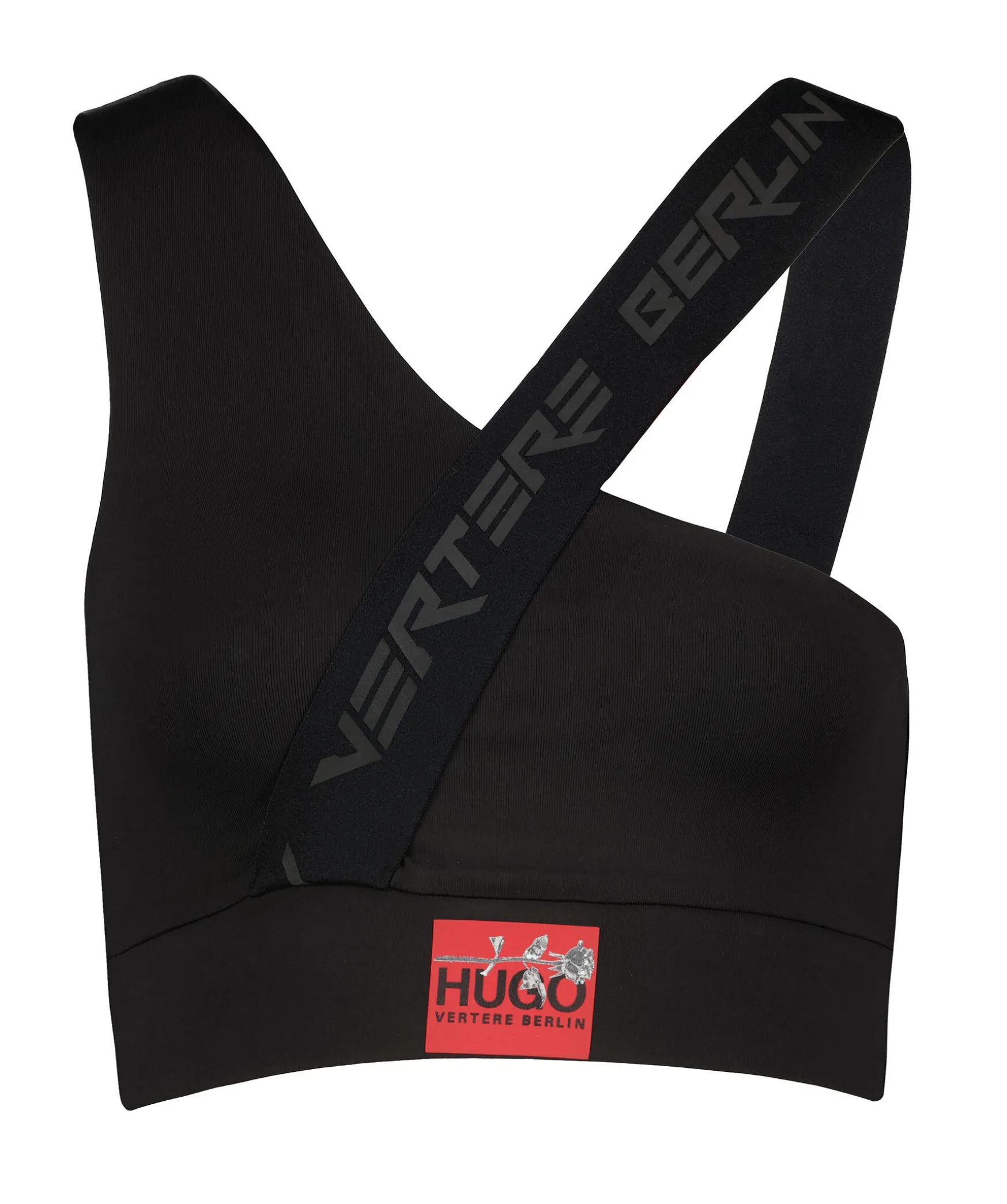 Svart Cropad Topp Fran Hugo Xvertere Berlin. One Shoulder Modell Med Resarband Med Logotyp Som Andra Axelband. Gummerad Logotyp I Rott Framtill. Bred Resar I Plaggslut. Utskuren Del I Ryggen.