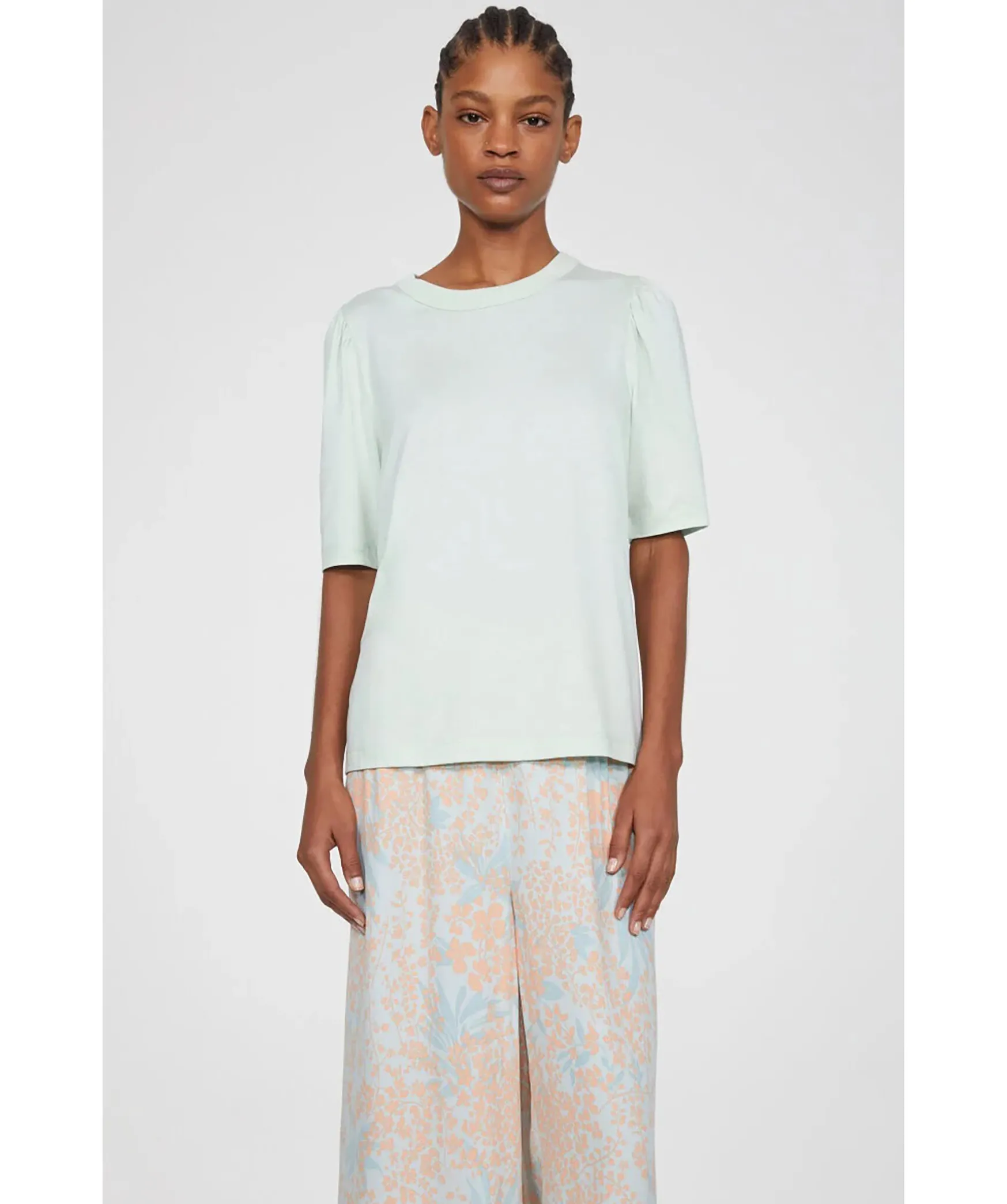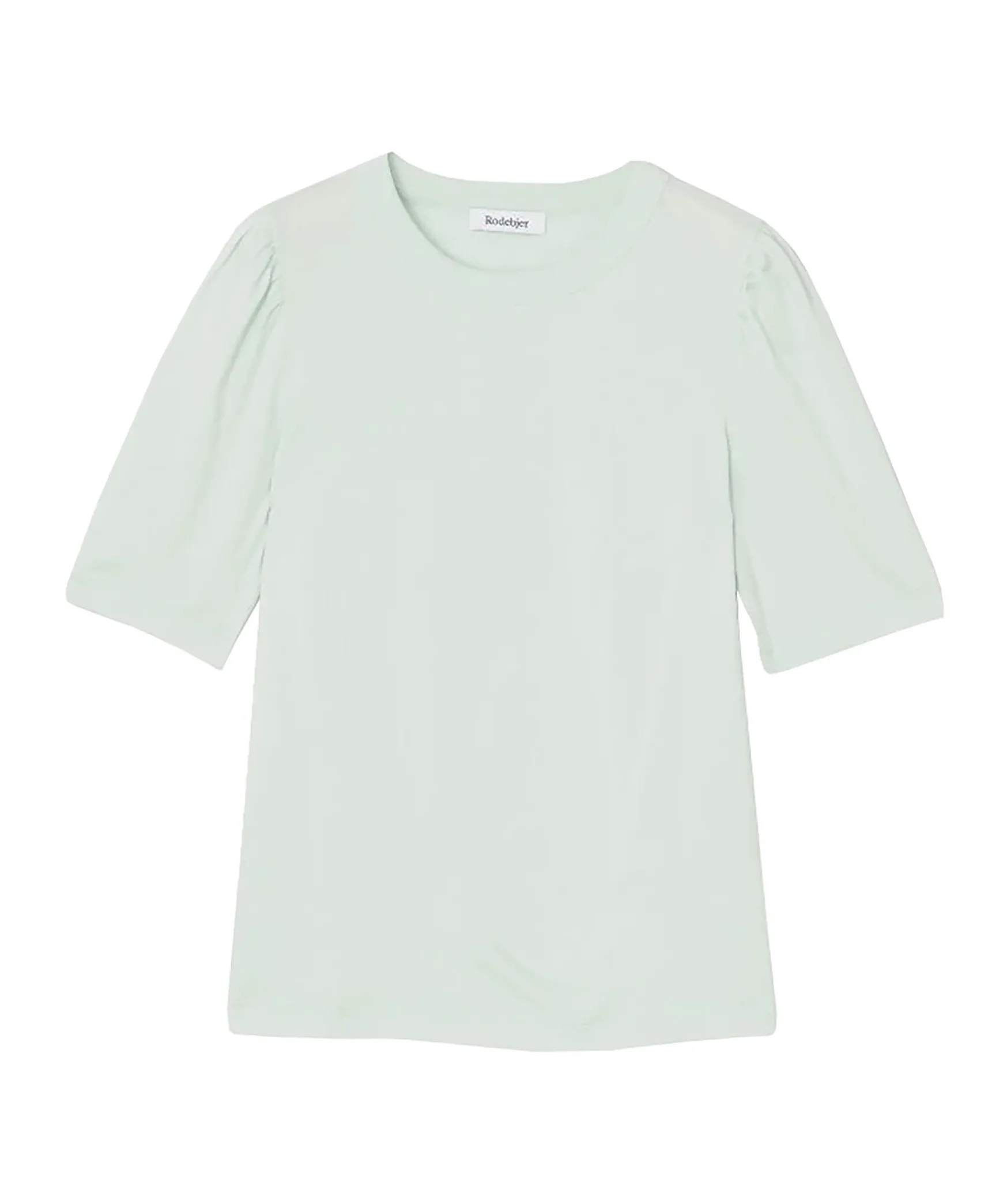 Mintgron T-Shirt Fran Rodebjer Med Puffarmar. Armen Slutar Strax Ovanfor Armbagen Och Har En Rundad Halsringning. Tillverkad I Lyocell Och Bomullsblandning. Modellen Ar 177Cm Lang Och Har Pa Sig Storlek S.