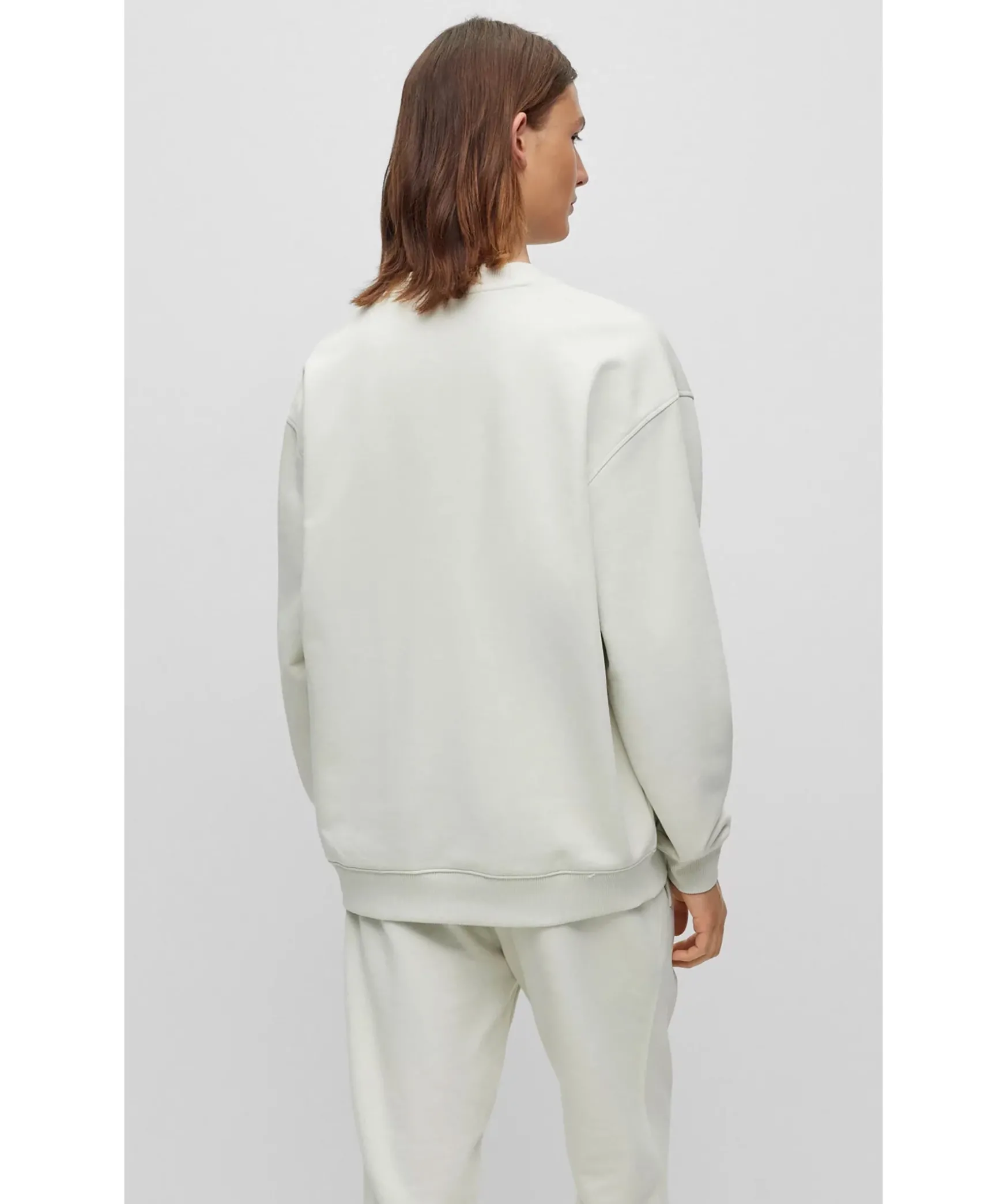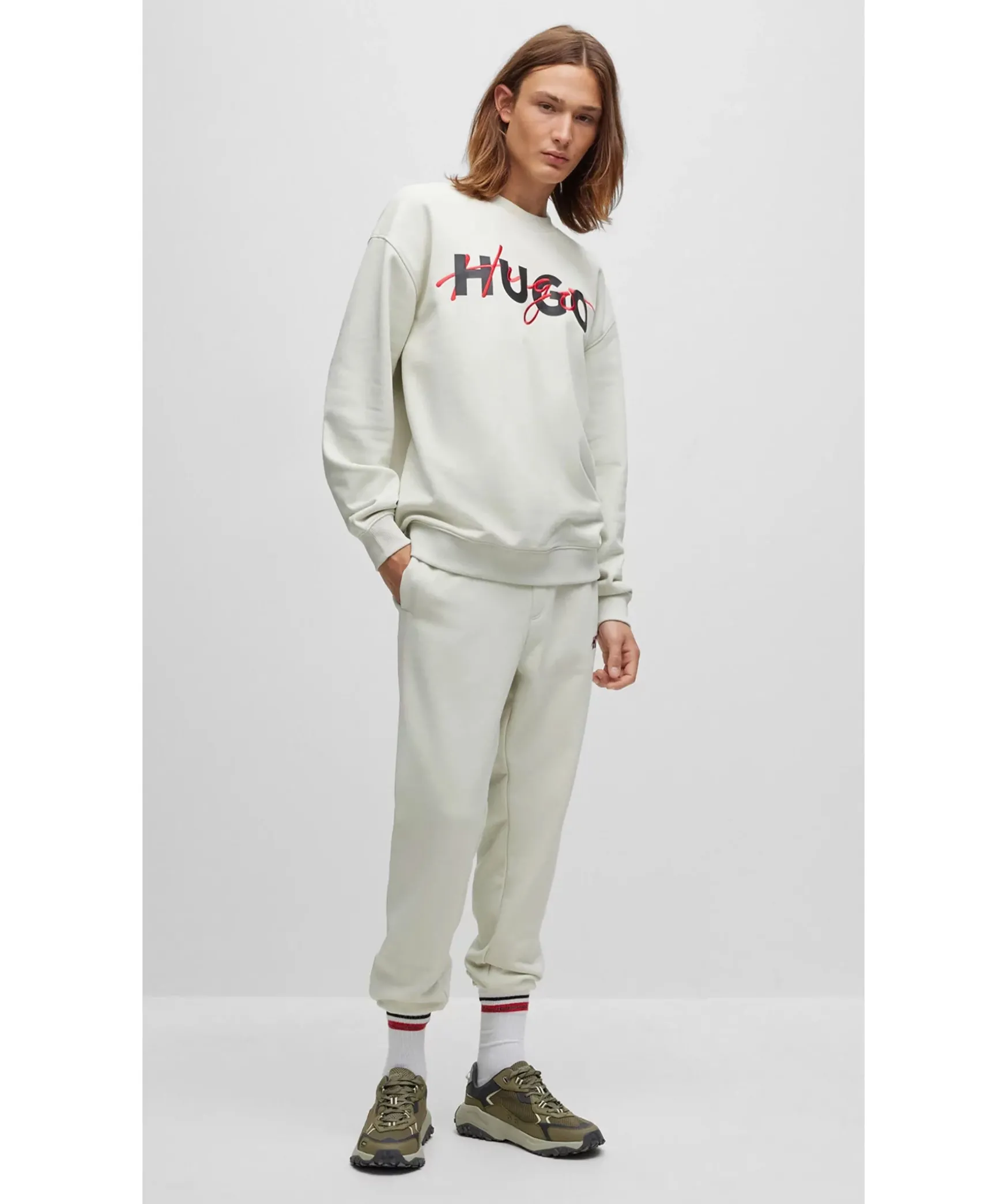 Beige Collegetroja Fran Hugo Men. Tryckt Logotyp I Svart Over Brostet, Broderad Logotyp I Rott. Ribbstickade Muddar Vid Arm- Och Plaggslut. Tillverkad I Bomullsblandning.