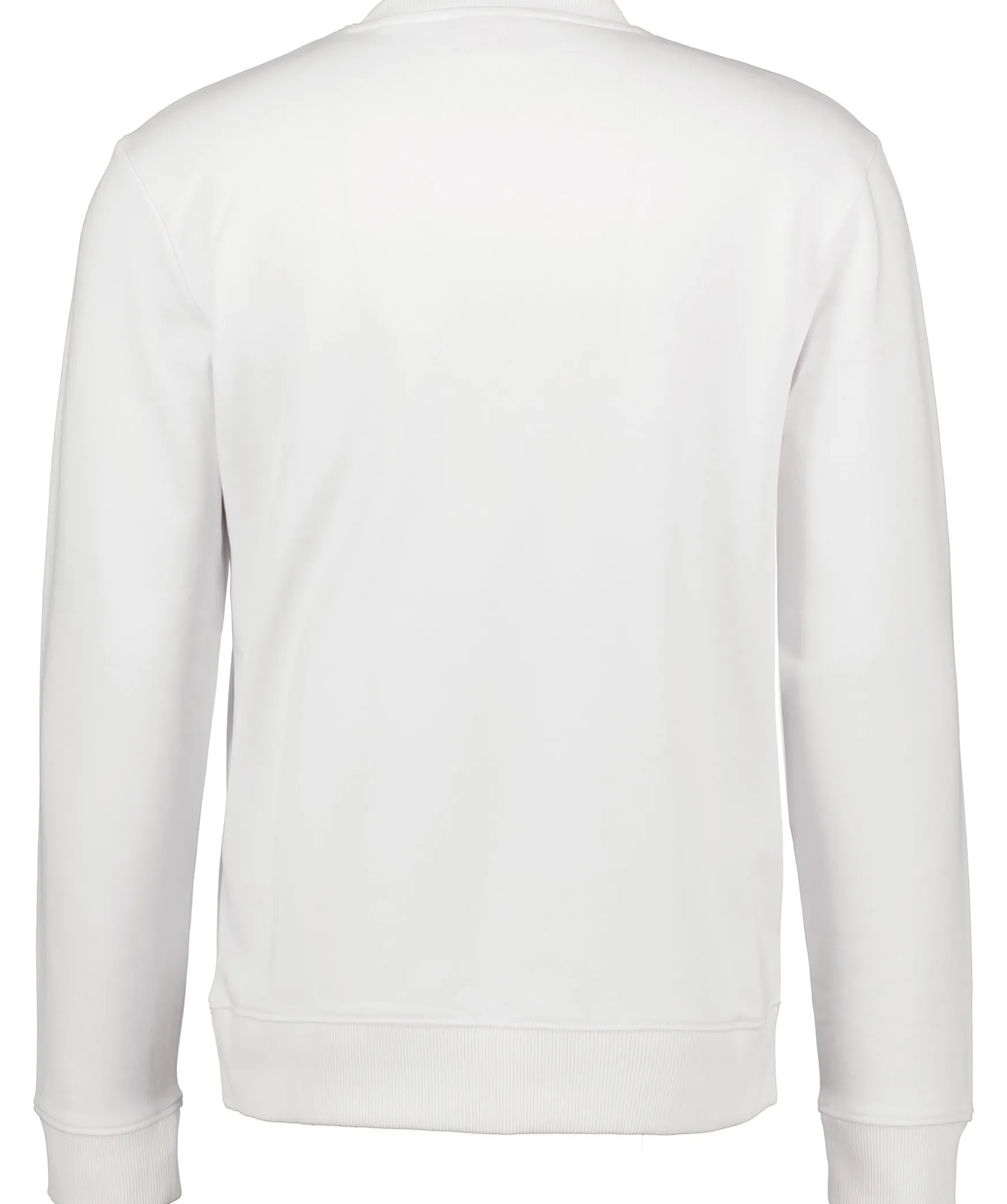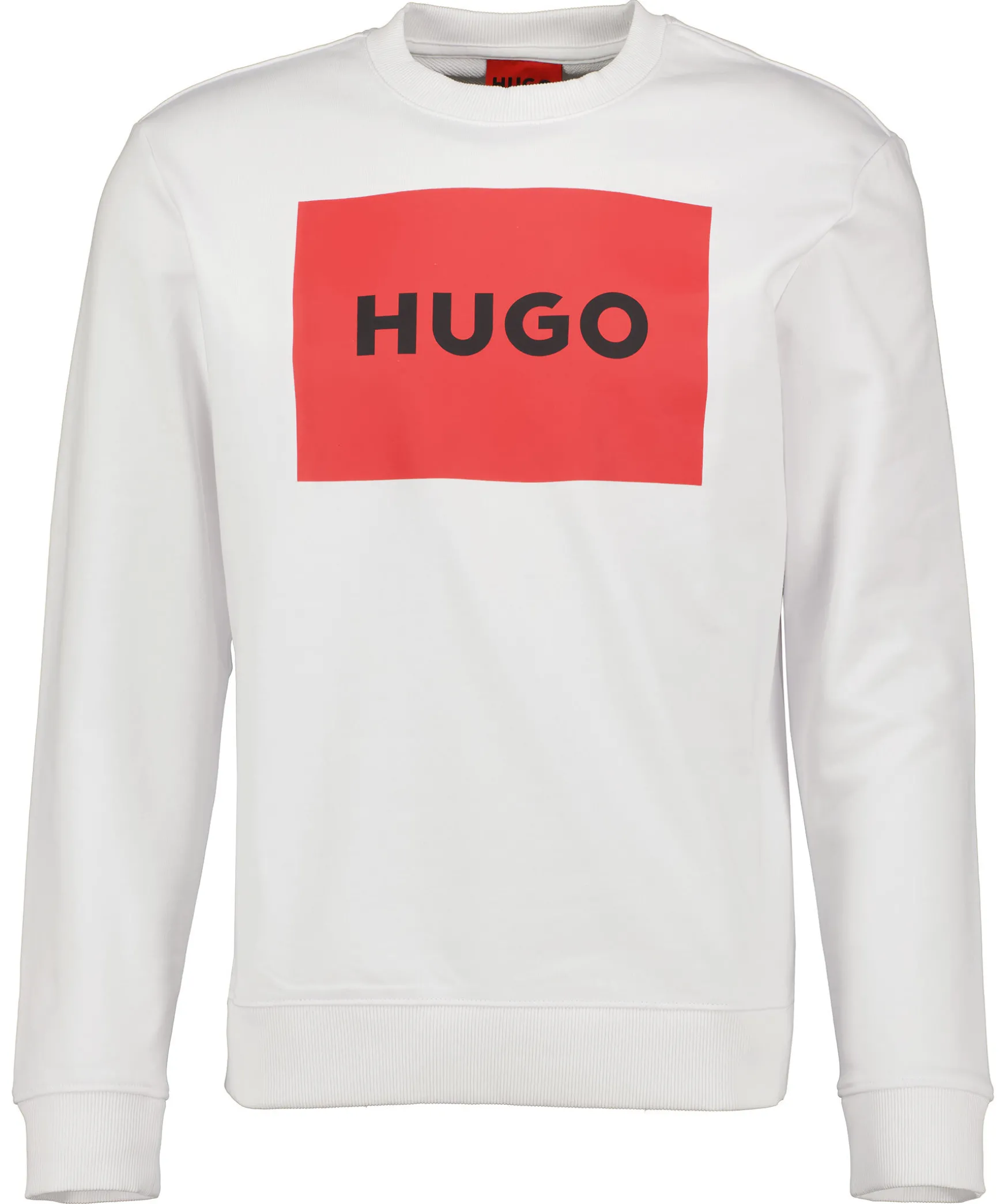Vit Sweatshirt Fran Hugo. Tillverkad I 100% Bomull, Har En Stor Rod Ruta Med Svart Logotyp Mitt Pa Brostet. Rundad Halsringning, Ribbade Muddar I Armslut, I Halsringning Och I Plaggslut.