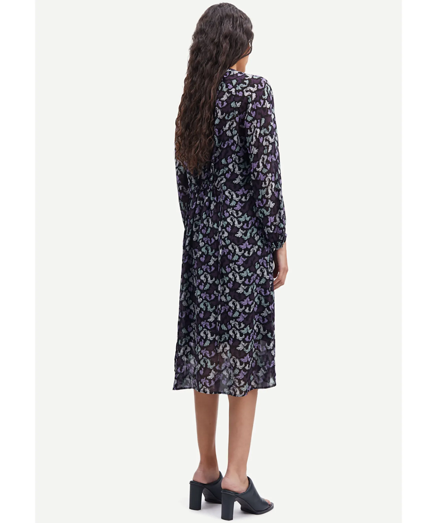 Lost Sittande Monstrad Midiklanning Med Langa Armar Fran Samsoe Samsoe. Dold Knappsla Framtill, Pintuckdetaljer Pa Brostet. Balte I Midjan Fast Mitt Bak Med En Tunnel Med Dragsko. Slipklanningsfoder Med Justerbara Axelband. 100% Viskostyg Med Tryckt Konstmonster I Lila.