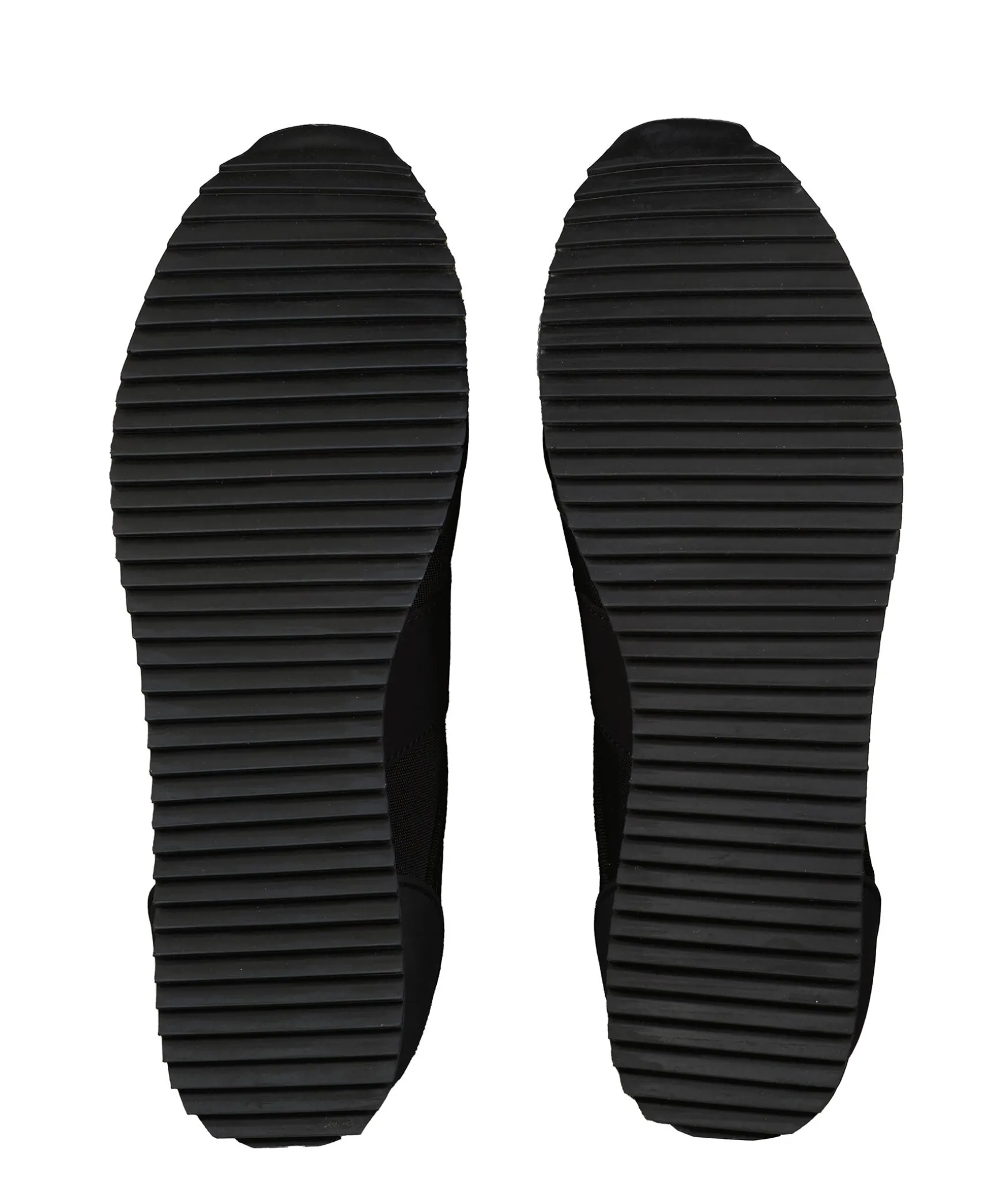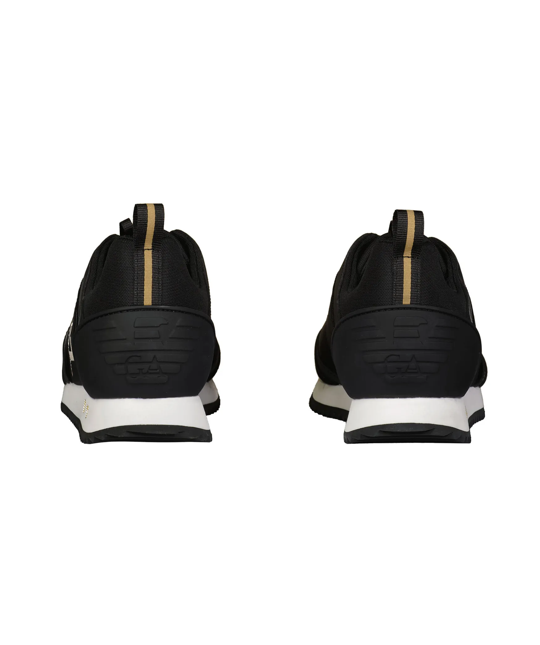Svarta Sneakers Fran Armani Ea7. Vit Sula Med Svart Undersida. Praglad Svart Logotyp Pa Halen. Guldig Logotyp Pa Utsidan Av Skon. Guldigt Streck Pa Plosen Och Halen. Svarta Skosnoren.