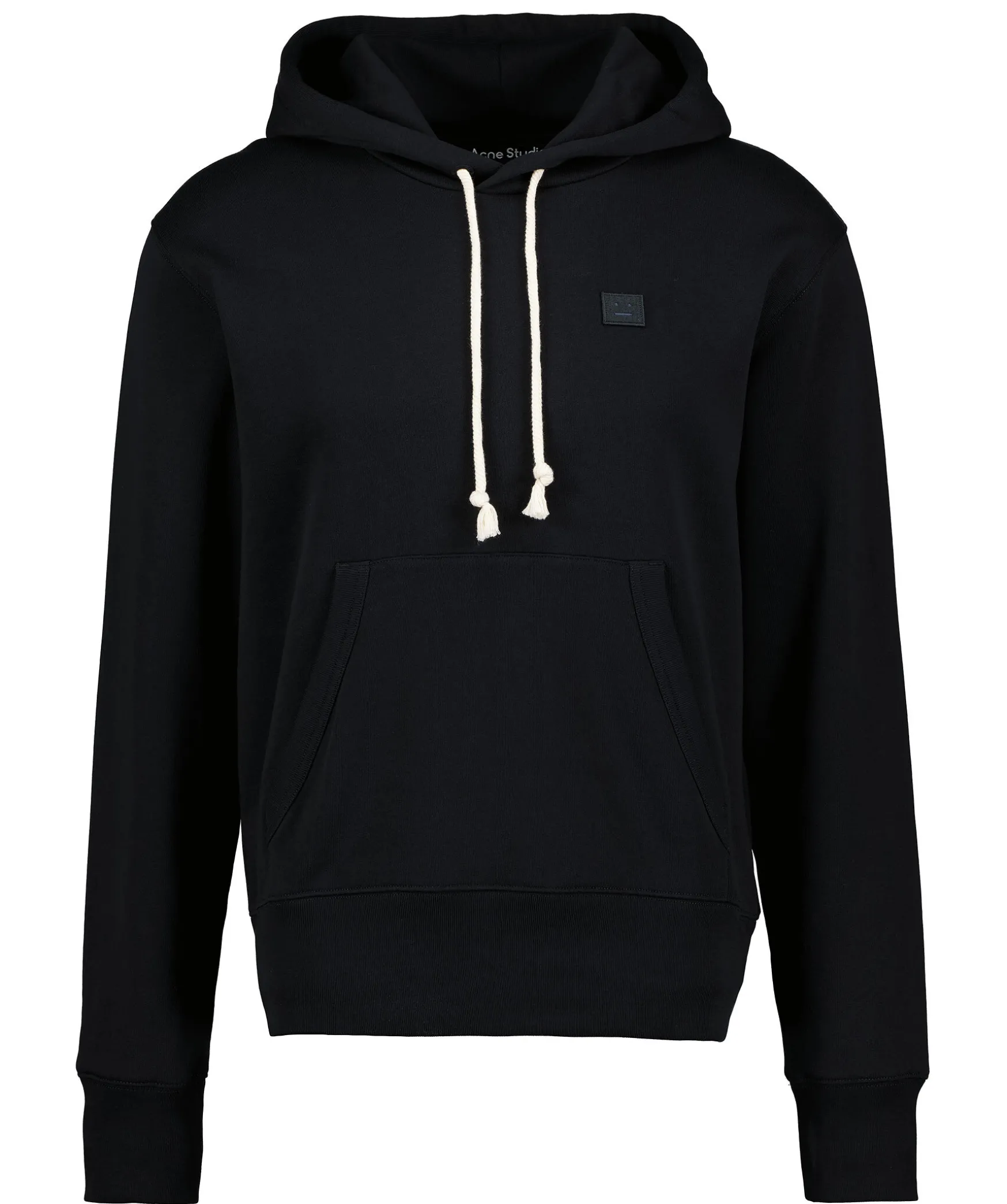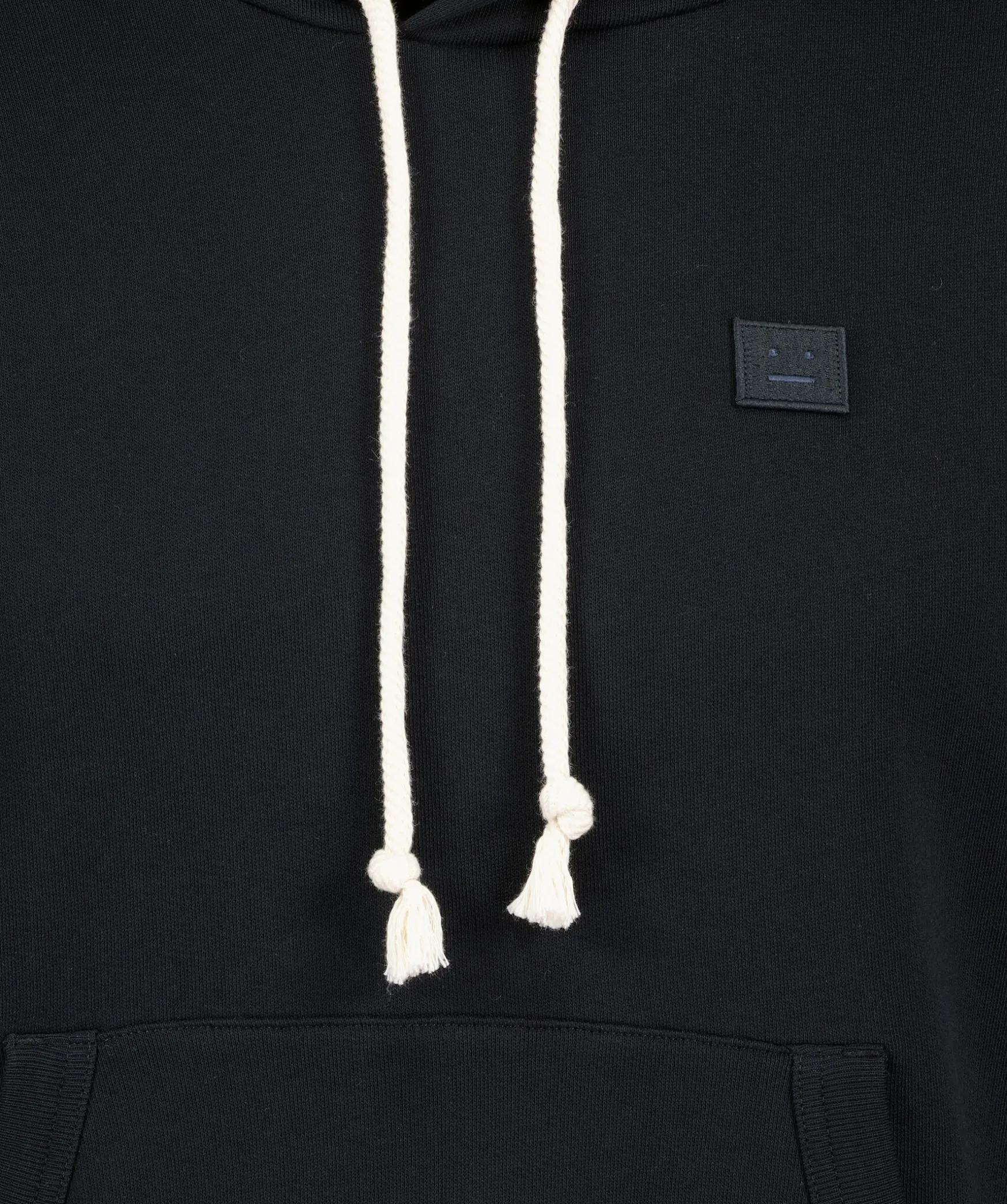 Svart Hoodie Fran Acne Studios. Luva Med Vit Snorning. Kanguruficka Pa Magen. Patch Med Face Logotyp Pa Vanster Brost. Tillverkad I 100% Bomull. Ribbstickade Muddar Vid Arm- Och Plaggslut.