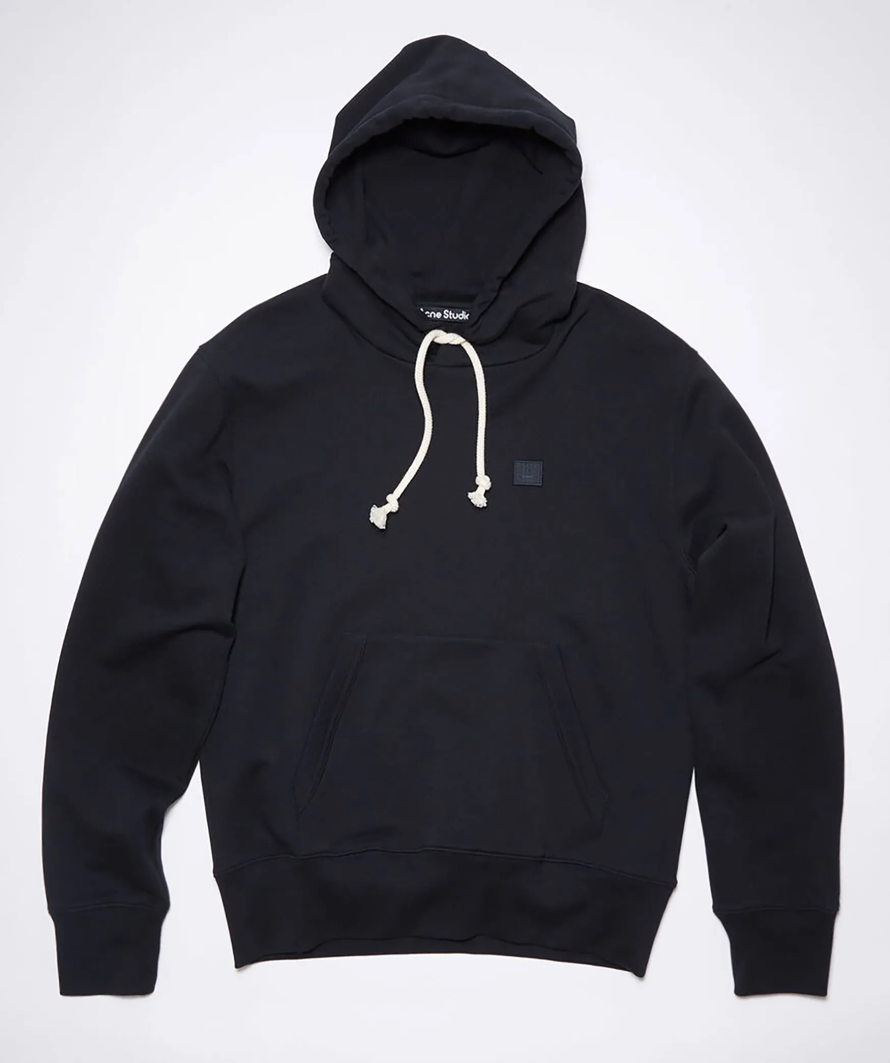 Svart Hoodie Fran Acne Studios. Broderad Face-Logotyp Pa Vanster Brost. Kanguru Ficka Pa Magen. Luva Med Dragsko I Vita Snoren. Ribbstickade Muddar Vid Arm- Och Plaggslut. Tillverkad I 100% Bomull.