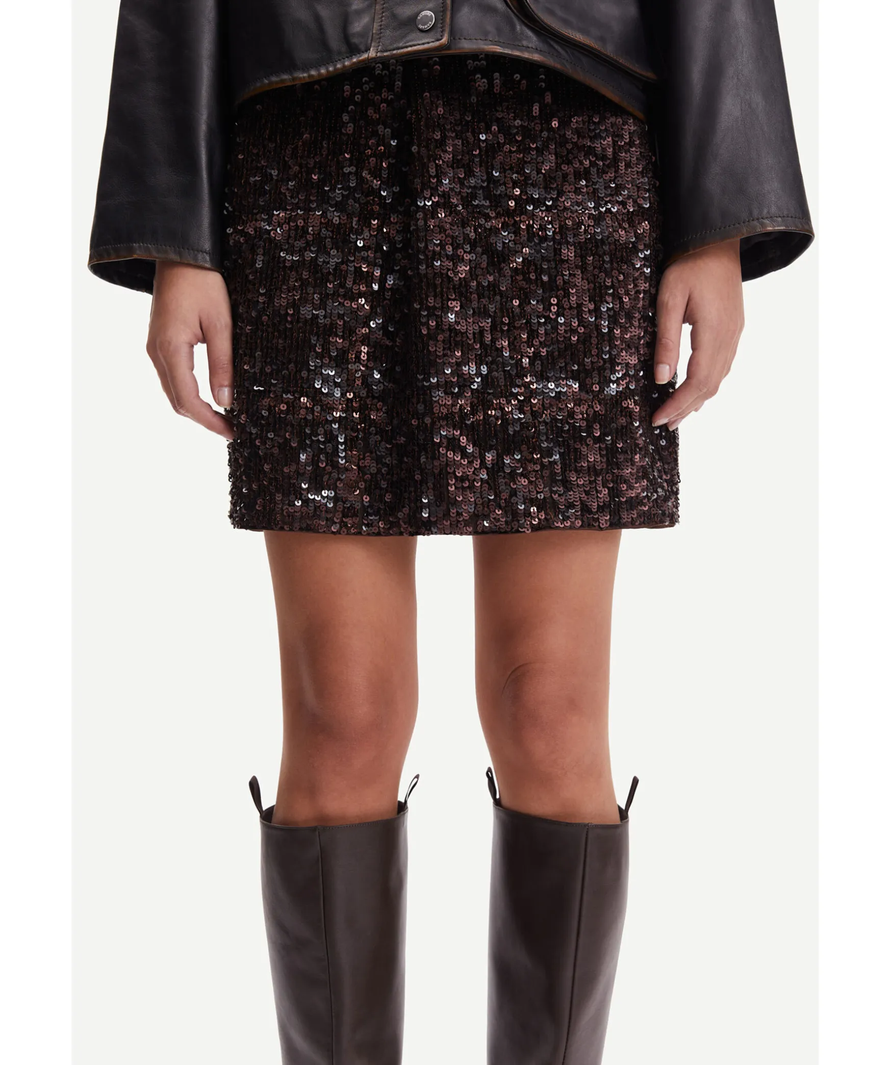 Morkbrun Paljettkjol Fran Samsoe Samsoe. Dragkedja Langst Med Kjolens Vanstra Sida. Kjolen Har Ett Foder I Polyester.