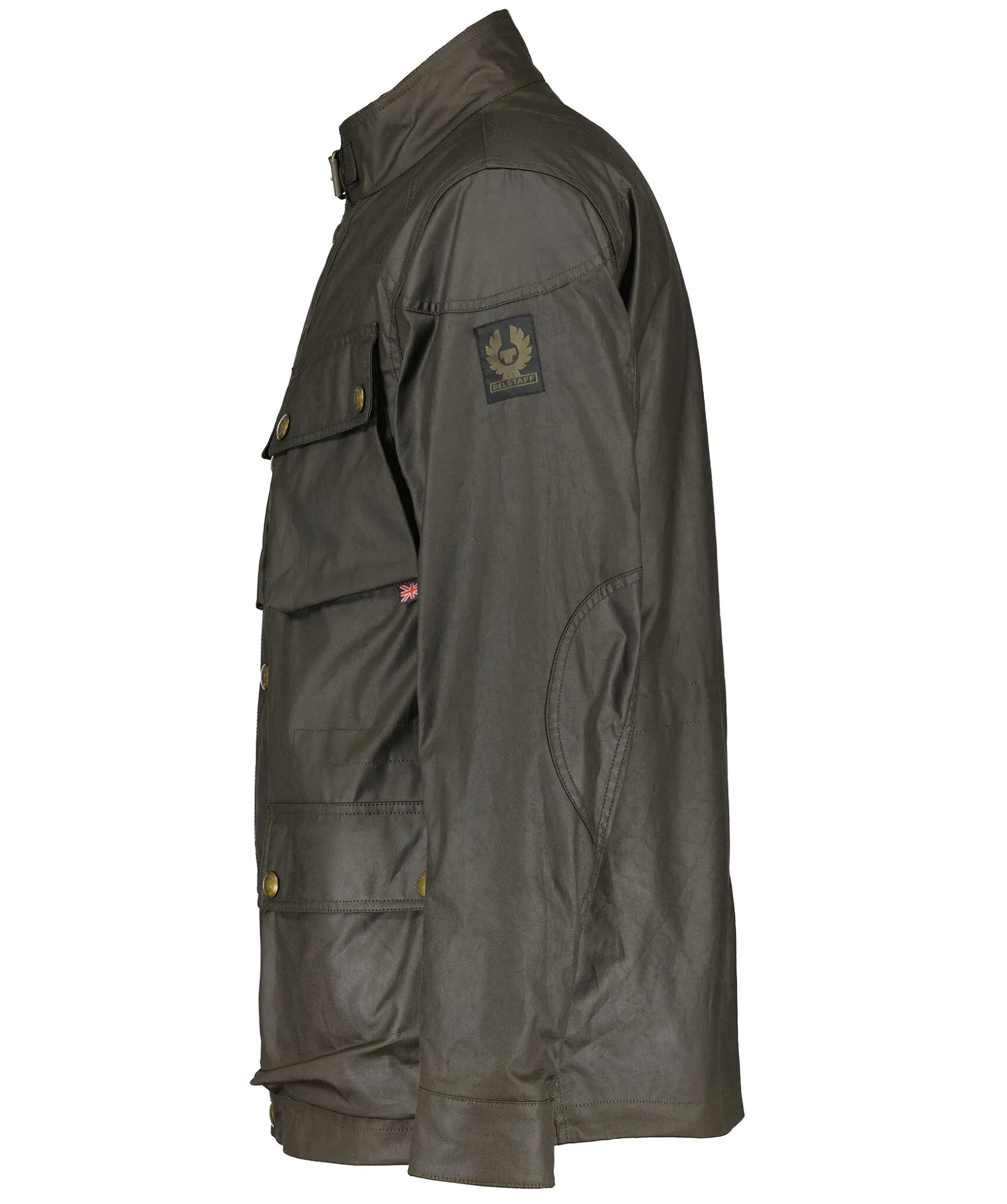 Morkgron Jacka Fran Belstaff. Stangs Framtill Med Dragkedja Och Tryckknappar. Krage Med Spanne Och Fodrad Med Manchester. Justerbara Armslut Med Tryckknappar. Dragsko I Midjan. Patch Med Logotyp Pa Vanster Arm.Jackan Ar Tillverkad I Ett Vaxat Bomullstyg.