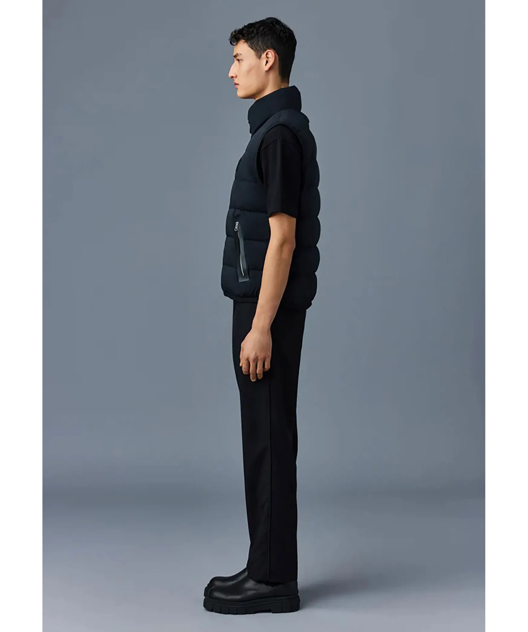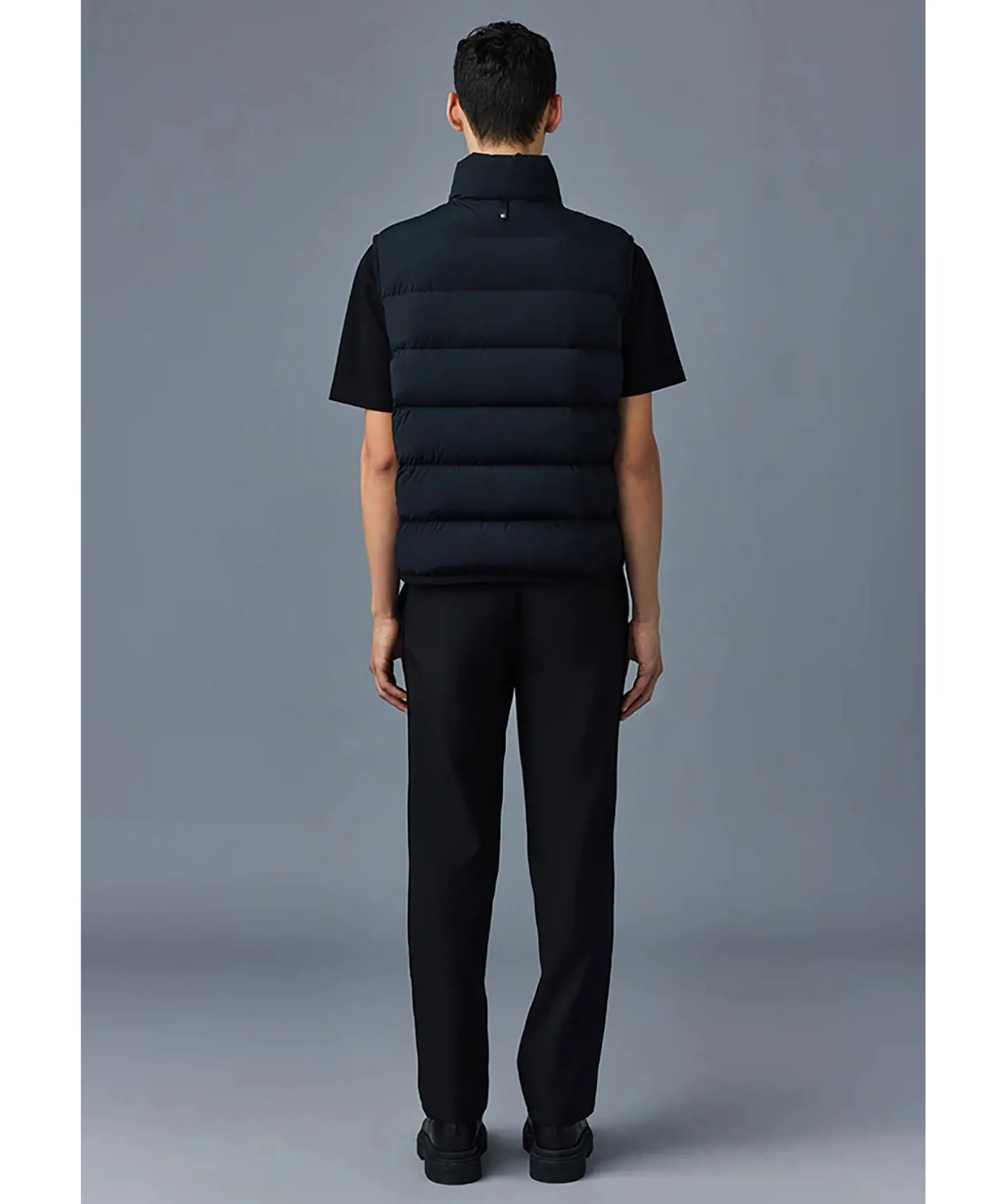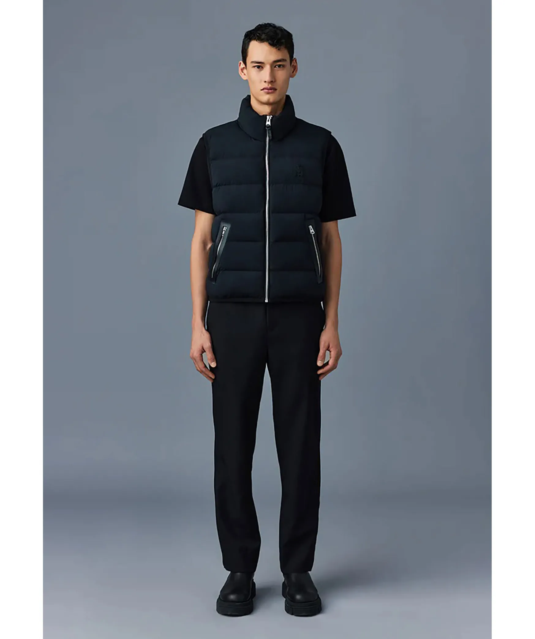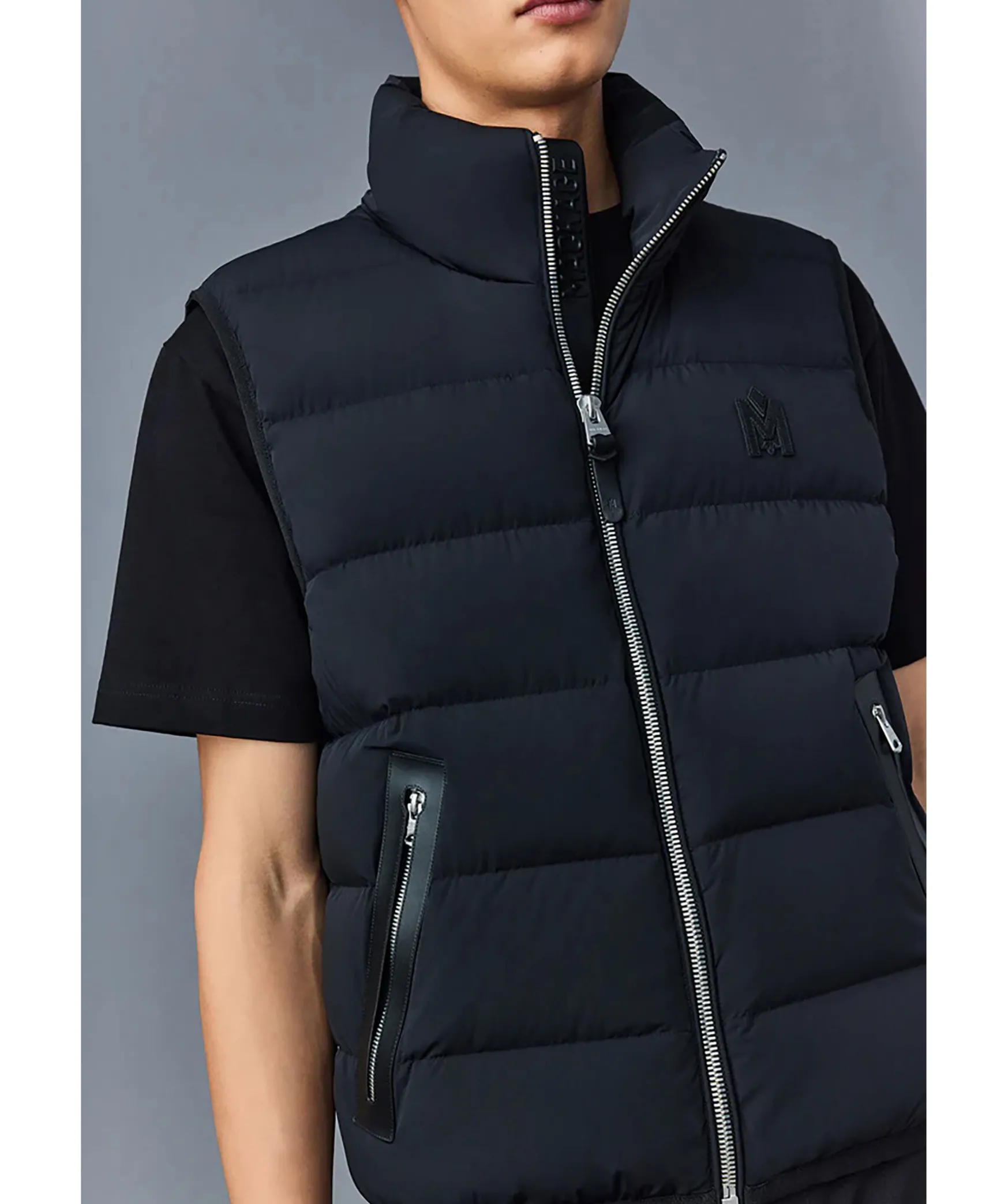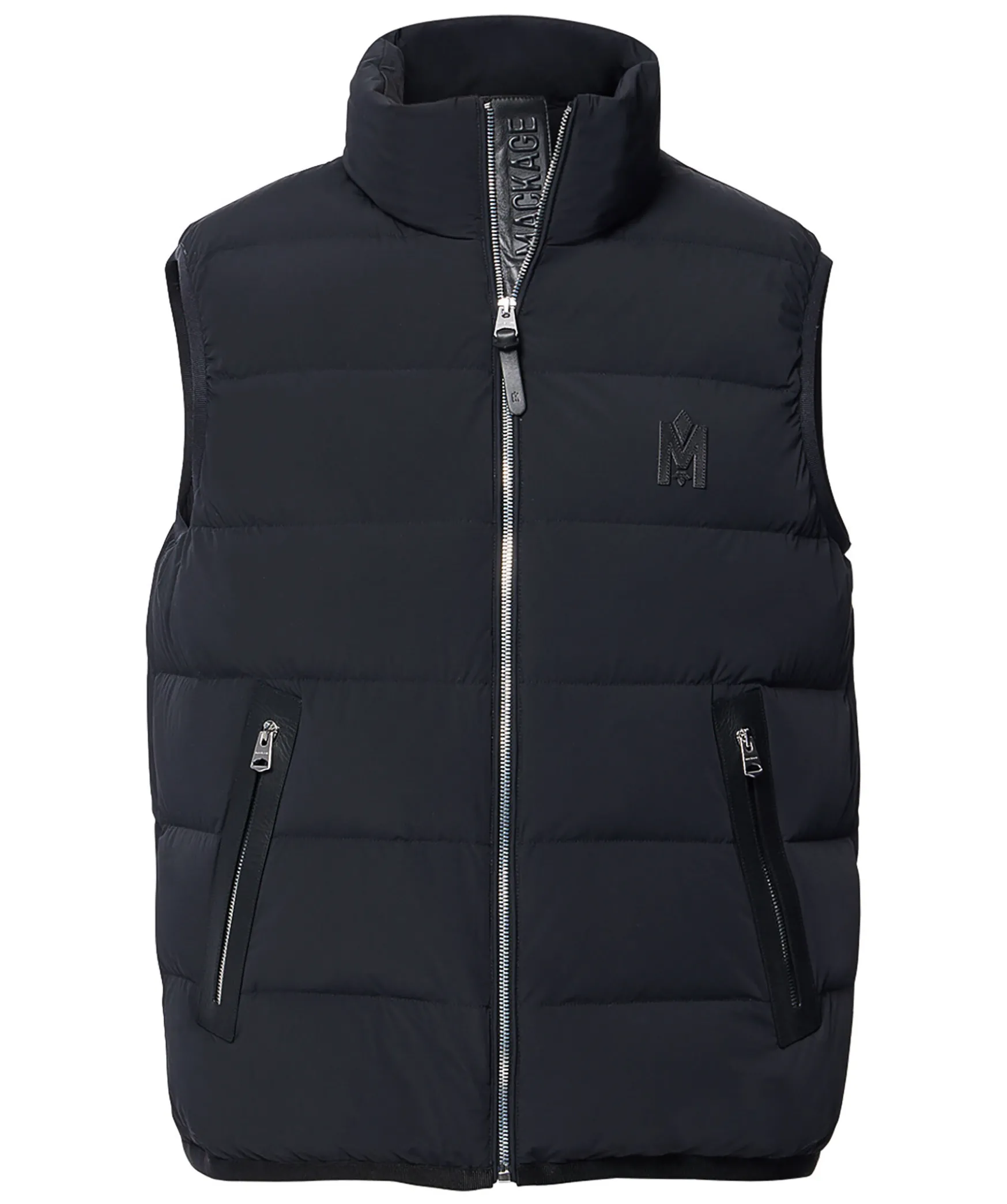 Svart, Latt Dunvast Fran Mackage. Hog Krage Och Dragkedja Med Ladersla Framtill. Quiltad Med Dunfyllnig Och Tyg I 2-Vags Stretch Som Ar Vattenavvisande. Fickor I Midjan Med Dragkedja Som Har Kanter I Lader. Tunn, Elastisk Mudd I Nederkant Och Armhal. Ett M I Lader Broderat Fram Pa Vanster Sida Av Brostet. Langd Fran Axel Till Nederkant: 66,04 Cm.