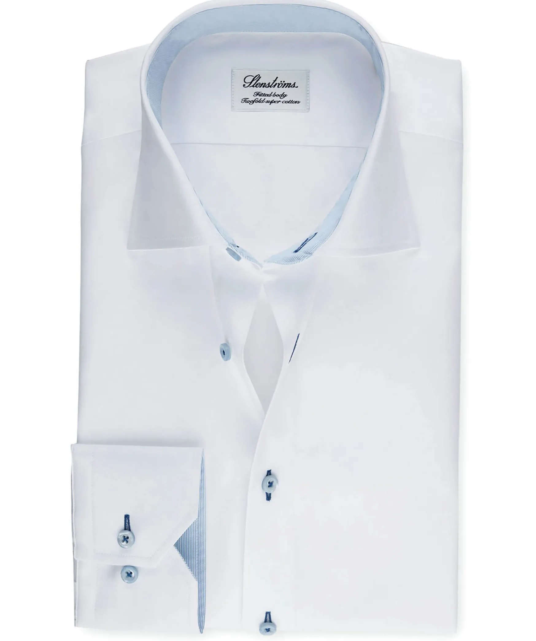 Vit Skjorta Fran Stenstroms. Blaa Kontrastdetaljer, Enkel Manschett, Fitted Body, Moderate Cut Away Krage. Tillverkad I 100% Bomull.*Bla Kontrastdetaljer*Fitted Body*100% Bomull