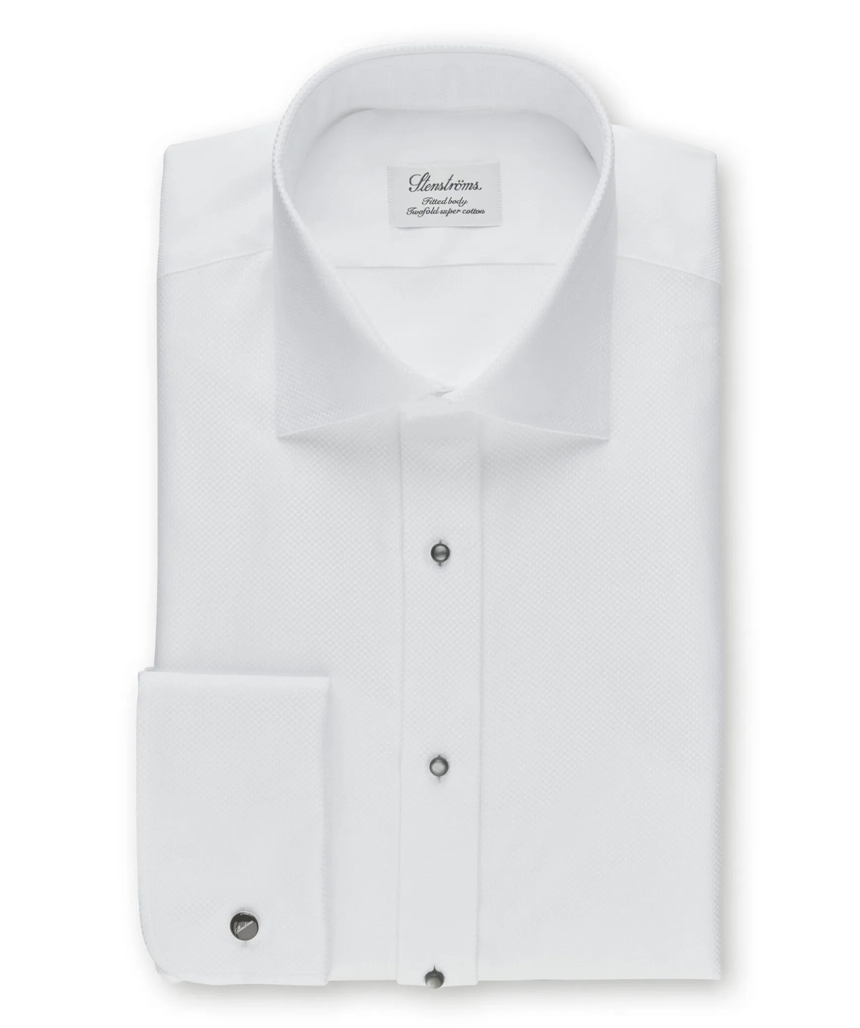 Sofistikerad Evening-Skjorta Fran Stenstroms, Gjord Av Textured Twill Och Skuren For En Nagot Skraddarsydd Passform. Detaljerad Med Knappsla, 4 Hal For Studs, Dubbla Manschetter Och En Moderate Cut Away-Krage. Den Texturerade Ytan Gor Att Den Ar Ett Fint Alternativ Till Den Klassiska Vita Evening-Skjortan. Kombinera Med En Fluga Och Kostym.