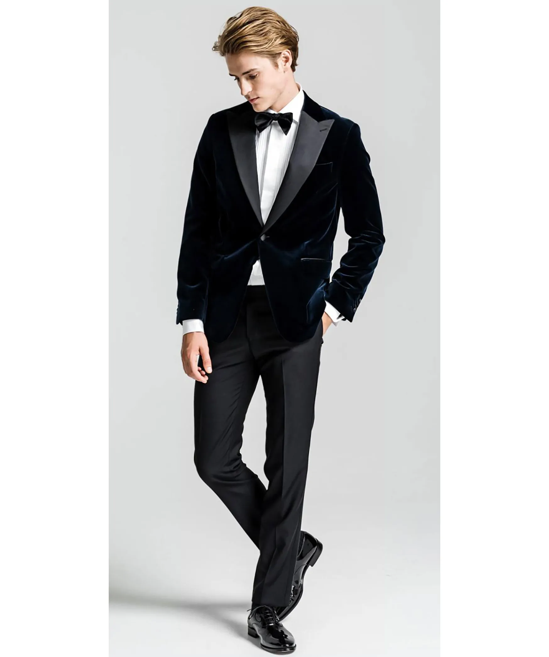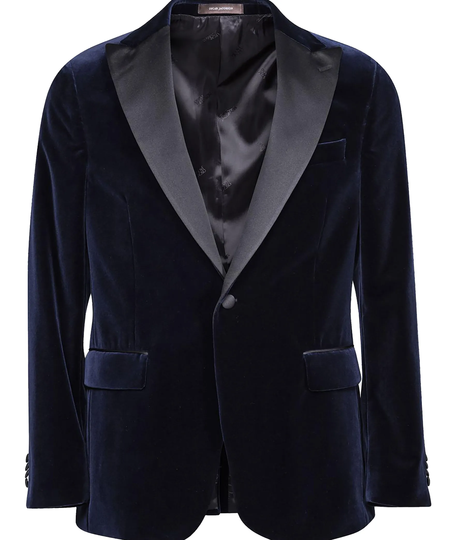 Midnattsbla Smokingkavaj Fran Oscar Jacobson I Sammet. Kavajen Har Spetsiga Slag I Siden Samt Enkelt Sprund. Tva Fickor Med Lock Fram Samt Brostficka. Insidan Pryds Av Tva Fickor Och Biljettficka. Kladda Knappar I Stangning Och Manschett.