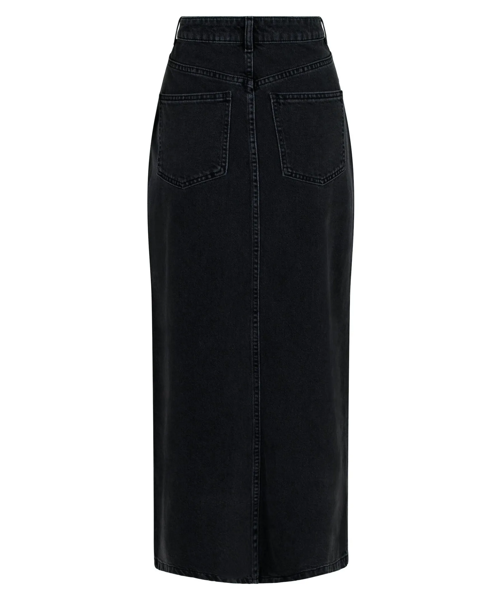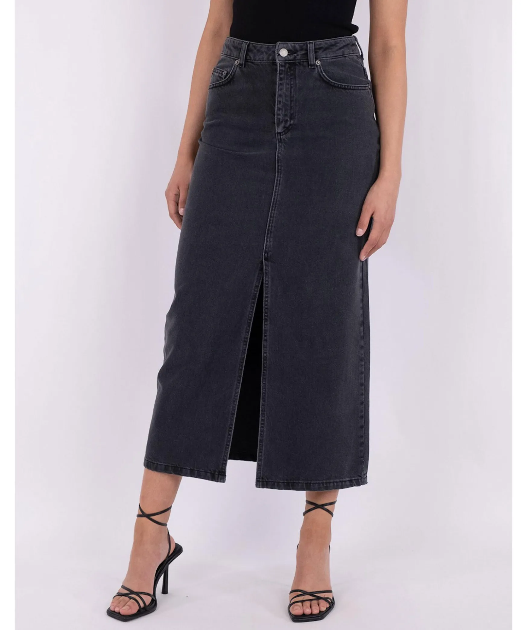 Svart Denim Maxikjol Med Slits Framtill, Dragkedja Och Knapp. Kjolen Har Fickor Fram Och Bak. Modellen Ar 176 Cm Och Bar Storlek C36.