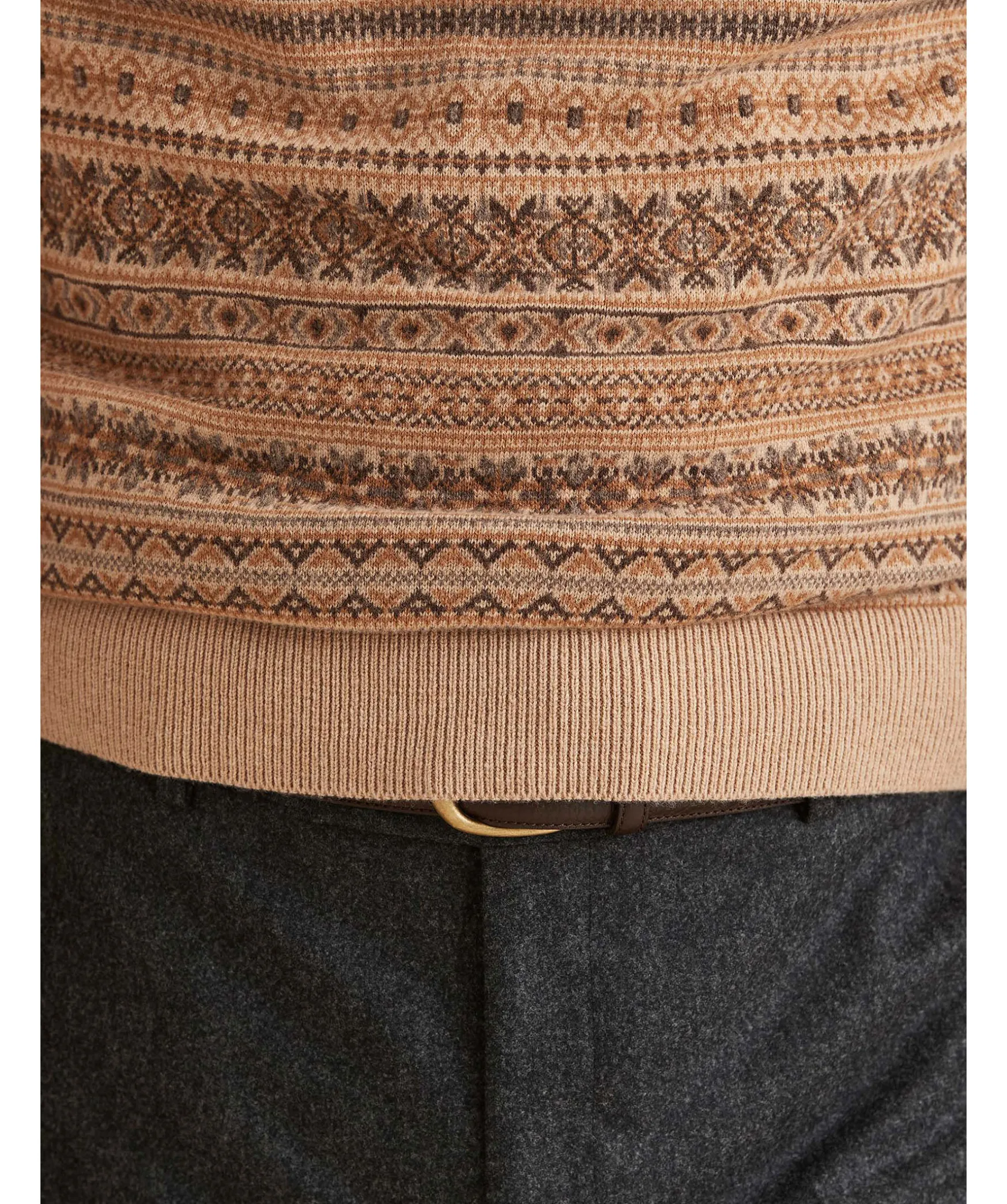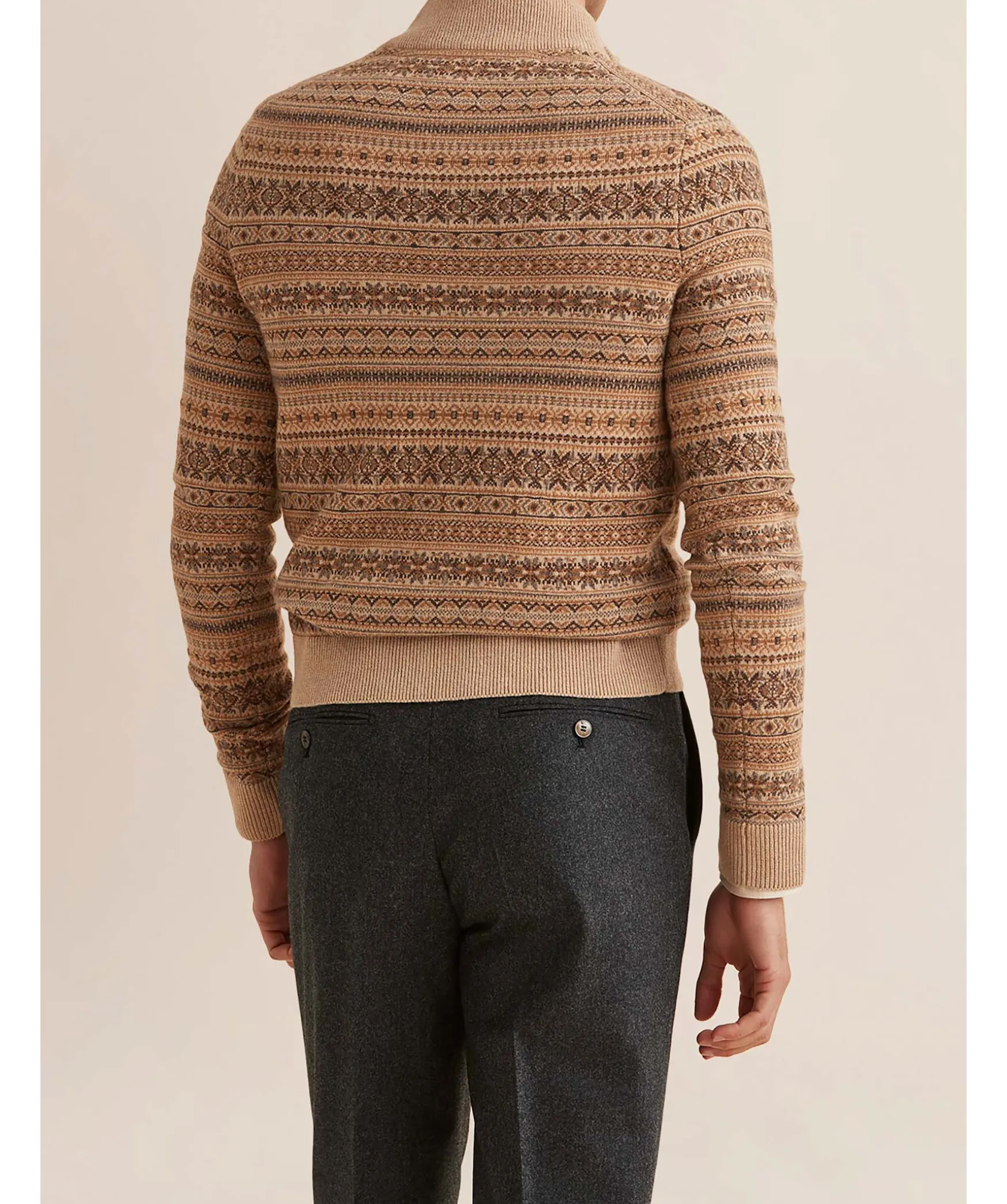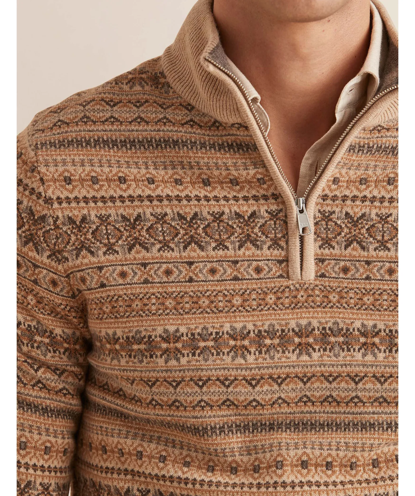 Beige, Brun Och Gra Monstrad Stickad Half-Zip Fran Morris Heritage. Ribbstickad Krage, Muddar Vid Arm- Och Plaggslut. Tillverkad I Ullblandning.