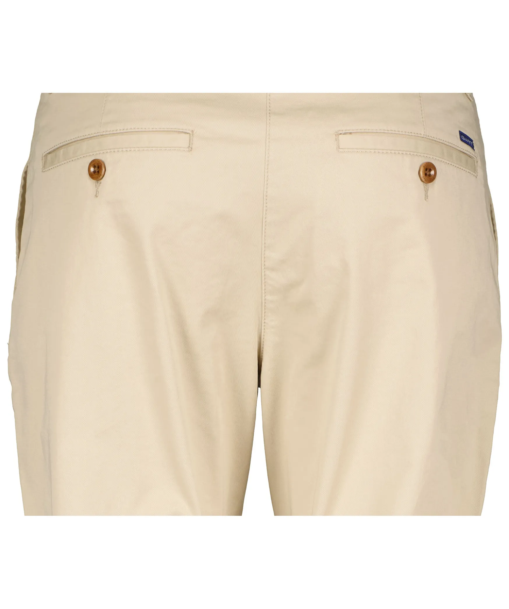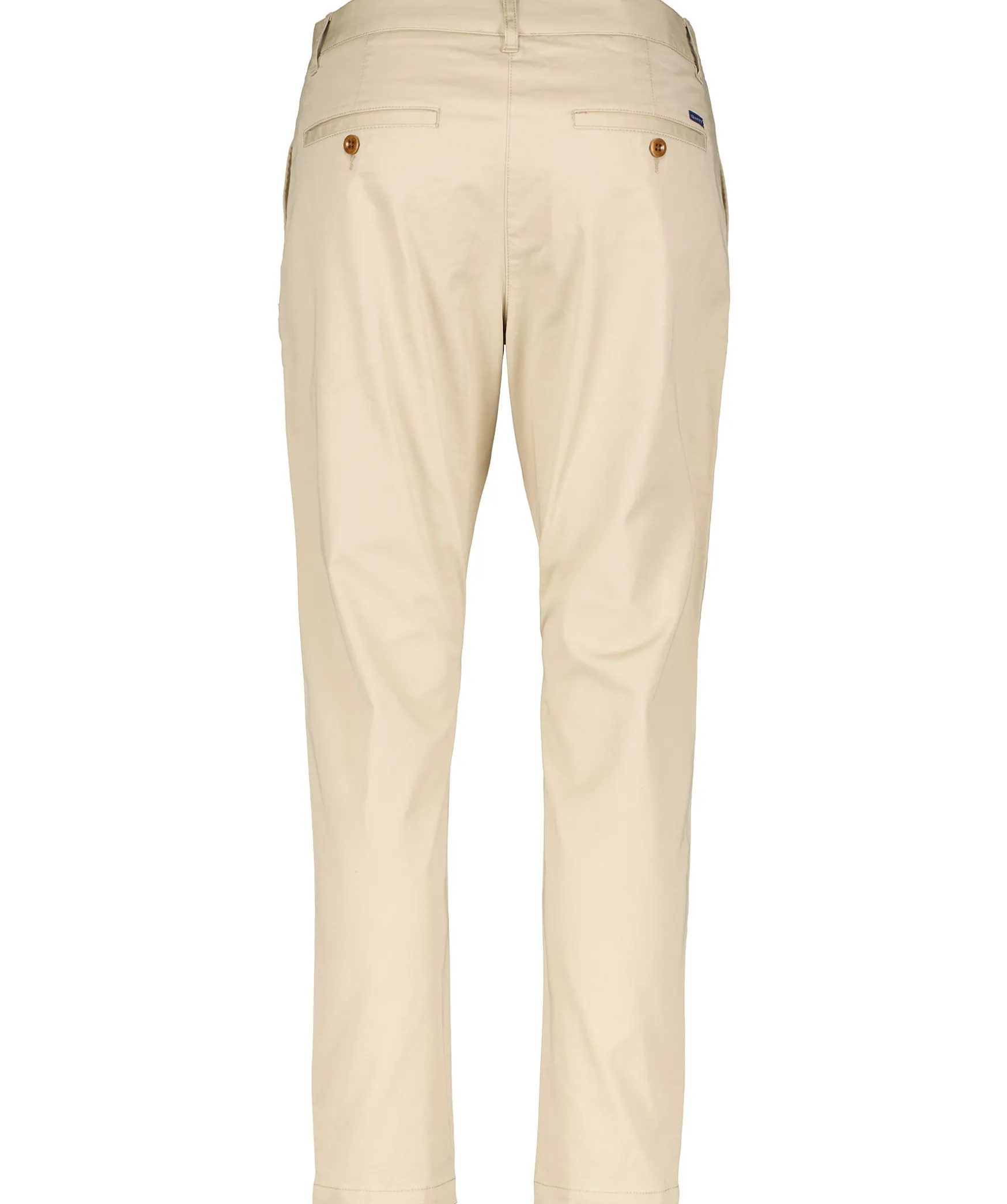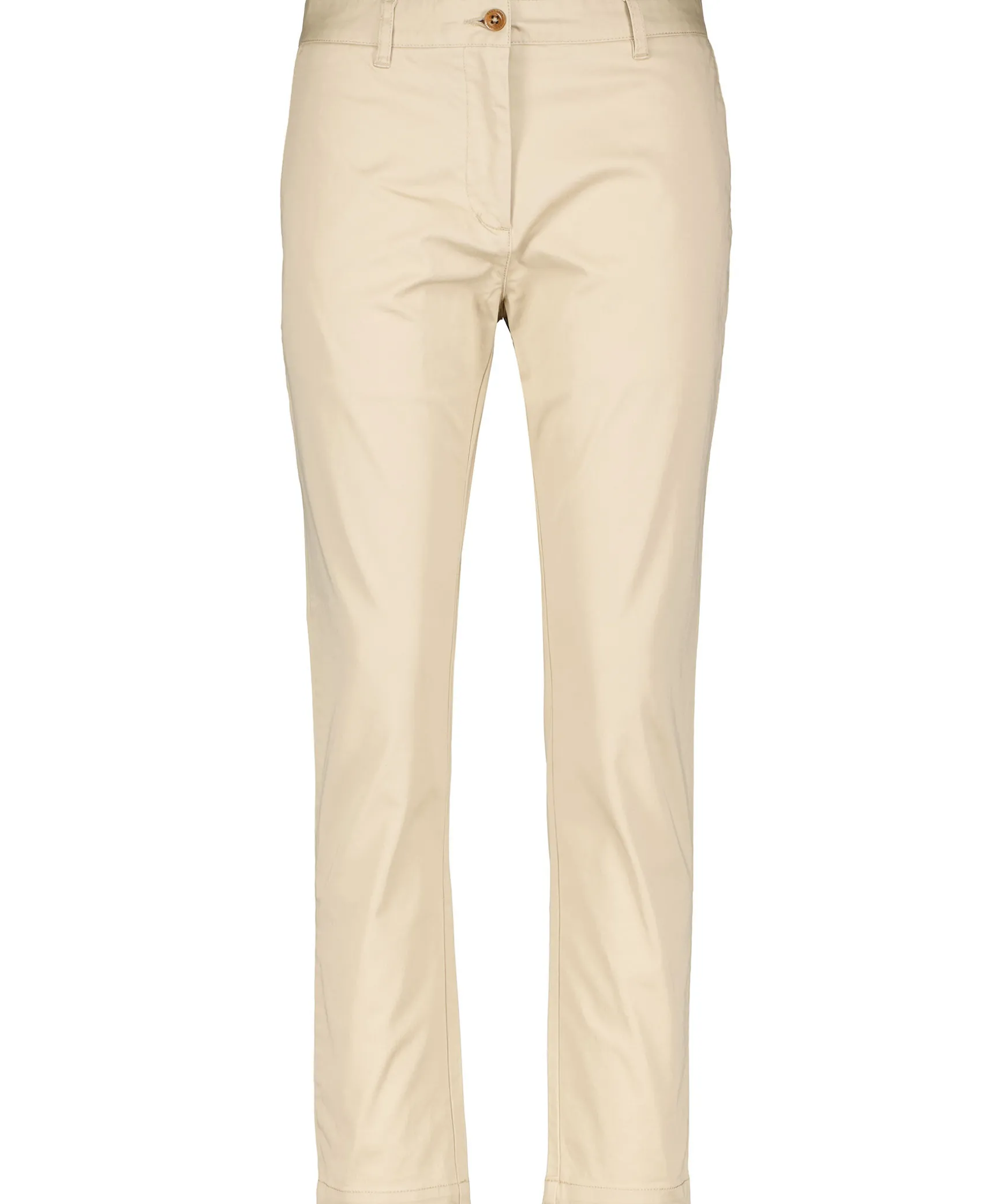 Beigea Chinos Fran Gant. Mellanhog Midja Med Smala Ben. Byxorna Ar Sma I Storleken, Vi Rekommenderar Att Ga Upp En Storlek. Ankellang Passform Pa Byxorna. Tva Fickor Framtill, Tva Fickor Baktill Som Stangs Med Knapp. Patch Med Logotyp Over Hoger Bakficka.