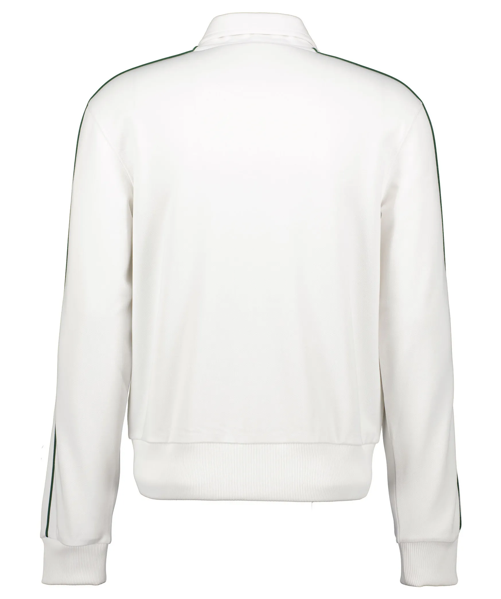 Vit Tracksuit Jacka Fran Lacoste. Stangs Framtill Med Dragkedja. Revarer Med Morkgrona Detaljer Langst Armarna. Ribbstickade Muddar Vid Arm- Och Plaggslut. Broderad Patch Med Logotyp Pa Vanster Brost.
