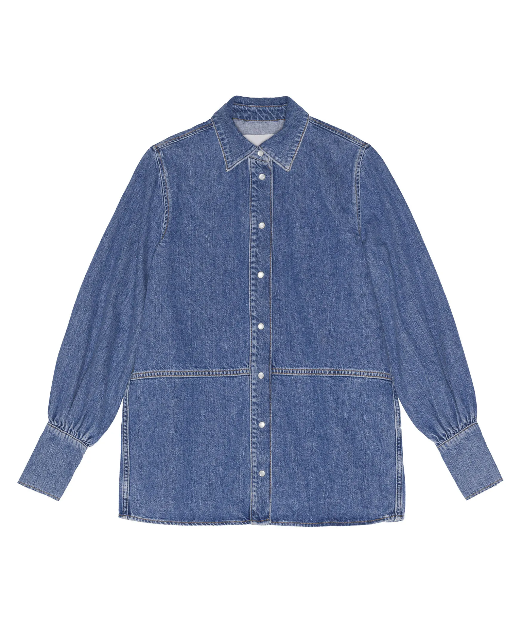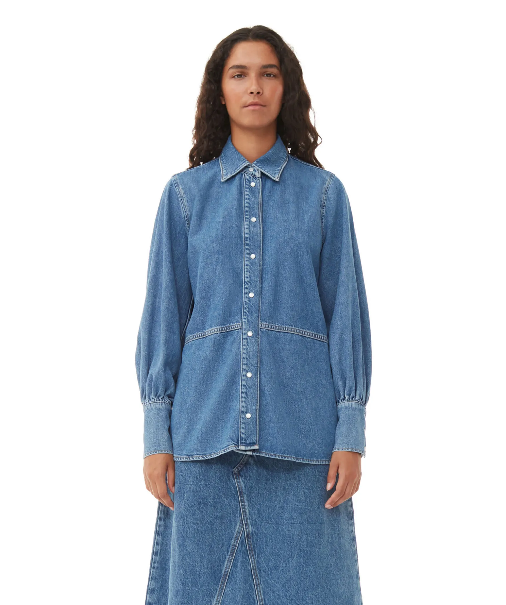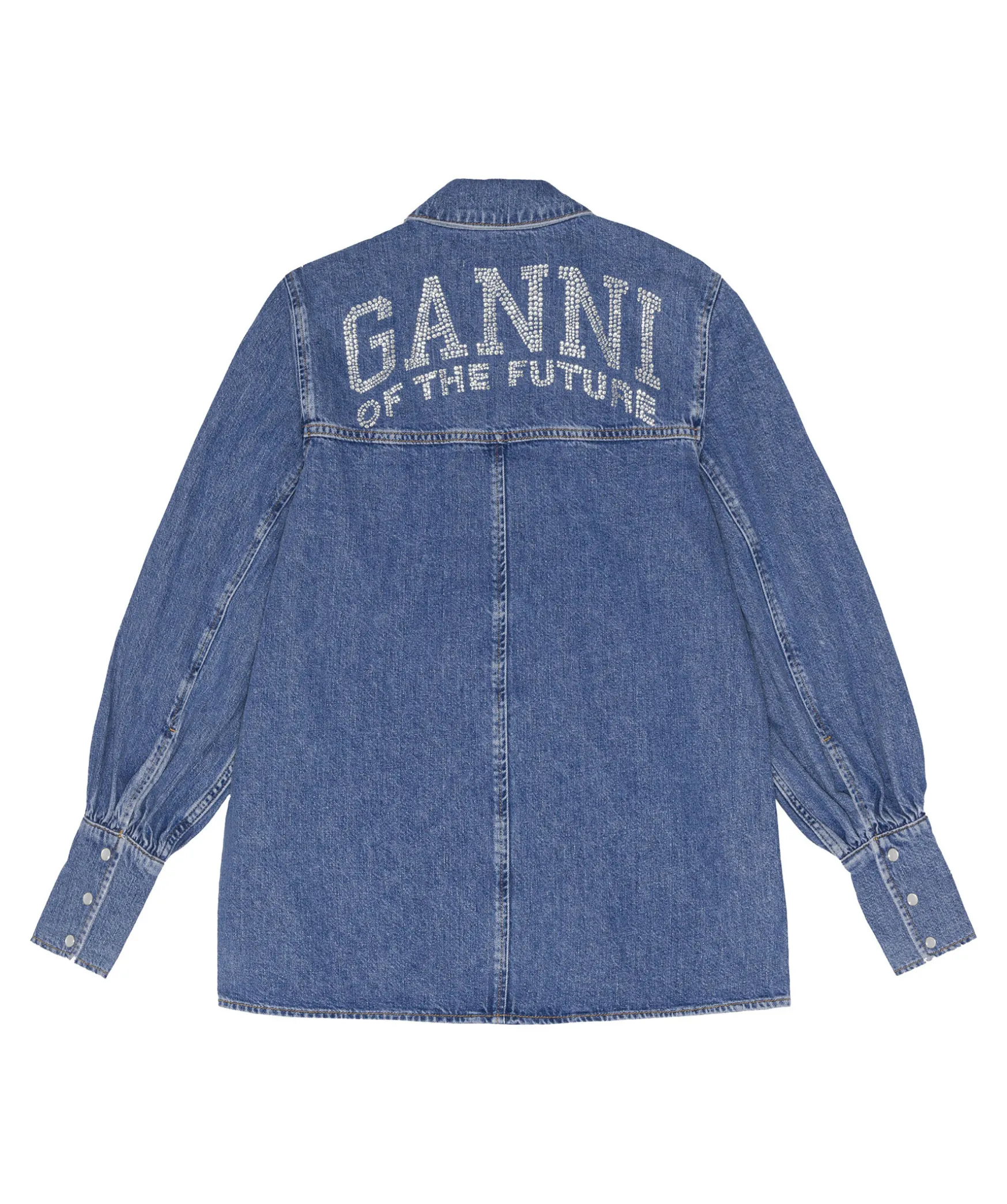 Denna Future Denim Skjorta Fran Ganni Ar Gjord Av En Blandning Av Tencel™ Lyocell-Fibrer Och Fibrer Gjorda Med Circulose®, Ett Material Skapat Av 100 % Atervunnen Textil. Skjortan Ar Designad For En Avslappnad Passform Och Har En Krage, Tryckknappsstangning, Langa Armar Med Tryckknappsmanschetter Och Ett Strasskonstverk Baktill.