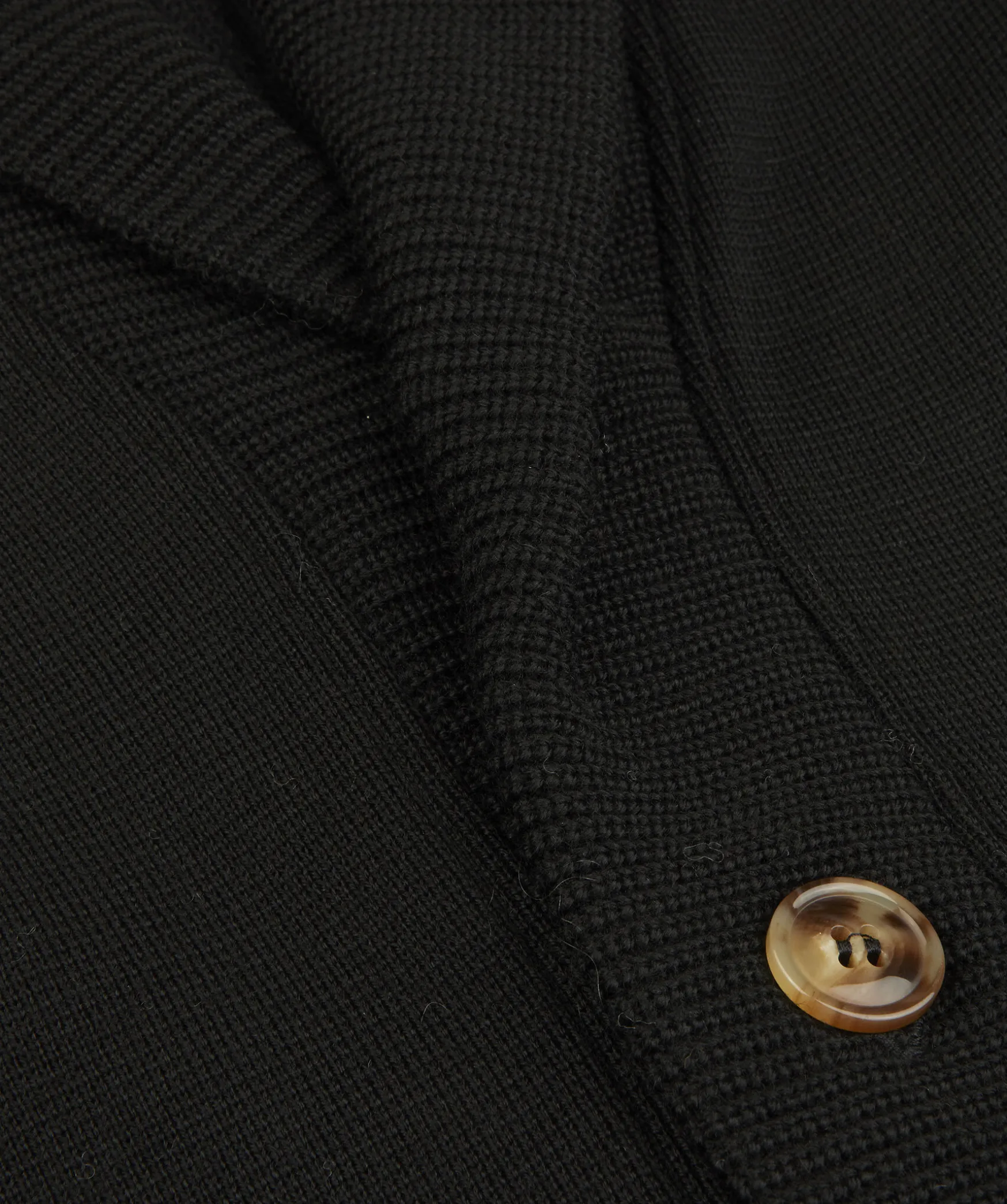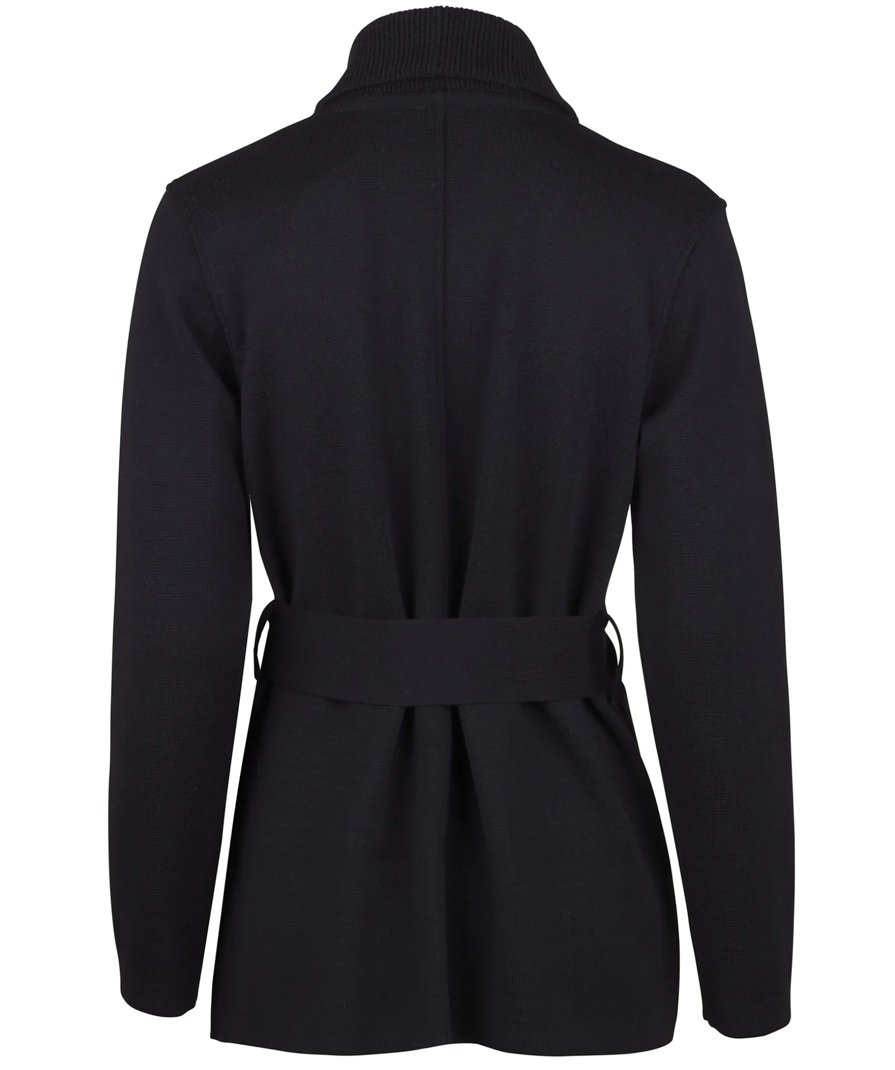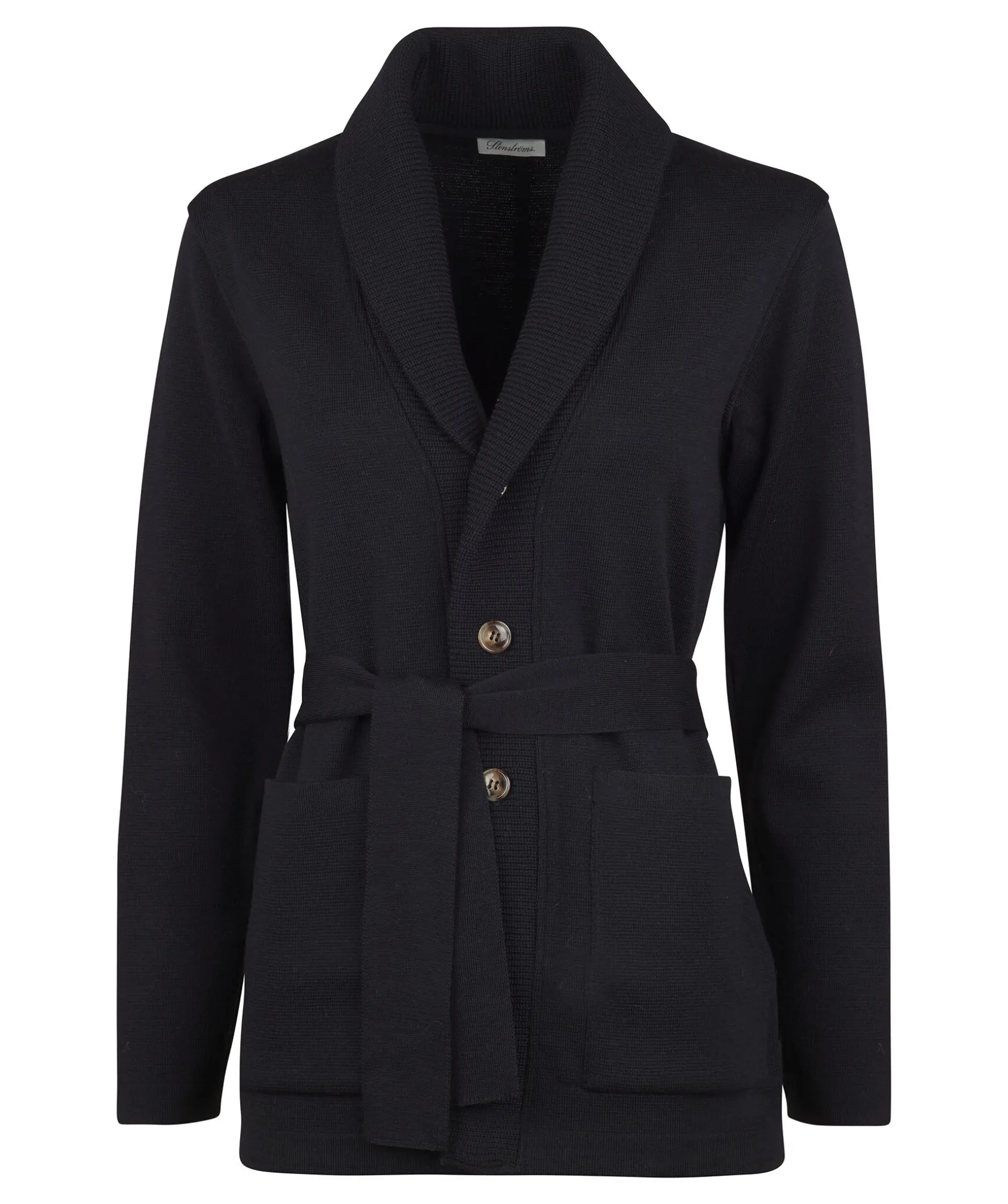 Svart, Stickad Cardigan Fran Stenstroms. Tillverkad I Merinoull. Tva Fickor Och Ett Balte I Midjan. Bruna Knappar.