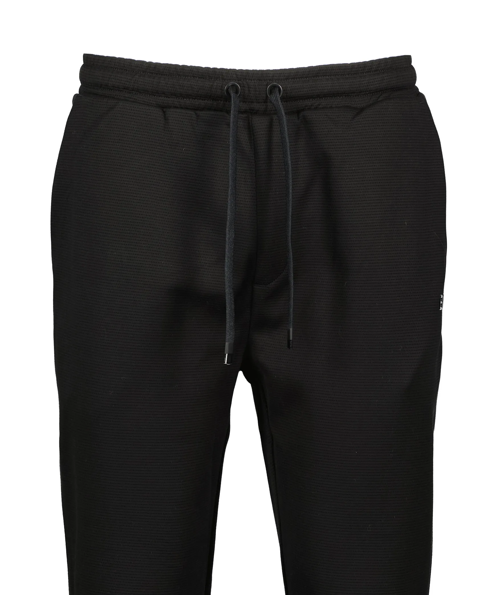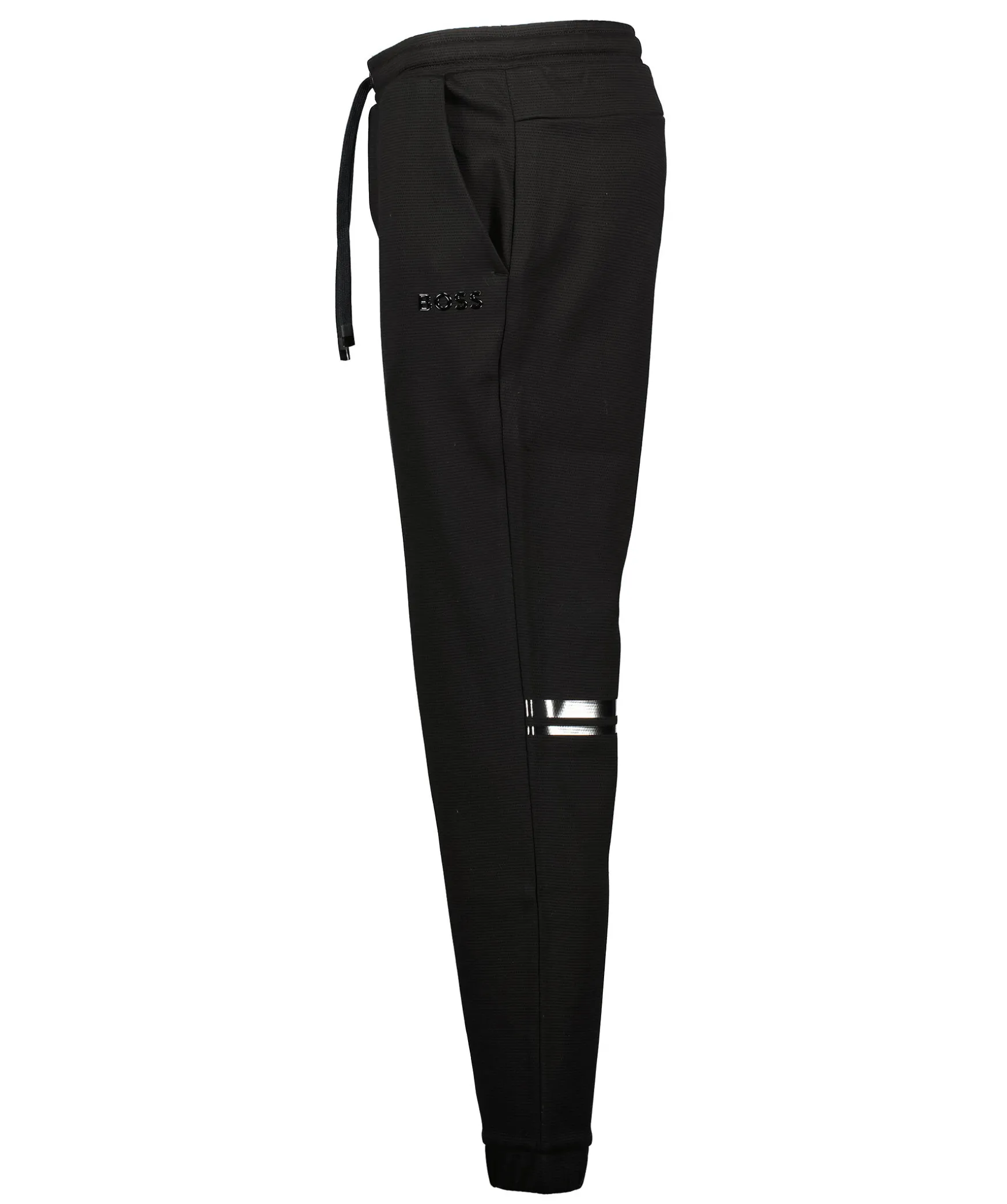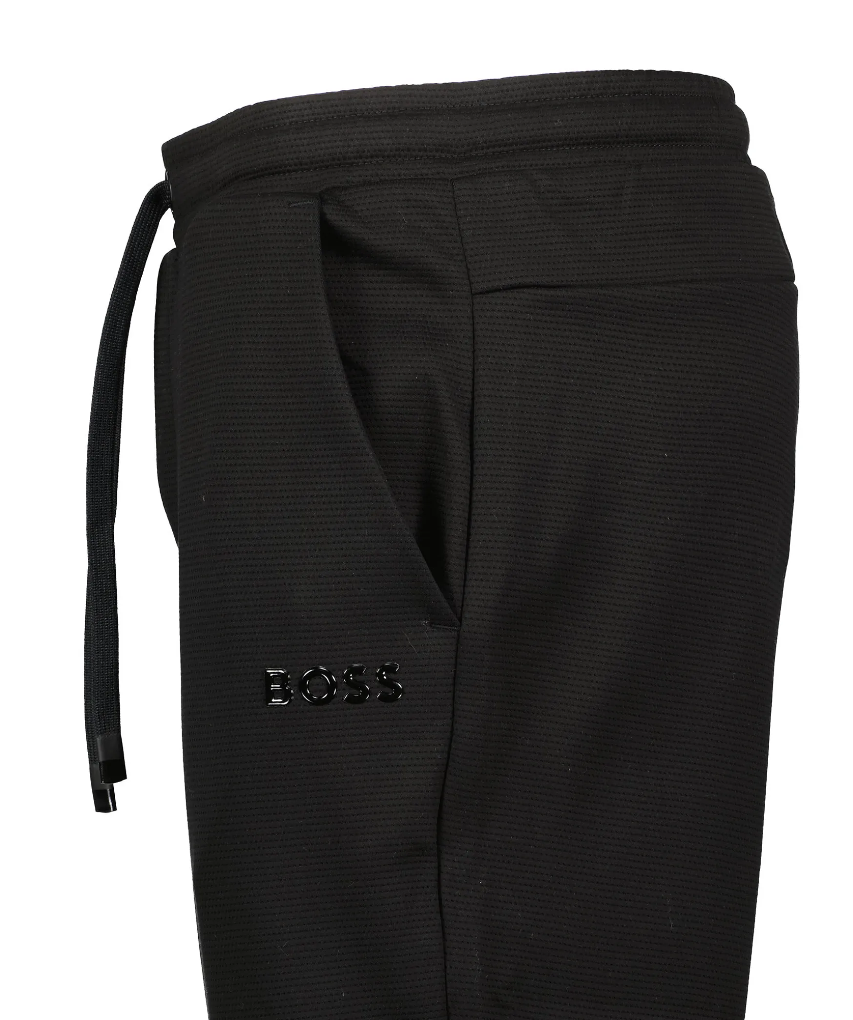 Svarta Mjukisbyxor Fran Boss Green. Tillverkade Av 100% Bomull. Dragsko I Midjan. Tva Sidfickor. Glansig, Praglad Logotyp Vid Vanster Ficka. Glansiga Horisontala Streck I Knavecken.